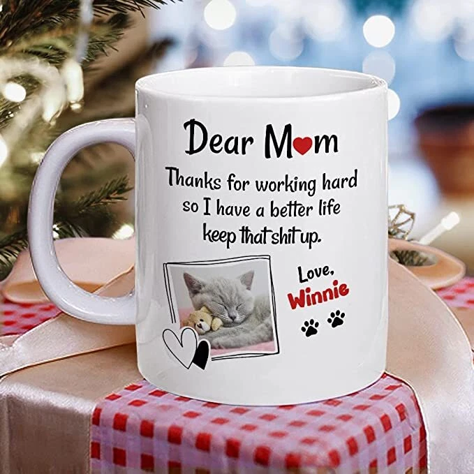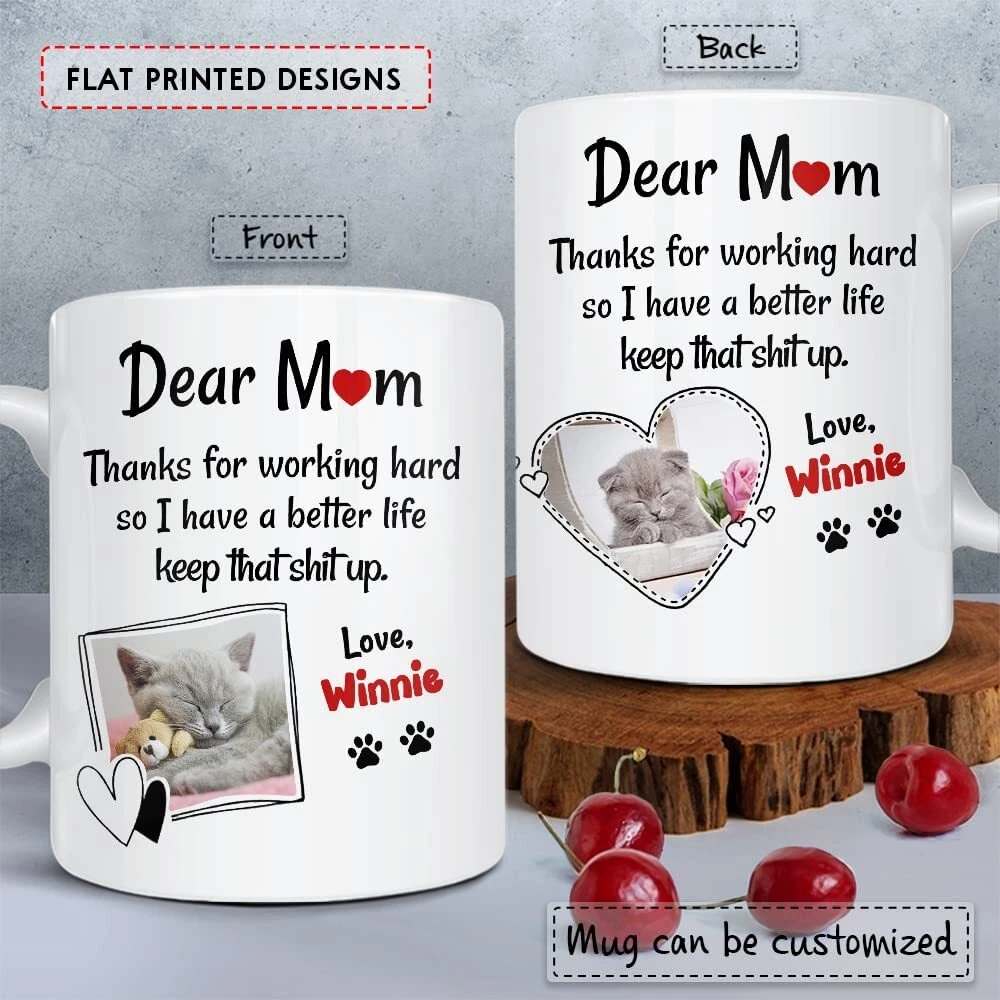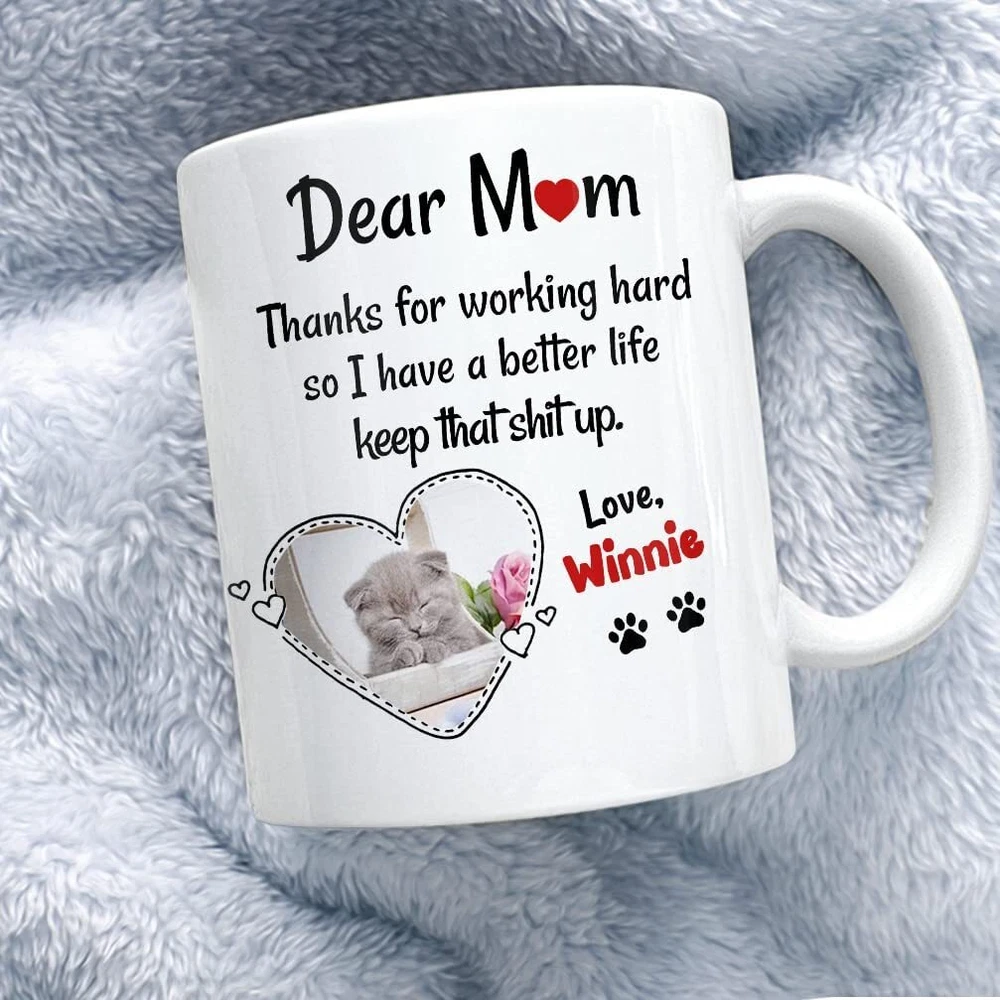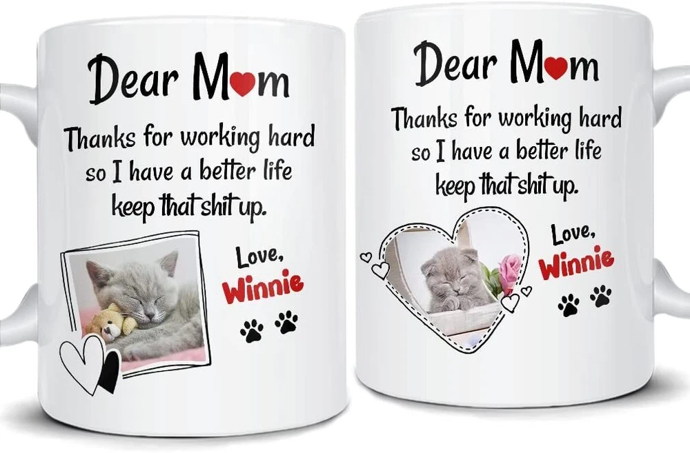 Personalized Mug For Cat Mom With Customize Photo And Cat Name Coffee Cup 11oz 15oz Gift For Woman Cat Moms On Mother Day Birthday Christmas Product Details.. This high quality 11oz. ceramic white mug has a premium hard coat that provides crisp and vibrant color reproduction sure to last for years. Perfect for all hot & cold beverages. The highest quality printing possible is used. It will never fade no matter how many times you wash it. Material: 100% Ceramic. Print both sides. Dishwasher and Microwave Safe. High Gloss + Premium White Finish. Printed in the U.S.A. Personalized & Custom. We support personalized and custom mug to add custom, when placing an order, you can add notes to the "order note" in shipping address section. Also you can contact us directly via message. Shipping Info. Ready to ship in 1 to 2 business days, All products are made-to-order and proudly printed in the United States. Shipped by USPS and DHL, You will receive your order in 5-7 days. Replace & Refund. All products are defective during shipping broken, chipped will be replaced free of charge. You are not satisfied with the product, we will refund 100% money to you. If any other issues arise, please do not hesitate to message, we would be more than happy to assist you.