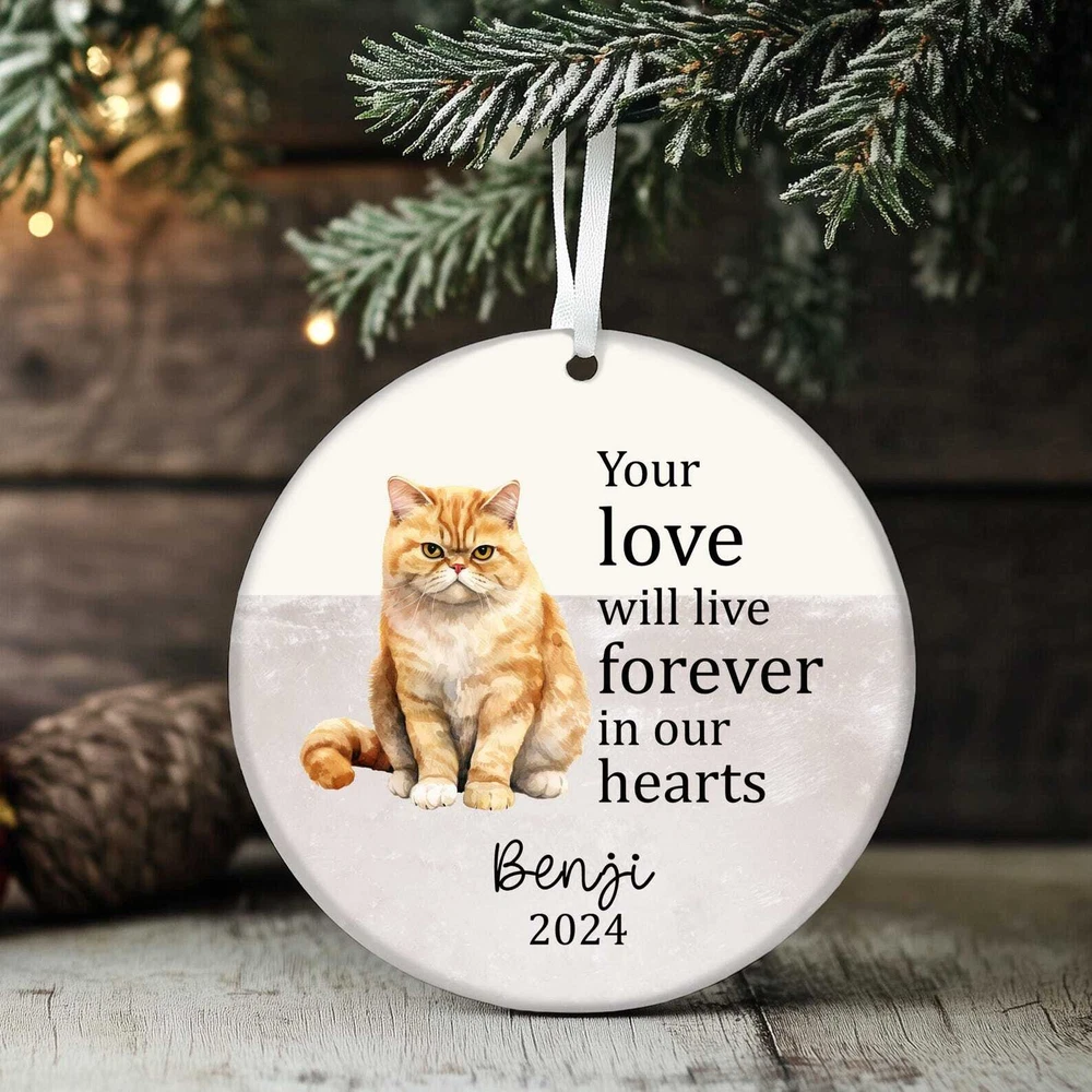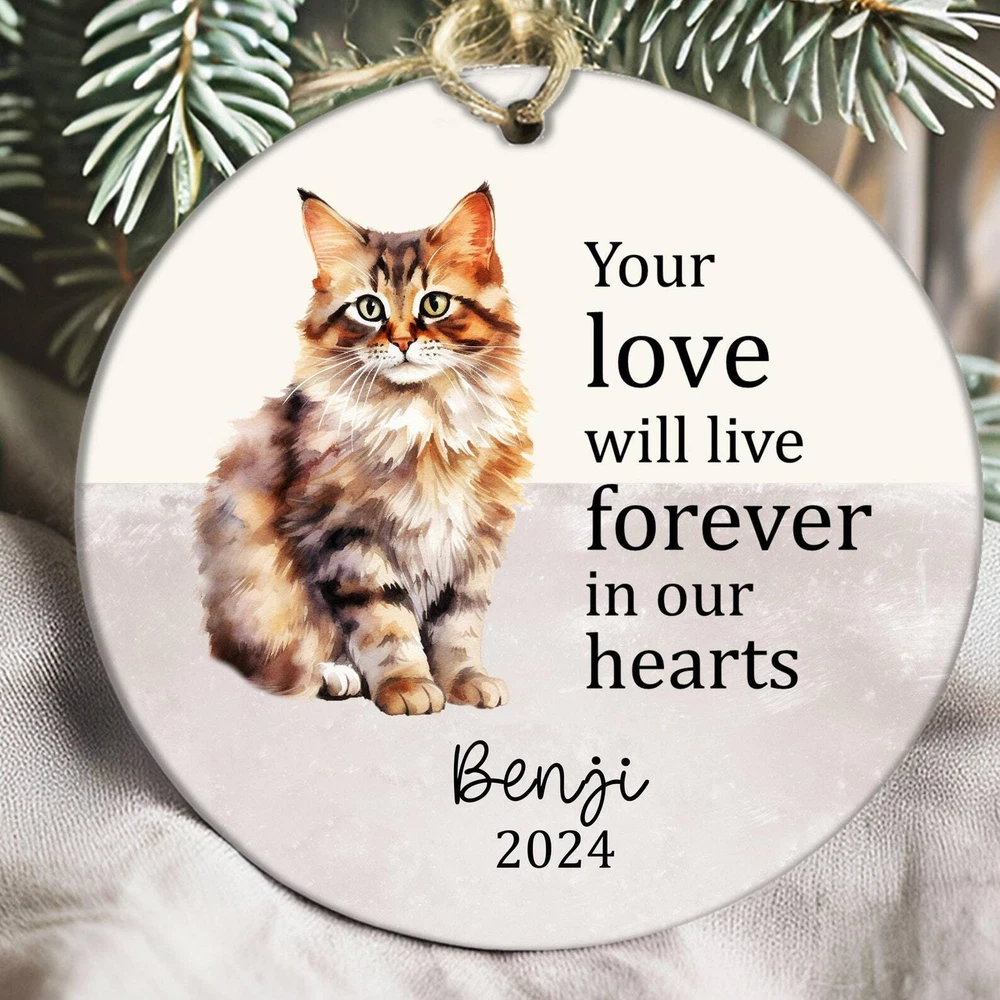 Personalized Pet Memorial Ornament Custom Cat Loss Gift Pet Memory Pet Remembrance Sympathy Gift Pet Loss Gift Pet Holiday Keepsake Material: Ceramic Color: White Shapes: Circle, star, heart and oval Can be printed on both sides Imprint full-color artwork, photos, or logos Hole for hanging string and hanging string included Printed in the USA