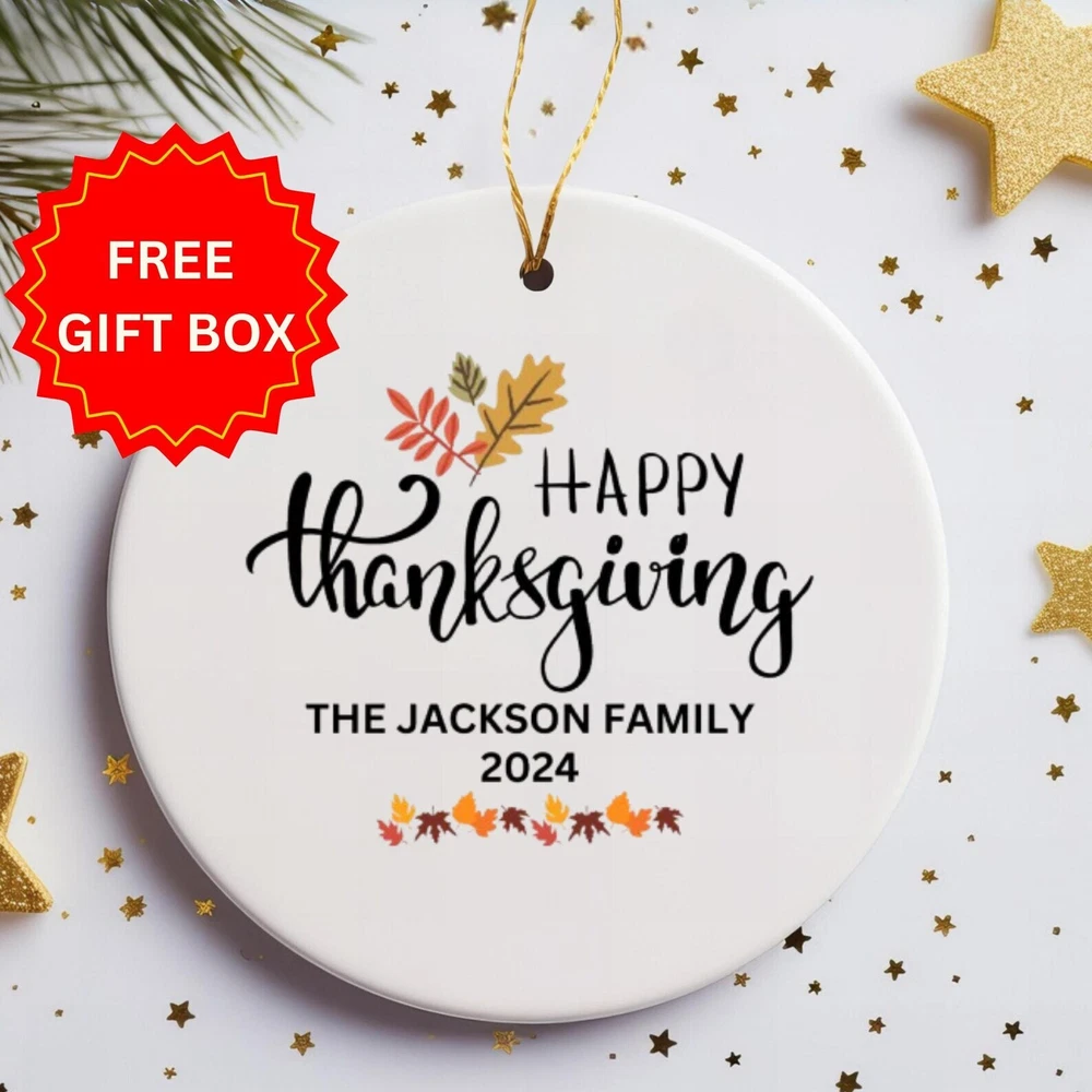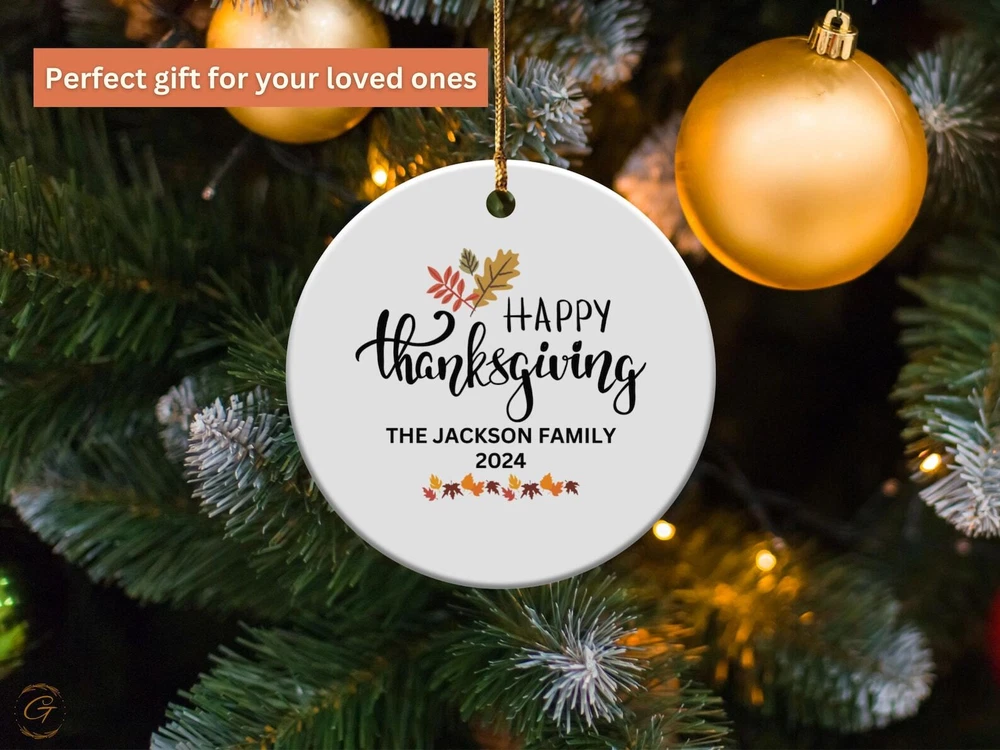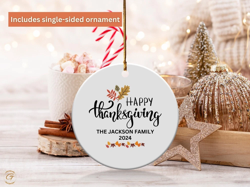 Personalized Thanksgiving Family Ornament Decoration 2024 Customized Family Gifts Holiday Keepsake Personalized Home Decor Holiday Gifts Material: Ceramic Color: White Shapes: Circle, star, heart and oval Can be printed on both sides Imprint full-color artwork, photos, or logos Hole for hanging string and hanging string included Printed in the USA