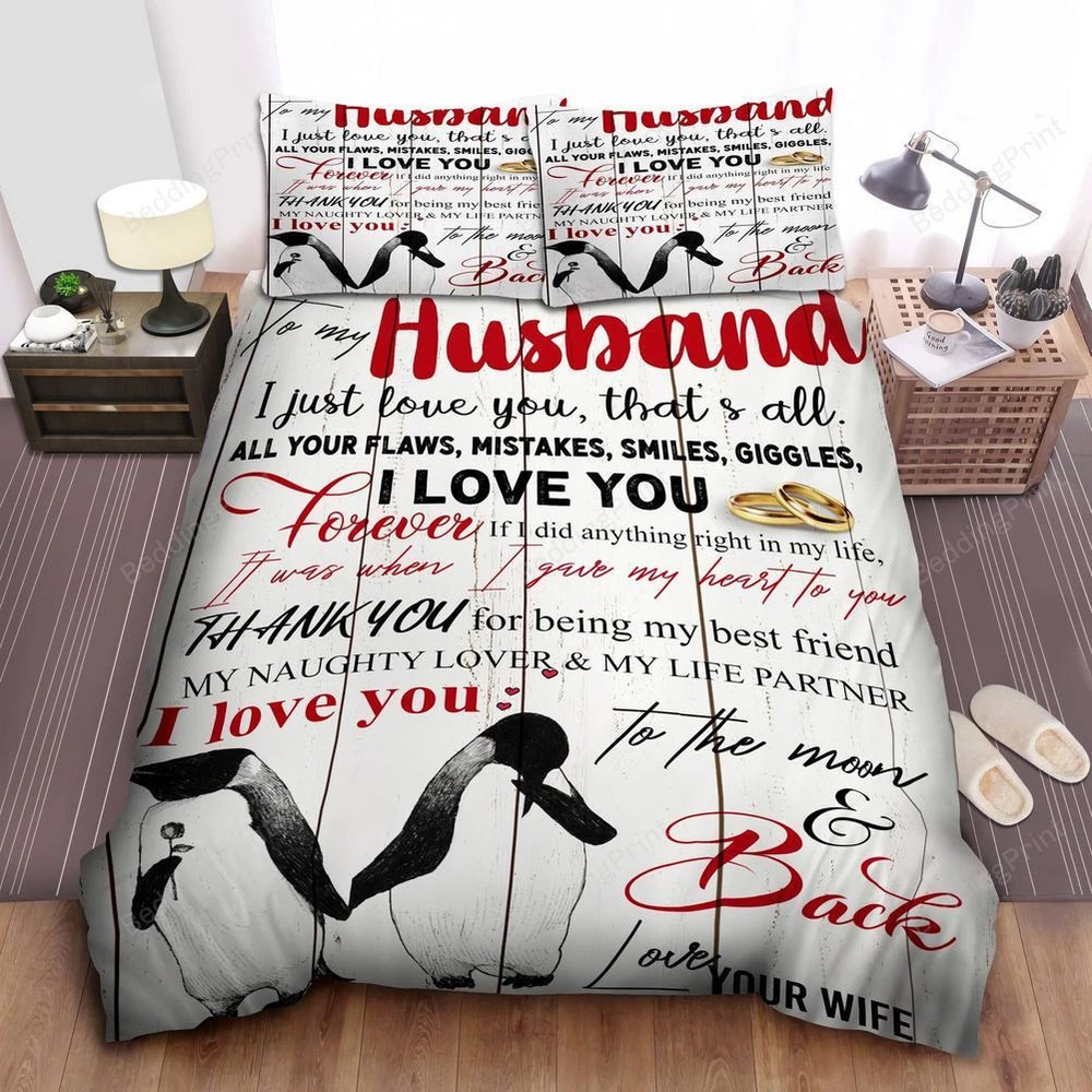Personalized To Husband Penguins From Wife I Love You Quilt Duvet Cover Set Size - Single: 1 x Quilt Cover (145*210cm) 1 x Pillowcases (50*75cm) Set DOES NOT include any INSIDE FILLERS AND ACCESSORIES. Size - Double: 1 x Quilt Cover (180*210cm) 2 x Pillowcases (50*75cm) Set DOES NOT include any INSIDE FILLERS AND ACCESSORIES. Size - Queen: 1 x Quilt Cover (210*210cm) 2 x Pillowcases (50*75cm) Set DOES NOT include any INSIDE FILLERS AND ACCESSORIES. Size - King: 1 x Quilt Cover (220*240cm) 2 x Pillowcases (50*75cm) Set DOES NOT include any INSIDE FILLERS AND ACCESSORIES. Size - Super King: 1 x Quilt Cover (240*270cm) 2 x Pillowcases (50*75cm) Set DOES NOT include any INSIDE FILLERS AND ACCESSORIES. Features: Function: Decorate Type: Duvet Cover Set Material: Polyester Model: Bedding Cover Set Shape: Rectangular Department: Adults,Baby,Children,Teens Character: Bedding Cover Set Product Line: Bedding Line Room: Any Room, Basement, Bedroom, Children's Room, Conservatory Care Instructions: Do not bleach Do not tumble dry Line dry without delay Warm machine wash separately before use