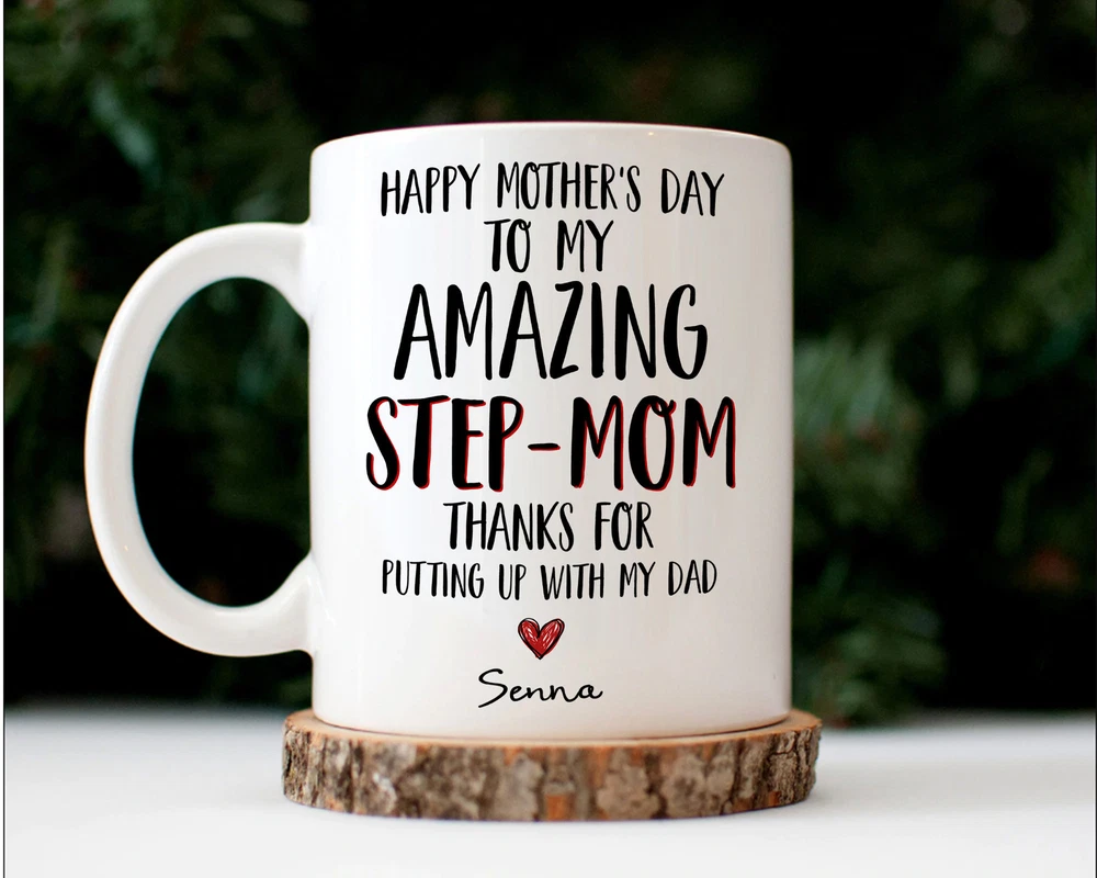 Personalized To My Amazing Stepmom Mug Funny Stepmom Coffee Mug Stepmom Product Details.. This high quality 11oz. ceramic white mug has a premium hard coat that provides crisp and vibrant color reproduction sure to last for years. Perfect for all hot & cold beverages. The highest quality printing possible is used. It will never fade no matter how many times you wash it. Material: 100% Ceramic. Print both sides. Dishwasher and Microwave Safe. High Gloss + Premium White Finish. Printed in the U.S.A. Personalized & Custom. We support personalized and custom mug to add custom, when placing an order, you can add notes to the "order note" in shipping address section. Also you can contact us directly via message. Shipping Info. Ready to ship in 1 to 2 business days, All products are made-to-order and proudly printed in the United States. Shipped by USPS and DHL, You will receive your order in 5-7 days. Replace & Refund. All products are defective during shipping broken, chipped will be replaced free of charge. You are not satisfied with the product, we will refund 100% money to you. If any other issues arise, please do not hesitate to message, we would be more than happy to assist you.