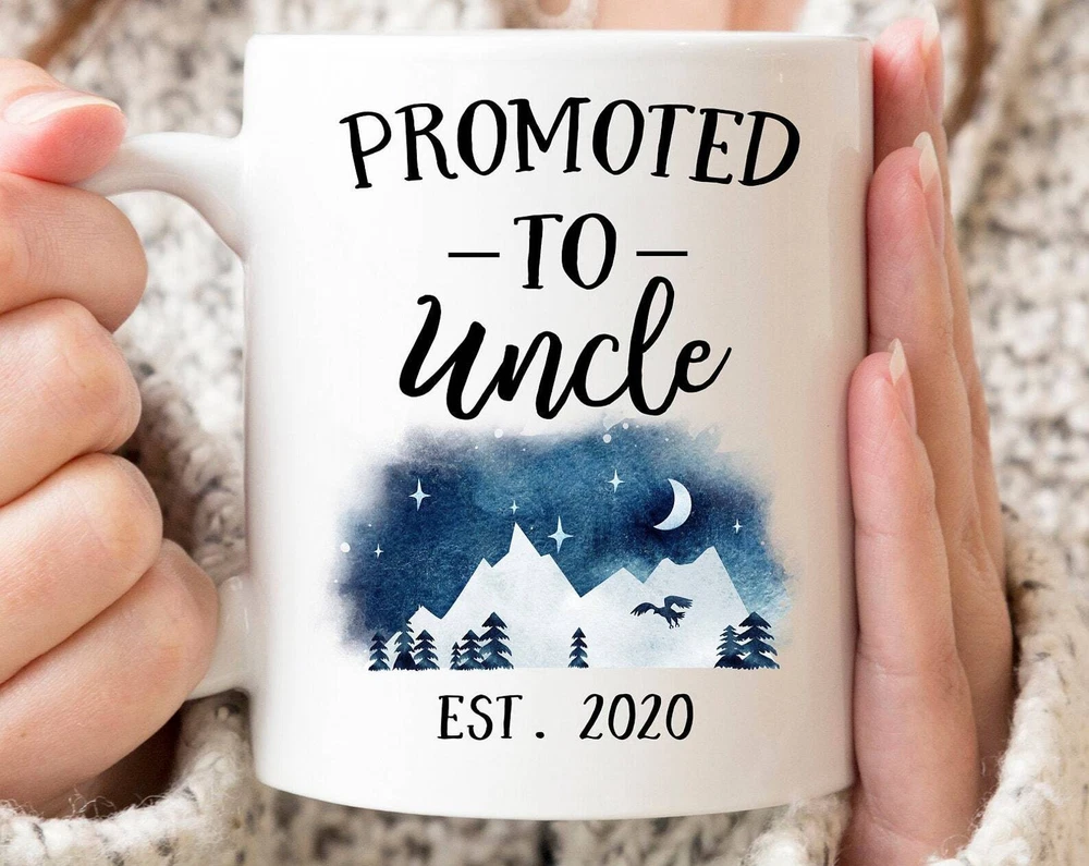 Personalized Uncle Mug Promoted To Uncle Pregnancy Reveal New Uncle Gift New Product Details.. This high quality 11oz. ceramic white mug has a premium hard coat that provides crisp and vibrant color reproduction sure to last for years. Perfect for all hot & cold beverages. The highest quality printing possible is used. It will never fade no matter how many times you wash it. Material: 100% Ceramic. Print both sides. Dishwasher and Microwave Safe. High Gloss + Premium White Finish. Printed in the U.S.A. Personalized & Custom. We support personalized and custom mug to add custom, when placing an order, you can add notes to the "order note" in shipping address section. Also you can contact us directly via message. Shipping Info. Ready to ship in 1 to 2 business days, All products are made-to-order and proudly printed in the United States. Shipped by USPS and DHL, You will receive your order in 5-7 days. Replace & Refund. All products are defective during shipping broken, chipped will be replaced free of charge. You are not satisfied with the product, we will refund 100% money to you. If any other issues arise, please do not hesitate to message, we would be more than happy to assist you.
