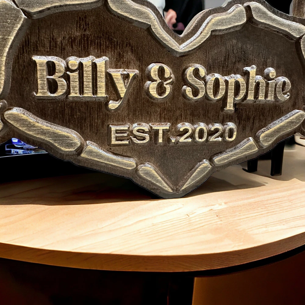 This amazing couple name sign would make a great gift for your boyfriend or girlfriend! This custom wooden sign is a unique and simple idea for an anniversary or Valentine's Day present. It's also a cute addition to your home decor. Plus, it's handmade in the USA by a small business located in East Texas. The sign measures 21 inches by 10 inches, so it's the perfect size for any room. The raised lettering creates an appealing 3D effect that adds depth and character to the piece. Please note that the lettering is a natural wood color. Each piece of wood is unique. The wood grain will be different and the stain may vary slightly but you are sure to get a beautiful one-of-a-kind piece. If you have any specific requests that are not listed, please feel free to message us and we will do our best to accommodate your needs.