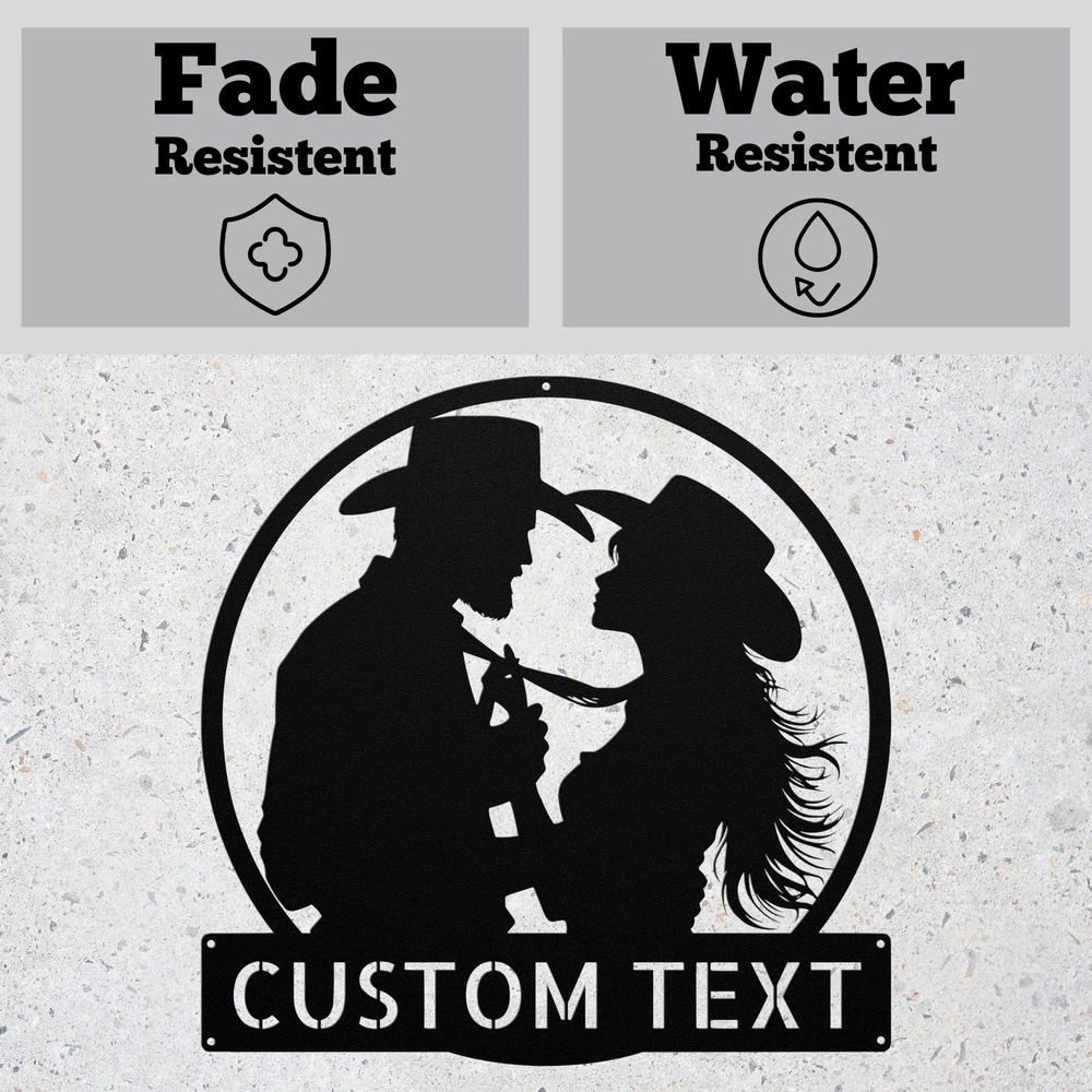 Product Description Personalized Western Couple Metal Sign Custom Rustic Decor Home Wall Art Gift Transform your space with this stunning Personalized Western Couple Metal Sign . Made from high-quality 16 gauge metal, this rustic decor piece is perfect for adding a unique touch to your home or office. Its durable powder coating ensures it’s resistant to dust, weather, and water, making it suitable for both indoor and outdoor use. Whether you’re looking for a thoughtful gift for Christmas, a birthday, or any special occasion, this personalized sign is sure to impress. It’s a wonderful way to celebrate love and companionship, or you can keep it for yourself as a charming addition to your decor. Key Features: Customizable Design : Personalize with names or initials for a unique touch. High-Quality Material : Made from durable 16 gauge metal for lasting beauty. Weather Resistant : Powder-coated finish protects against dust, rain, and sun. Versatile Decor : Ideal for both indoor and outdoor display. Perfect Gift : Great for weddings, anniversaries, holidays, or just because! Bring a touch of western charm to your life with this beautiful metal sign. It’s more than just decor; it’s a piece of art that celebrates special moments and makes any space feel like home. Order yours today! Service and Color Choice Our metal signs are designed to be personalized just for you, making them the perfect addition to any space! The default color for our signs is Black , but we also offer a variety of beautiful options including Copper, Gold, White, and Silver . After placing your order, simply contact us with your preferred color choice, and we'll ensure your sign is exactly how you envision it. Let’s create something special together!