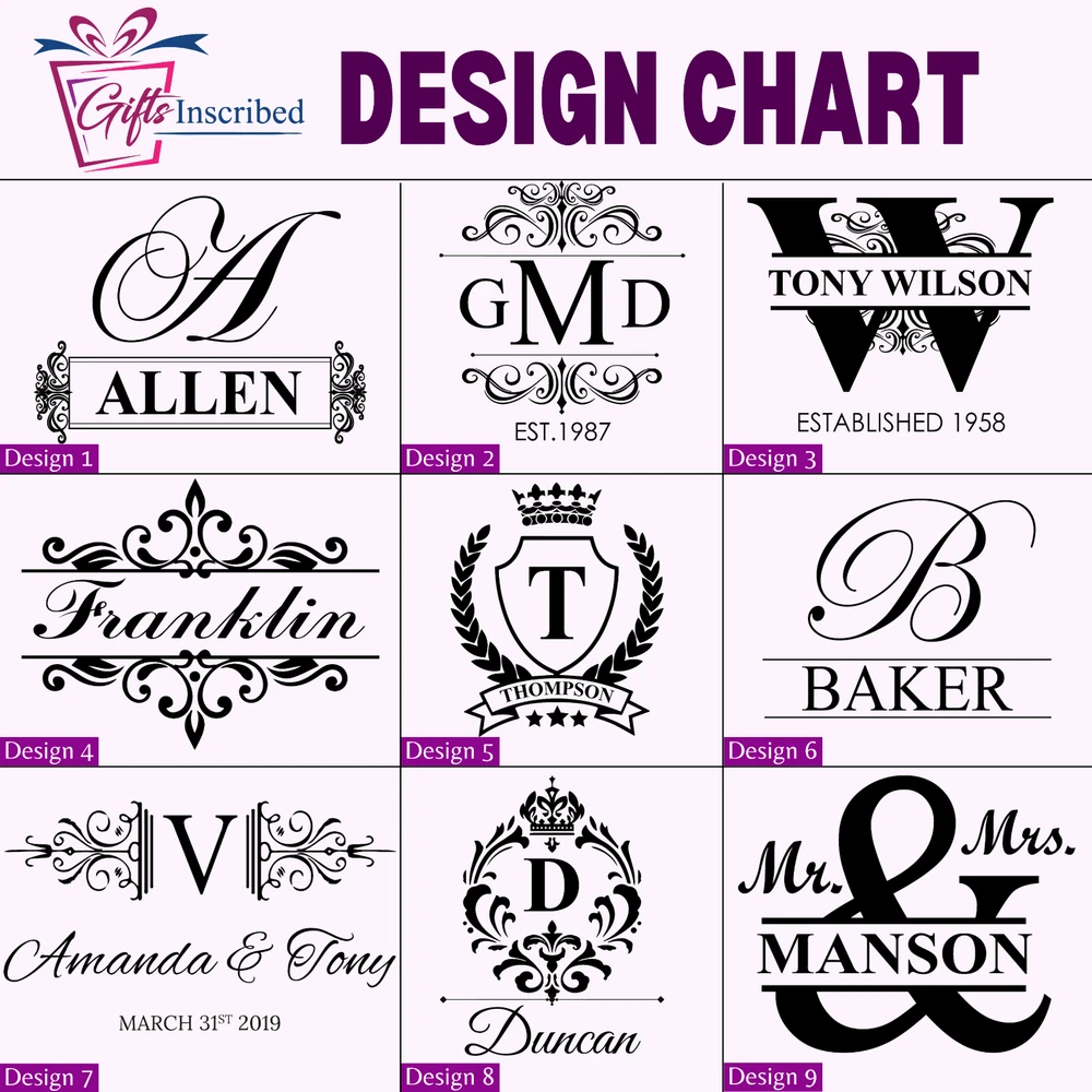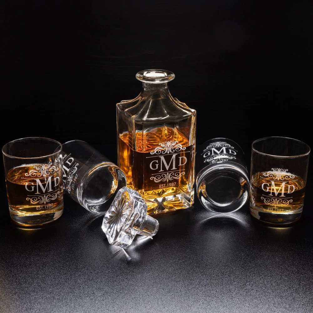 Our Gifts Inscribed premium whiskey decanter sets with whiskey glasses gift includes a vintage whiskey decanter with stopper and whisky glass set of 2 or 4 whisky glasses, personalized with the design & name of your choice. The whiskey drinking glasses set is designed to help enhance the aroma and drinking experience of any liquor. Choose from 9 designs for your whisky decanter and drinking glasses set. Add personalization and we’ll custom engrave your designs on the liquor decanter & double old fashioned glasses gifts for men. Engrave your whiskey decanter vintage and glass cup set for a unique whiskey gift set perfect for events like weddings, birthdays, anniversary, groomsmen, retirement, or as a housewarming present. The bourbon decanter bottle and scotch glasses make a great addition to any kitchen or barware set. ENGRAVED WHISKEY GLASSES GIFT - Create lasting memories and enjoy the ultimate drinking experience with the personalized decanter glass and glass cup set. WHISKEY GLASS SET - Our glasses drinking set is made of high-quality crystal glass that is durable and keeps the liquor insulated at the perfect temperature for longer. The rum glass glassware set holds 11.2 oz capacity of your favorite liquors. GLASS WHISKEY BOTTLE DETAILS - The liquor bottle glass design enhances the aroma of any spirit including rum, bourbon, scotch, tequila, wine, and more. The whiskey tumbler glass decanter holds 750 ml of liquor, has a glass stopper and features a sleek, non-faceted glass that provides the perfect blank slate for etching and customization to your custom whiskey tasting glasses. CUSTOM WHISKEY GLASS - Select your design and personalize your name, initial, & date to create a one-of-a-kind glass whisky bottle set laser engraved gift. The decanter glass and whiskey tumbler set engraving is permanent, dishwasher safe and lead-free. WHISKEY GIFTS FOR MEN – The set of lowball glasses and decanter whisky are the perfect long-lasting keepsake for events such as weddings, birthdays, anniversary, groomsmen gifts, fathers day, mothers day, or retirement present. Nice addition to any bar glasses set. Enhances the taste and drinking experience of whisky, bourbon, scotch Great for having drinks neat or on the rocks Perfect gift for him, wedding, anniversary, birthday, and more HIGH QUALITY GLASS High quality crystal glass Personalized laser engraving included Whiskey glasses holds 11.2 oz of liquor Whiskey decanter holds 26 oz or 750 ml of any liquor Heavy base, lowball glass shape Dishwasher safe