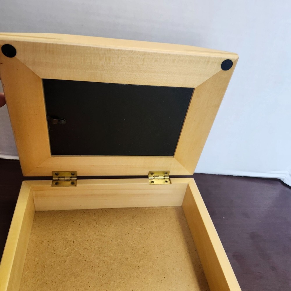 This wooden keepsake box offers a dual-purpose design with a picture frame lid. Ideal for storing small valuables or mementos. • Wooden construction • Hinged lid with picture frame (fits 4" x 6" photo) • Felt-lined bottom • Dimensions: 11" x 8" x 3" Wood has minor scuffs on the lid.