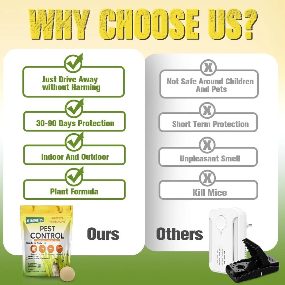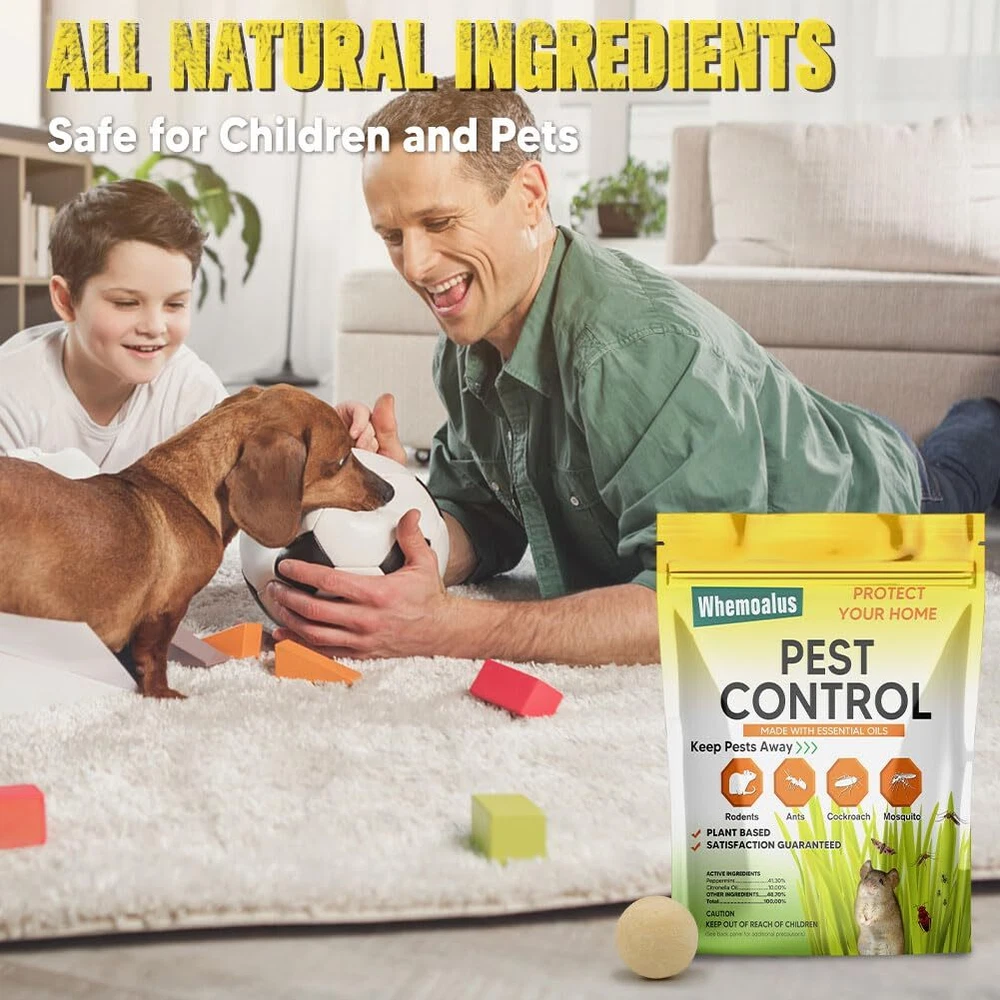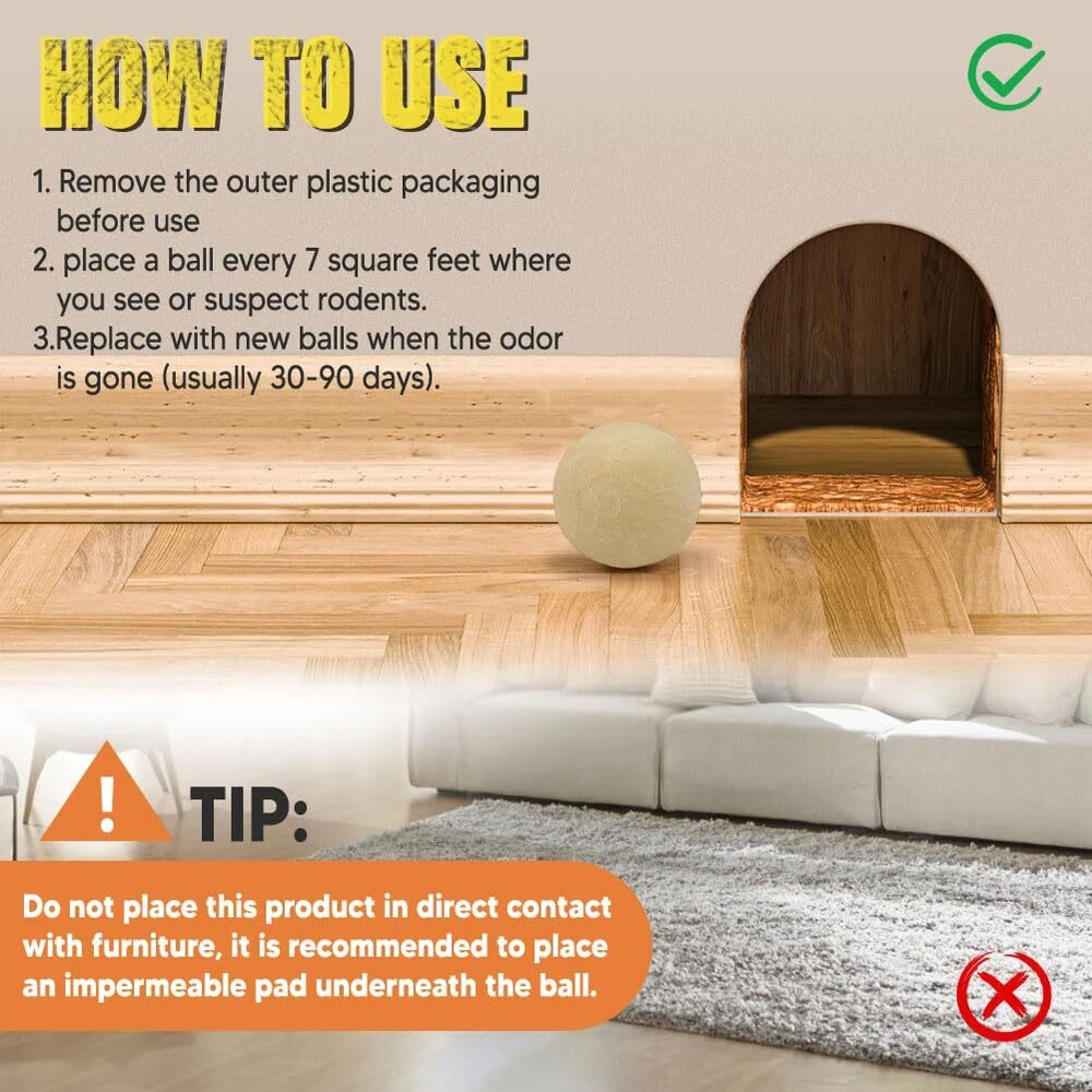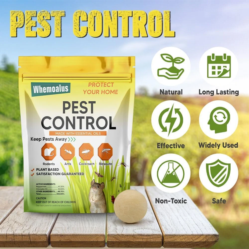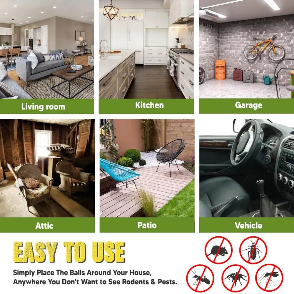 This PEST REPELLENT BALL is twice as effective as any other products. Formulated with a high-strength ingredients, our pest repellent balls create a strong barrier against rodents, spiders, roaches, ants, moths, and more, effectively keeping them out of your property. The small, lightweight design allows you to place the pest repellents balls discreetly in any area, and they start working immediately, releasing a pleasant scent while keeping pests at bay effortlessly. Each pack covers up to 120 sq ft for 1-3 months, effectively repelling all types of pests. EFFECTIVE PEST REPELLENT BALLS - This pest repellent is twice as effective as any other products. Formulated with a high-strength ingredients, our pest repellent balls create a strong barrier against rodents, spiders, roaches, ants, moths, and more, effectively keeping them out of your property. FAST ACTING - The formulate in this repellent smell great to people, but are highly irritating to pests. These mice repellent balls work quickly to repel rodents and pests, offer peace of mind for your home or business. EASY TO USE - Simply place the pest repeller balls in enclosed areas to repel spiders, rats, mice, silverfish, roaches, ants, and a variety of other pests. LONG LASTING PROPERTY PROTECTION - Each pack covers up to 120 sq ft for 1-3 months, effectively repelling all types of pests. Use them in basements, attics, pantries, cabins, garages, sheds, vehicles, and more for efficient protection. SAFE FOR HUMANS & PETS - Made with natural ingredients, these mouse repellent balls are safe for humans, pets, fruits, vegetables, and the environment when used as directed. Enjoy protection in a safe and eco-friendly manner.