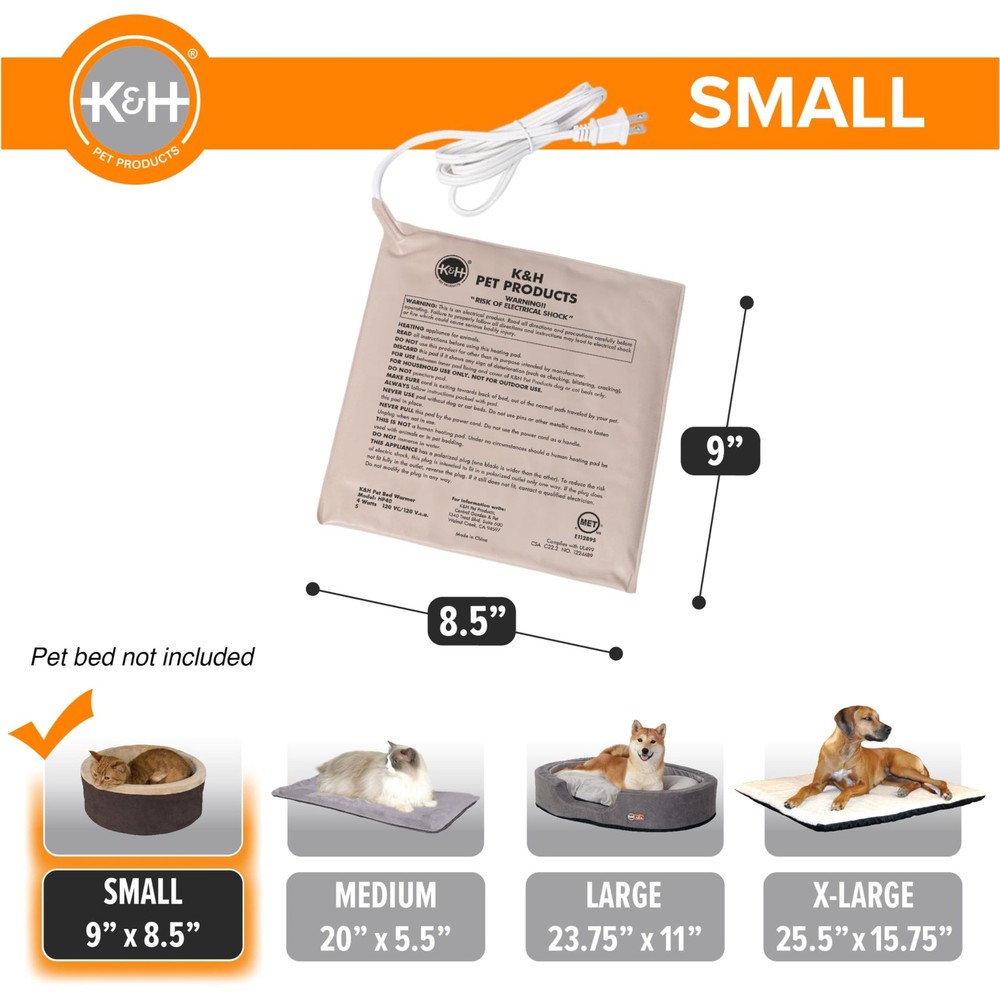 CAT CALMING TEMPERATURE: This safety listed low wattage thermostatically controlled cat bed warmer automatically adjusts to the purr-fect temperature for pets, unlike human warmers that can harm pets; it's the cat melatonin for cat beds PET BED WARMER USE: Simply insert the waterproof pet heating pad into your pet's favorite dog bed or cat bed to create a pet warming oasis; the small is the perfect cat accessory for round cat beds, cat couches, cat caves, or any small dog bed AUTOMATIC HEAT CONTROL: The heated pet warmer is thermostatically regulated to automatically adjust to your pet's natural body temperature when they are in the bed, and stays slightly above the ambient air temperature when the bed is empty SIZE & ENERGY-EFFICIENT: K&H Small Pet Bed Warmer measures 9" x 8½", making it perfect for small pet beds, and it uses only 4 watts of power, ensuring low energy consumption while providing cozy warmth for your pet SAFETY LISTED: K&H products are safety certified, providing peace of mind with electrical safety standards that go beyond UL safety requirements; we don't just use safety-listed parts, we safety certify the entire product, ensuring unparalleled safety COLORADO BRAND YOU TRUST: Designed by K&H with over 25 years of experience in creating safe, innovative, quality products for pets, ensuring safe reliability and top-tier craftsmanship for pet parents IMPORTANT: ALWAYS place inside a pet bed; It is recommended to have a minimum of ¼ inch of padding between your pet and the warmer; if your padding is too thick or not breathable (such as towels / heavy blankets), the bed surface may not get warm
