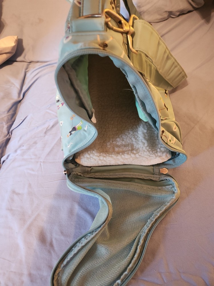 Great condition. Approx. 16 inches across. This Pet Carrier Shoulder Bag / Backpack is perfect for carrying your furry friend wherever you go. It can accommodate small dogs and cats of size S or under. The backpack carrier is durable and comes with a comfortable strap that can be adjusted to fit your body type. it can be worn as a backpack or shoulder bag carrier. It also has a zippered mesh window that ensures your pet can breathe easily, with zippered compartments to store their food and belongings.