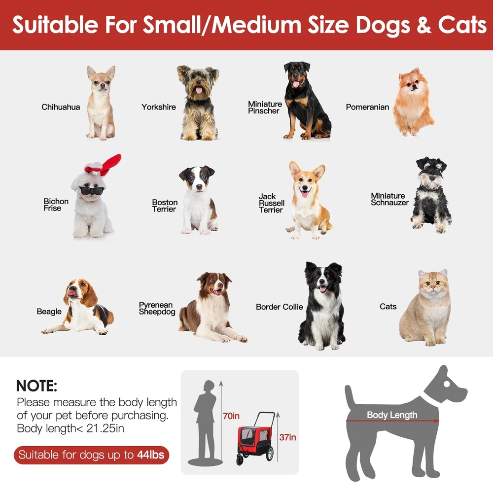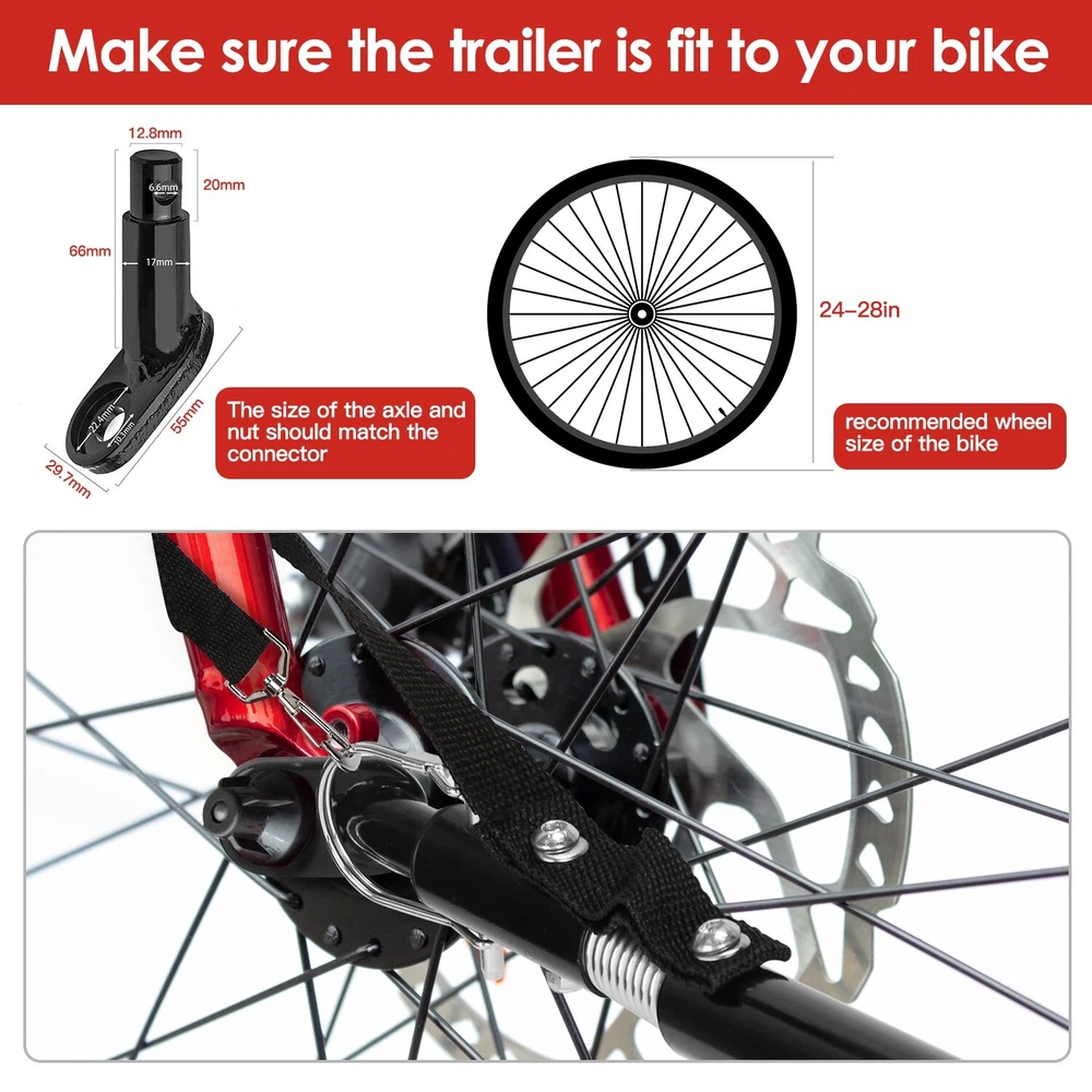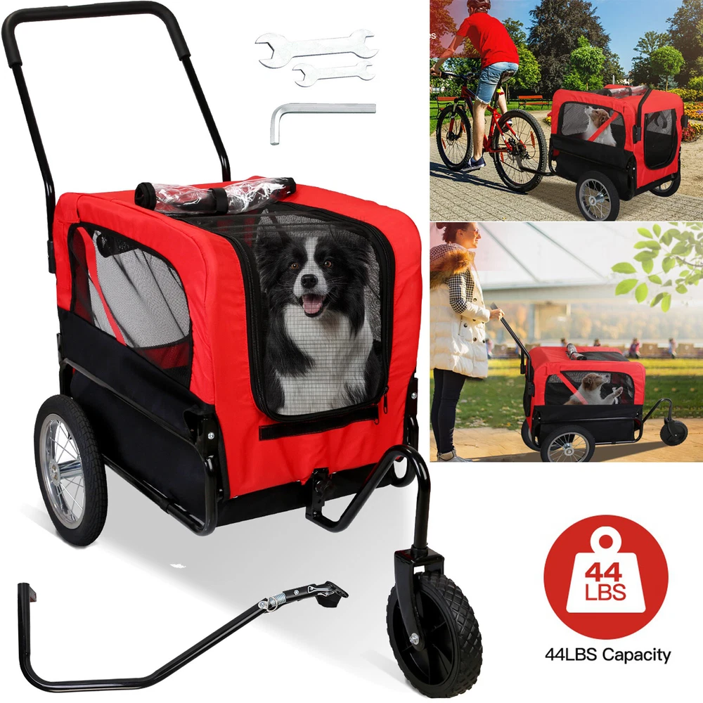 Pet Bike Trailer And Stroller with Canopy Bicycle Carrier Bicycle Cargo Featured Item Product Detail Image Gallery Product Description Overview: Do you want to take your furry friend for a new, far outdoor adventure? Our 2-in-1 pet bicycle trailer with cargo bin size of 16.53x23.22x19.29in provides your pet spacious room and safe experience. Designed with front and back entrance with double zippers, allow your pet to easily access, plastic cover on the front door keeps rain, snow, debris and dust away. Both sides of mesh window ensure great air ventilation and keep your dog cool. Besides, the anti-skin and durable wheels enable smooth movement on different floors. Constructed with solid iron structure and wear-resistant oxford cloth, this pet trailer can hold up to 44lbs capacity, suitable for small and medium sizes of dogs and cats. Features: 2-in-1 Pet Trailer & Stroller: With cargo bin size of 16.53x23.22x19.29in,this 2-in-1 pet trailer & stroller offers spacious room for your pets. Quick-release front wheel and drawbar allow you to easily change its form by screwing out,making it a perfect companion for camping,hiking,walking or riding. Take your furry friends for an outdoor adventure now! Easy Entry & Great Ventilation: Designed with double entrances on the front and back of bin,help your pets easily access. Additional roll-up plastic cover on the front entrance keeps dust and debris out during riding,while both sides of mesh windows ensure great ventilation effect and let you dogs enjoy admiring views of outside. Smooth Durable Wheels: The 7.48in diameter rear wheels are sturdy and anti-skid,enable smooth movement on grass,sand and gravel road when you're on the go. The 360° swivel 7.08in front wheel and comfortable grip handle make your every turn of direction with high proficiency. Solid Construction: Made of durable iron tube frame with anti-rust coating,this bicycle trailer can hold items up to 44lbs,suitable for medium size of dogs or multiple small figures of dogs and cats. The reflected flag can alert people from different angles,provide your pets with full-range of protection. Quick Connection To Most Bikes: Equipped with solid connectors and hanging hooks,this pet bicycle trailer can be easily connected to any bikes with the rear axle of a 24"-29". The belts on the bottom of cargo bin secure it in place steadily when in motion. Specifications: Brand: iMounTEK Product Type: Pet Bike Trailer & Stroller Material: 600D Oxford Cloth, Iron, Plastic Color: Red Load Bearing Capacity: 20kg/44lbs Front Wheel Size: 3.5x18x18cm/1.37x7.08x7.08in Rear Wheel Size: 4x19x19cm/1.57x7.48x7.48in Cargo Bin Size: 42x59x49cm/16.53x23.22x19.29in Item Size(With Armrest): 94x135x42cm/37x53.14x16.53in Item Size(With Drawbar): 120x65x42cm/47.24x25.59x16.53in Item Weight(With Armrest): 8.1kg/17.85lbs Item Weight(With Drawbar): 8.5kg/18.73lbs Package Size: 67x25x48cm/26.37x9.84x18.89in Package Weight: 10.55kg/23.25lbs Package Contents: 1x Bicycle Trailer Frame 2x Rear Wheels 1x Front Wheel 1x Armrest 1x Drawbar 1x Flag 1x Supportive Rod 2x Wheel Axles 2x Wheel Axle Nuts 1x Drawbar Fixed Screw 2x Screws 1x Screwdriver 2x Wrenches 1x User Manual Terms & Conditions Thank you for your business ! On Sep 5, 2024 at 01:28:40 PDT, seller added the following information: