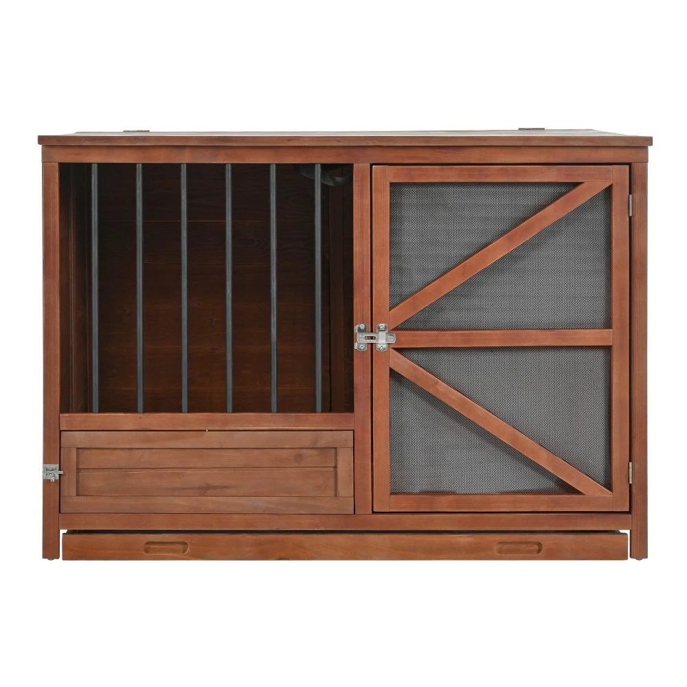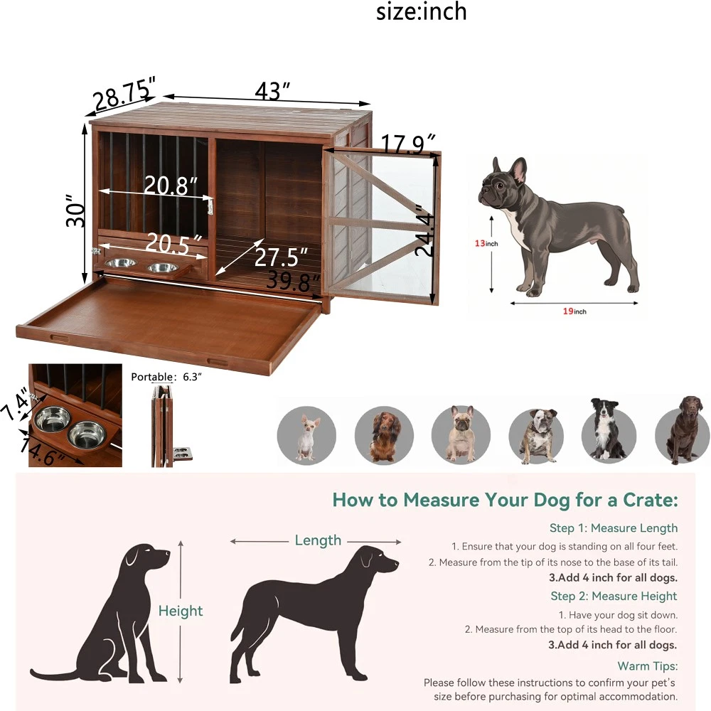 🌟 1 YEAR WARRANTY & 30-DAY FREE RETURN 🌟 We stand behind our products! Enjoy a 1-year manufacturer's warranty for worry-free purchase, and 30-day free return/exchange service if you're not completely satisfied. Your satisfaction is our top priority! Product Overview Upgrade your pet's living space while enhancing your home decor with our Solid Wood Dog Crate Furniture. Designed as a 2-in-1 solution, it functions as a cozy retreat for your small to medium-sized dog and a stylish end table that blends seamlessly with your living room, bedroom, or hallway furnishings. Crafted from high-quality solid wood, it’s sturdy, safe, and packed with user-friendly features to make pet care easier than ever. Available Sizes & Specifications 1. 33" Solid Wood Dog Crate (Walnut) Category Details Material 100% Solid Wood (Walnut), Pet-Safe Non-Toxic Finish Assembled Dimensions 33.00" L x 24.25" W x 20.00" H Assembled Weight 29.74 LBS Packaging Dimensions 35.11" L x 26.00" W x 8.73" H Packaging Weight 37.26 LBS Interior Space 29.5" (Spacious for Small Dogs) Table Weight Capacity 132 LBS 2. 43" Solid Wood Dog Crate (Walnut) Category Details Material 100% Solid Wood (Walnut), Pet-Safe Non-Toxic Finish Assembled Dimensions 43.00" L x 28.75" W x 30.00" H Assembled Weight 47.36 LBS Packaging Dimensions 45.21" L x 31.73" W x 8.50" H Packaging Weight 57.98 LBS Interior Space 39.8" (Roomy for Small to Medium Dogs) Table Weight Capacity 132 LBS Key Features (Both Sizes) Tool-Free Assembly & Foldable Design : Set up in minutes—only need to attach the top panel and rotating bowl, no tools required! Fold flat for easy portability between rooms or travel. Perfect for apartments, small spaces, or on-the-go pet parents. Multi-Functional 2-in-1 Design : Doubles as a comfortable pet crate and a practical end table. The top surface supports up to 132 LBS, ideal for placing lamps, decor, books, or coffee. Elevates your home decor while providing a safe space for your fur baby. Patented 360° Rotating Feeder : Smooth 360° swivel allows feeding from inside or outside the crate. Comes with a removable stainless steel bowl that’s dishwasher-safe—easy to clean and prevents spills. Strengthen your bond with your pet during mealtime! Effortless Cleaning : Features a removable base and slide-out tray. Simply pull out the tray to clean up messes, hair, or spills in seconds—saves time and keeps the crate fresh. Portable & Space-Saving : Equipped with a convenient handle for easy carrying. Folds compactly for storage when not in use, keeping your living area tidy and organized. Sturdy & Pet-Safe Construction : Made of kiln-dried solid wood and reinforced metal framing. Non-toxic, chew-resistant edges, secure locking mechanism, and ventilated iron mesh flooring (prevents collar snags and ensures proper airflow). Escape-proof design gives you peace of mind. Stylish & Versatile : Elegant walnut finish complements any home decor. Can be used as an organizer, decor piece, or storage solution in various living spaces. Keep your pet close while maintaining a neat, fashionable home. Why Choose Our Solid Wood Dog Crate? This isn’t just a dog crate—it’s a lifestyle upgrade for you and your pet. We’ve combined functionality, style, and safety to create a product that lets you and your fur baby stay together while keeping your home organized. With our 1-year warranty and 30-day free return policy, you can buy with confidence. 📦 Fast Shipping | 🐾 Pet-Safe Materials | 🏡 Home Decor Friendly Choose the perfect size for your pup and add to cart today!