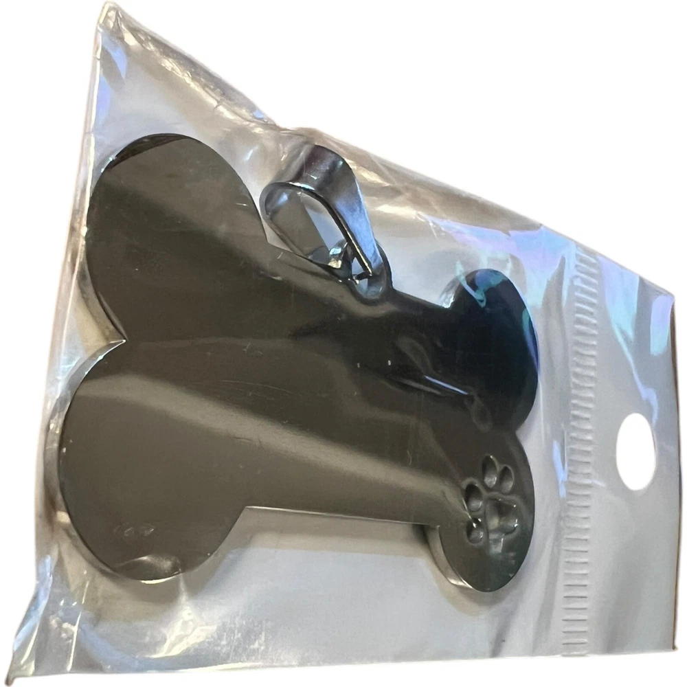 Custom Engraved Double-Sided Pet ID Tag - Bone Shape Item Details: • Type: Pet ID Tag • Shape: Bone with a small paw cut-out design • Material: Durable stainless steel (anti-rust, long-lasting) • Color: Polished silver tone • Features: • Customizable: Can be engraved on both sides with your pet’s name, contact details, or any text you prefer. • Lightweight yet sturdy, making it perfect for dogs or cats of any size. • Includes a secure attachment loop for collars. Condition: • New in packaging, never used. Perfect For: • Ensuring your furry friend’s safety with essential information readily available in case they get lost.