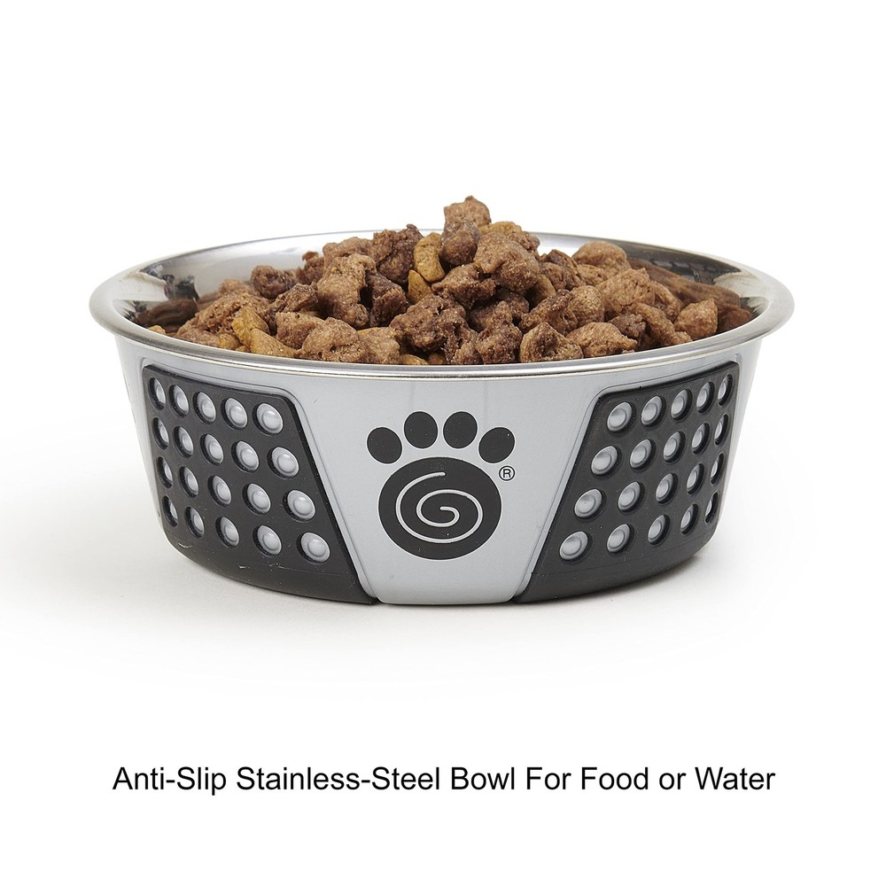Durable, Lightweight and Convenient: Strong stainless steel inner core with lightweight TPE plastic shell is ideal dog bowl construction. Lightweight dog bowls alleviate stress on the pet owner and dishwasher safe material add to convenience Non-Skid and Non-Spill: Anti-slip rubberized bottom prevents slipping, securing the dog bowl in place while safeguarding your floors. Ideal for dogs and cats that are prone to nudging their food bowl or water bowl Decorative and Functional: Stainless steel dog bowls offer a non-porous feeding and watering surface that is easily maintained for healthier eating for dogs and cats. The outer plastic shell offers enhanced design to complement modern home décor Comfortable Design: Wide, rounded rim dog bowl provides an easier to handle object for pet owners while providing a safer edge for dog and cat tongues and faces Versatile: Our stainless steel bowls and feeders are ideal food and water bowls for dogs, cats, puppies, kittens and other household pets. Lightweight design allows more volume while adding less stress on pet owner’s joints