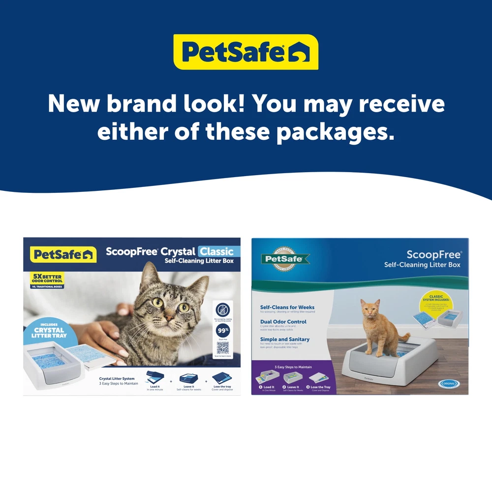 Strike scooping the litter box off your to-do list. With the ScoopFree® Crystal Classic Self-Cleaning Litter Box, there’s no scooping, cleaning or refilling your cat’s litter box for weeks. This litter box uses crystal litter which provides 5 times better odor control than traditional clumping litter. Crystal litter absorbs urine and dehydrates solid waste. This low-tracking litter also helps keep your floors clean because it is 99% dust free and doesn’t stick to your cat’s paws. Safety sensors make sure that the scooping cycle only occurs when your cat is out of the box. The disposable trays have a plastic lining to help protect against leaking, and each tray comes with a lid for quick and easy disposal—simply remove the tray and throw it away. PetSafe® brand is here to help you and your pet live happy together™. On Oct 25, 2024 at 05:12:12 PDT, seller added the following information: