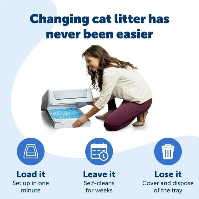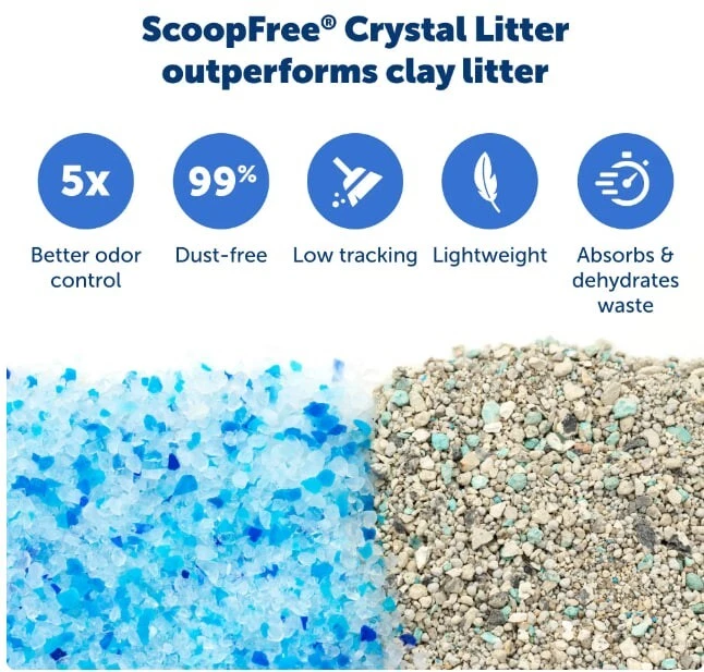 PetSafe ScoopFree Crystal Disposable Cat Litter Trays, Fresh Scent, Silica Crystals, 3-Pack About this item Product details Each ScoopFree® Disposable Crystal Litter Tray is pre-filled with Fresh Scent premium crystal cat litter, so all you have to do is load the tray in the litter box with no scooping, cleaning or refilling for weeks! Crystal litter absorbs urine and dries solid waste to quickly remove odors 5 times faster than clumping clay litter. Low-tracking crystals don’t stick to your cat’s feet and are 99% dust-free—designed for all the days you don’t want to sweep the floor (again). And the plastic tray lining creates a powerful extra barrier to protect your floors against leaks. When it’s time to clean up, just remove the disposable litter tray and throw it away. It doesn’t get much easier than that! Your pet deserves the best. Trust PetSafe® to help keep your pet healthy, safe and happy. Easy, Quick Cleanup - No scooping required; when it’s time to clean up, simply remove the disposable litter tray and throw it away Removes Odors Quickly - PetSafe ScoopFree Crystal Litter absorbs urine and dries solid waste to quickly remove odors 5 times faster than clumping clay litter Long-lasting - Just 1 tray can last up to 30 days in a single-cat household--that means less time cleaning the litter box so you have more moments to snuggle with your cat Leak Protection - Plastic tray lining creates a powerful extra barrier to protect your floors against leaks Less Mess - Low-tracking crystals don’t stick to your cat’s feet and are 99% dust-free--designed for all the days you don’t want to sweep the laundry room floor (again) Compatible Litter Boxes - This litter tray can be used with ScoopFree® Crystal self-cleaning cat litter boxes. Specifications Features Pre-portioned trays for easy clean up; Light fresh scent; Leak protection for less mess Brand PetSafe Assembled Product Weight 17.2 lb Manufacturer Part Number PAC00-14231 More details Features Pre-portioned trays for easy clean up; Light fresh scent; Leak protection for less mess Brand PetSafe Assembled Product Weight 17.2 lb Manufacturer Part Number PAC00-14231 Manufacturer Radio Systems Corporation Color Blue Animal Type Cat Assembled Product Dimensions (L x W x H) 22.25 x 14.63 x 7.13 Inches Directions Instructions See Product Manual Warranty Warranty information Limited Warranty Warnings State Chemical Disclosure None Shepherd and Stable Animals