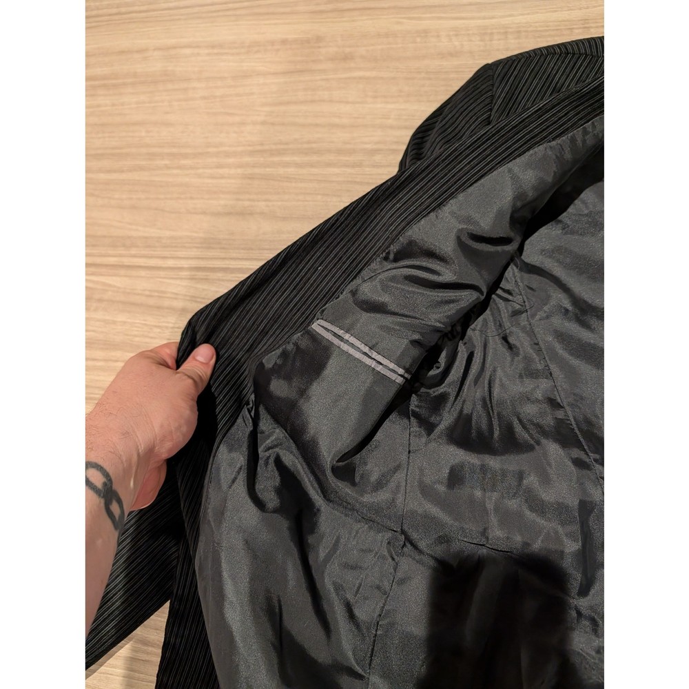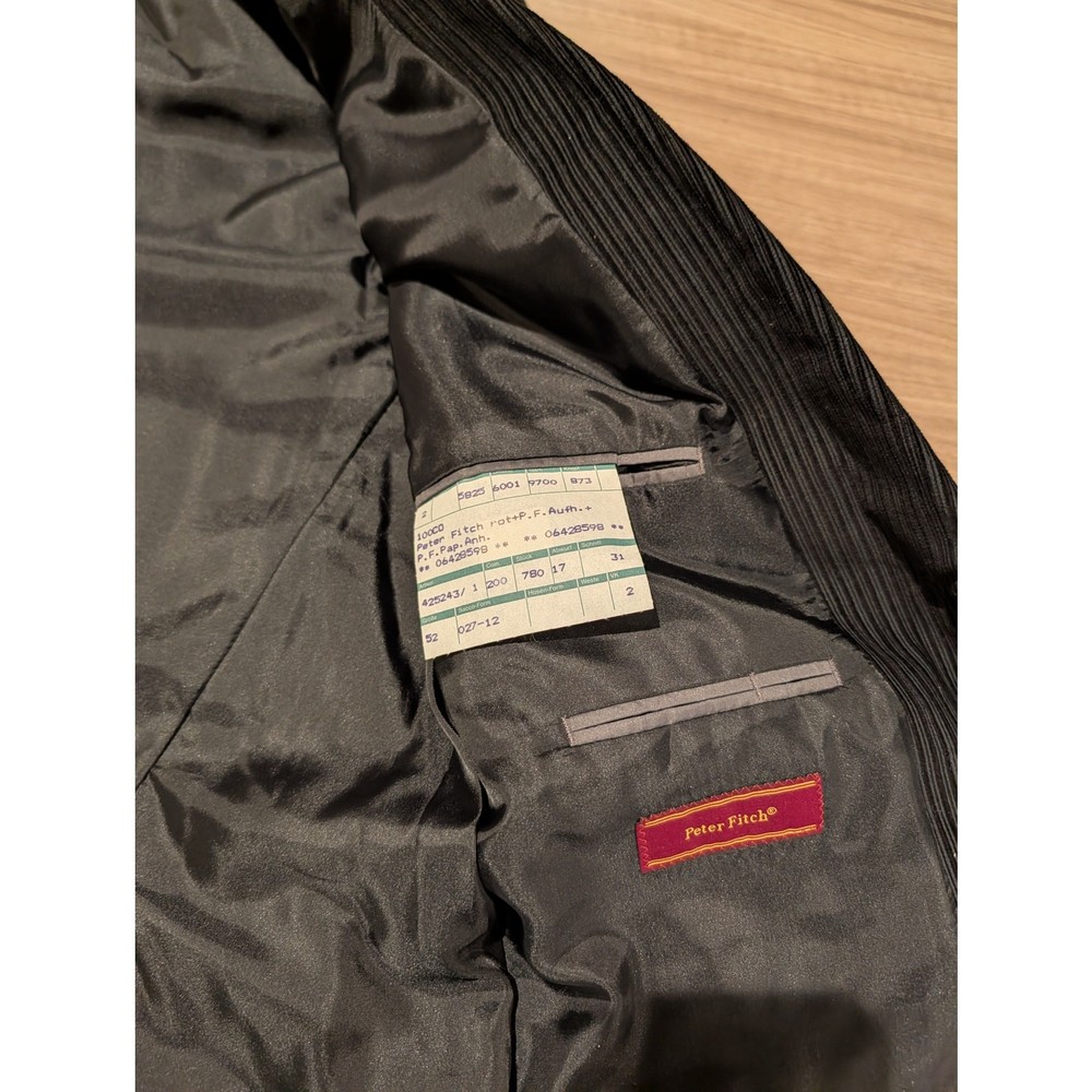 Add a touch of textured sophistication to your wardrobe with this Peter Fitch corduroy sport coat. Featuring a classic ribbed "wale" in a deep jet black, this blazer offers a perfect blend of durability and timeless style. The corduroy fabric provides a soft, tactile feel while maintaining a structured silhouette, making it an ideal choice for fall and winter layering. Whether you're heading to the office, a casual dinner, or looking to complete a vintage-inspired look, this jacket is a versatile staple. Brand: Peter Fitch Style: Two-Button Sport Coat / Blazer Color: Black Material: Ribbed Corduroy (Cotton/Blend) Size: Men's 42 Features: Notched lapel, front flap pockets, and a smooth interior lining. Condition: Pre-owned / Excellent Condition. See photos for details. Please Note: Please review all images carefully to evaluate the corduroy nap (texture) and ensure there are no signs of wear at the elbows or cuffs.