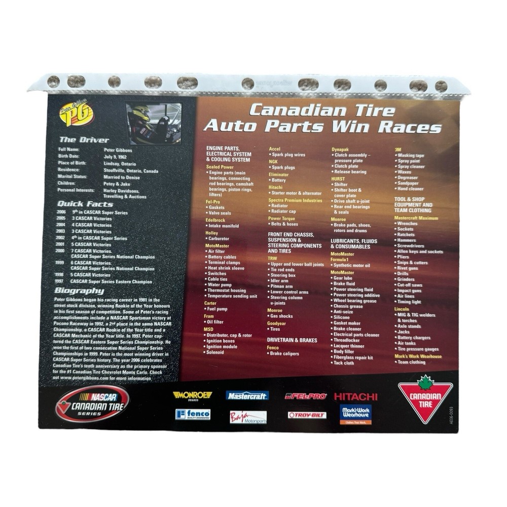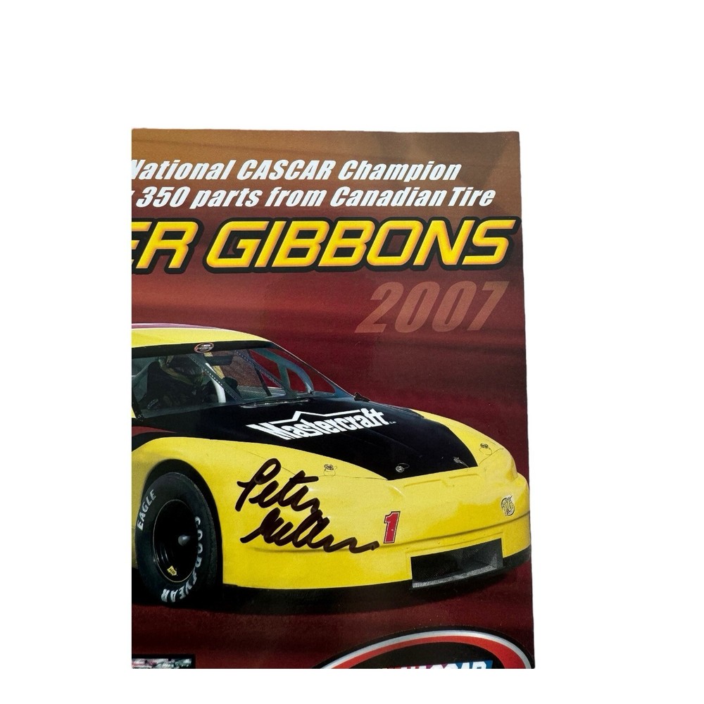 This autographed A4 size poster features Peter Gibbons, a celebrated driver in the CASCAR Racing Series and two-time National CASCAR Champion. Highlighting his 2007 season with Monroe Brakes and Canadian Tire sponsorship, this unique piece includes detailed specifications of his race car and his significant racing achievements. Perfect for racing enthusiasts and collectors. Key Features: • Driver: Peter Gibbons • Team: Monroe Brakes/Canadian Tire • Car: Chevrolet Monte Carlo • Career Highlight: Two-time National CASCAR Champion • Top Accomplishment: Multiple CASCAR victories and championship titles • Poster Type: Autographed collectible • Condition: Excellent, with clear signature Style and History: Peter Gibbons is a well-known figure in the CASCAR racing world, making this autographed poster a valuable addition to any collection. His success with Monroe Brakes and Canadian Tire is well documented, and this poster captures a significant moment from his illustrious career.