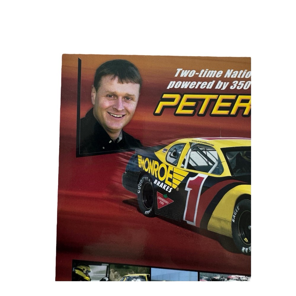 This is an autographed poster of Peter Gibbons, a two-time National CASCAR Champion, from the 2007 NASCAR Canadian Tire Series. This collectible item features Gibbons’ signature prominently on the front, along with images of his Monroe Brakes car and highlights from his racing career. A must-have for any NASCAR or racing enthusiast. • Autographed by Peter Gibbons, two-time National CASCAR Champion • Features images from the 2007 NASCAR Canadian Tire Series • Showcases Gibbons’ Monroe Brakes car • Dimensions: A4 size • Excellent condition with vibrant colors • Perfect for racing fans and collectors