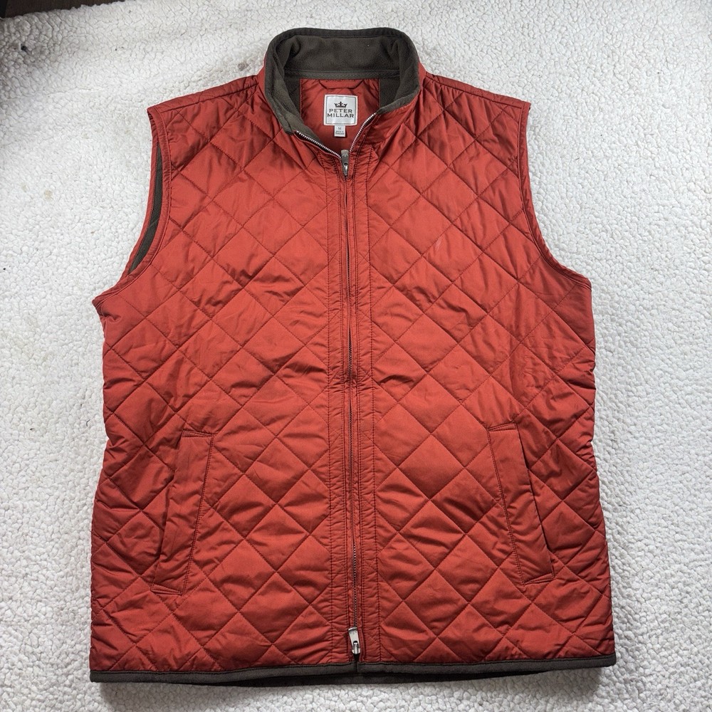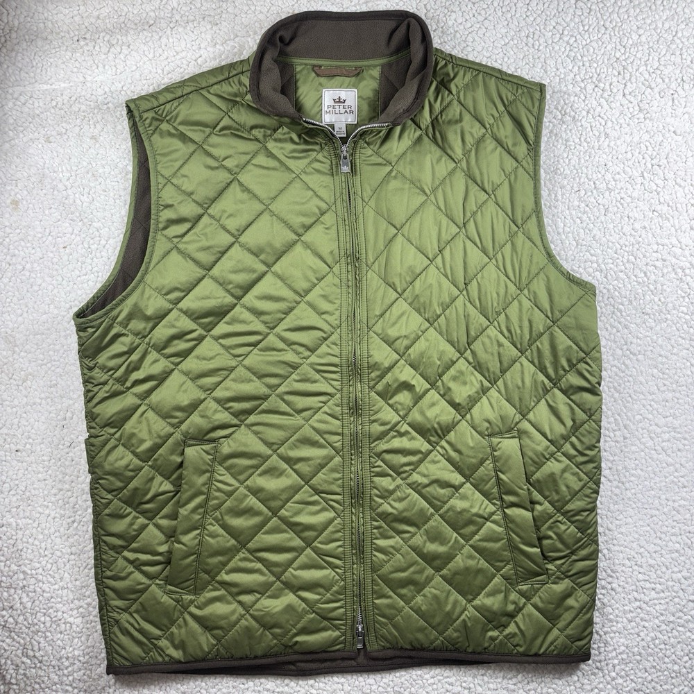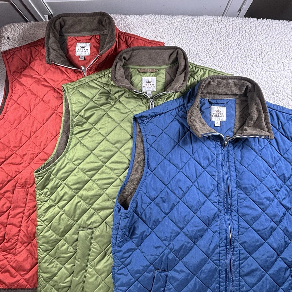 Lot of three authentic Peter Millar men’s quilted golf vests, all size Medium. Classic diamond quilted construction with full zip front and signature crown logo zipper pulls. Each vest features dual front hand pockets and a soft fleece-lined collar for added comfort and warmth. Lightweight and versatile layering pieces ideal for golf, business casual wear, travel, or everyday use. Included in This Lot: • Red Quilted Vest • Blue Quilted Vest • Green Quilted Vest All three vests are the same size and style. ⸻ Measurements (All Three Identical – Shown in Photos) • Pit to Pit: 22 inches (laid flat) • Length: 26 inches (top of collar to hem) Please compare measurements to a garment you own for best fit. ⸻ Condition Pre-owned. Excellent used condition. No visible rips, stains, or structural defects. All zippers function properly.