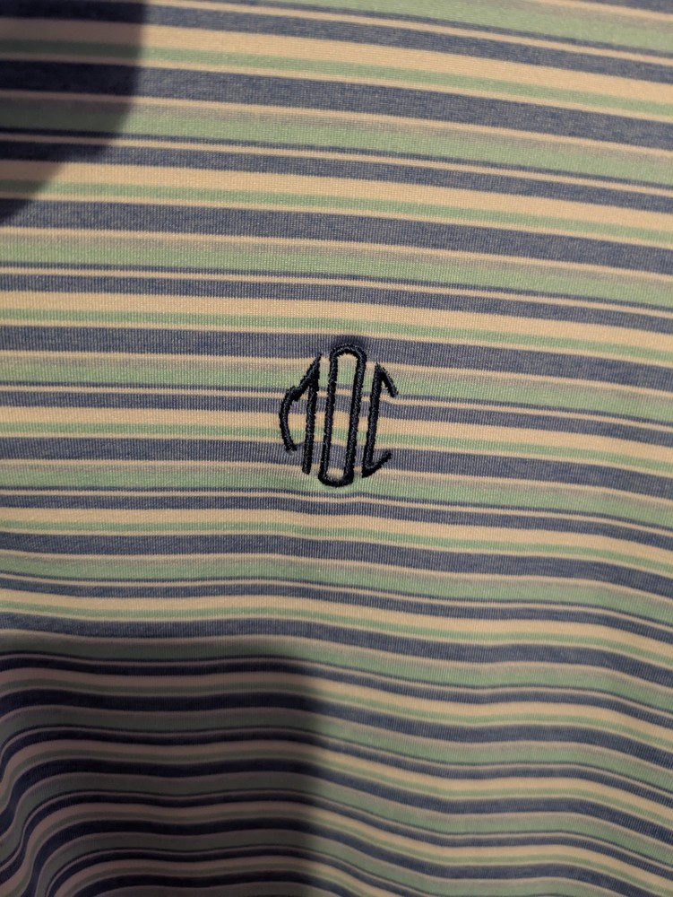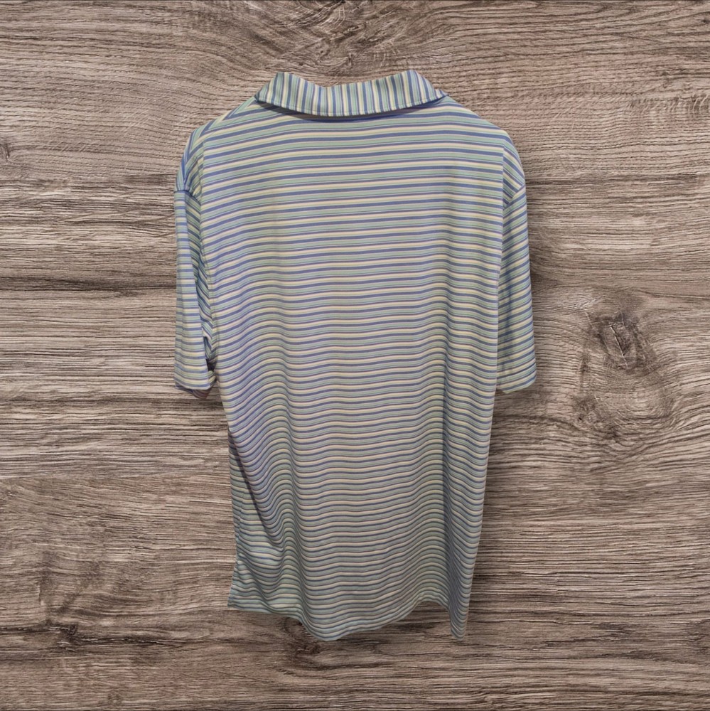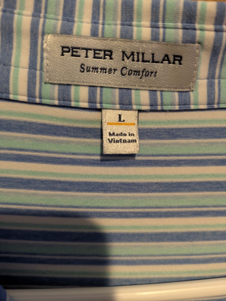 Size: L Closure: Button Chest Size: 52 in Neckline: Collared Fabric Wash: Medium Sleeve Length: Short Sleeve Department: Men Material: Polyester, Spandex Pattern: Striped Theme: Outdoor, Sports Character: golfing Country of Origin: Vietnam Type: Polo Garment Care: Machine Washable Occasion: Casual Accents: Button, Embroidered, Logo Color: White Vintage: No Personalize: No Season: Fall, Spring, Summer, Winter Features: Lightweight Size Type: Regular Fabric Type: Blended Fabric Shirt Length: 32 in Handmade: No Brand: Peter Millar Fit: Regular Product Line: Peter Millar Summer Comfort Collar Style: Spread Performance/Activity: Golf