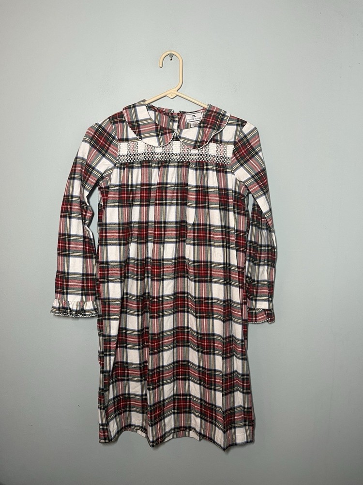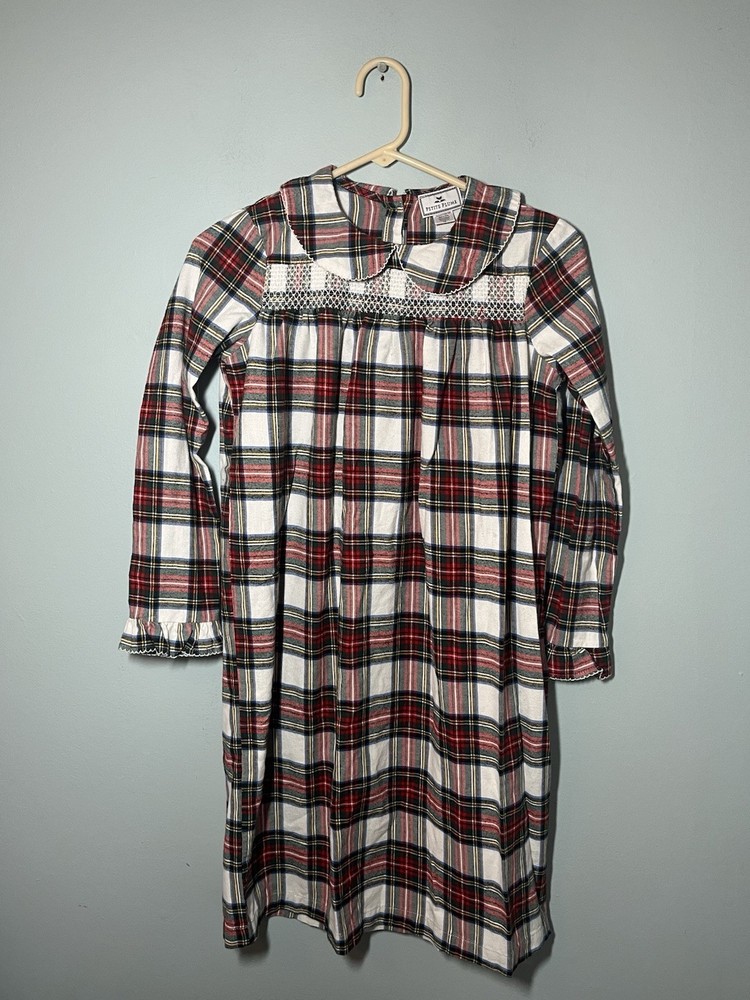 The Petite Plume Plaid Holiday Flannel Nightgown is a cozy and festive sleepwear option for girls size 12. The long-sleeve gown features a collared neckline and is made from a soft cotton blend flannel fabric, perfect for keeping your little one warm on winter nights. The multicolor plaid design adds a playful touch to the cottagecore aesthetic, making it an adorable choice for holiday celebrations or just snuggling up at home.