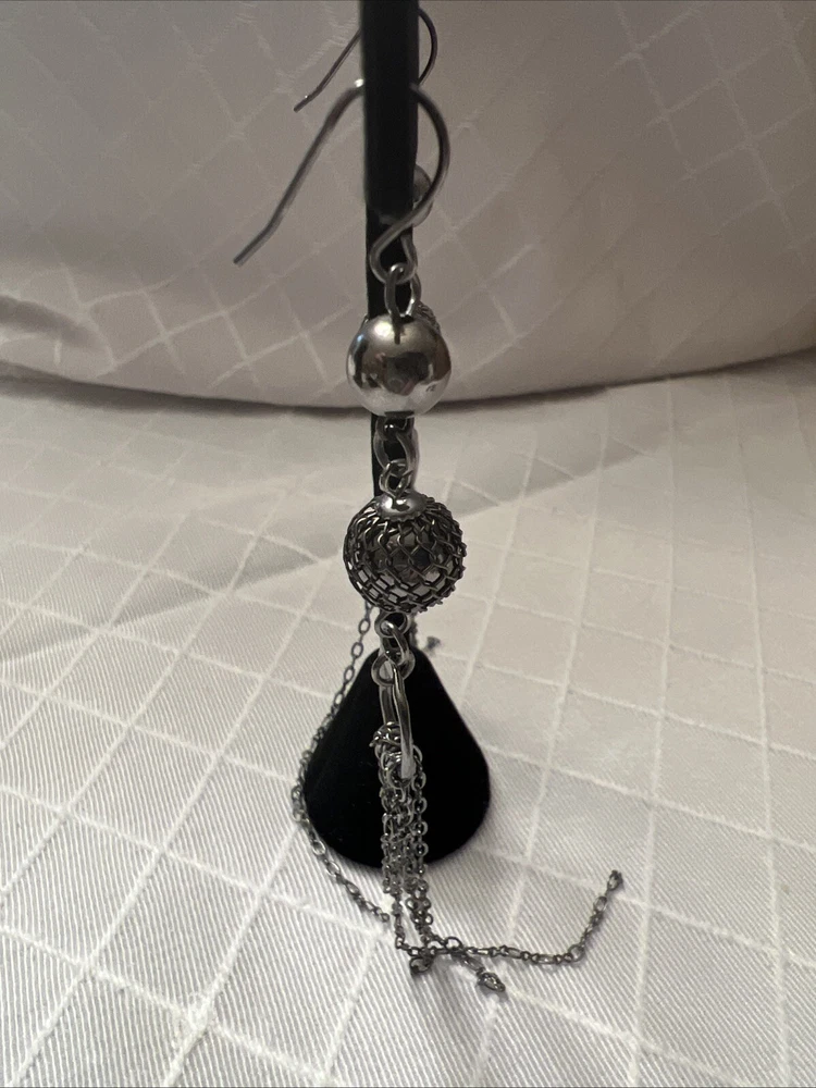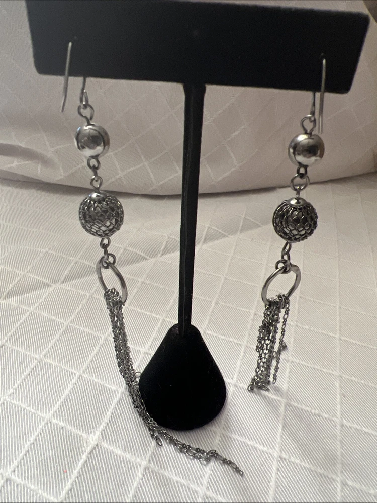Pewter metal mesh chain dangle 5 inches long tassel earrings