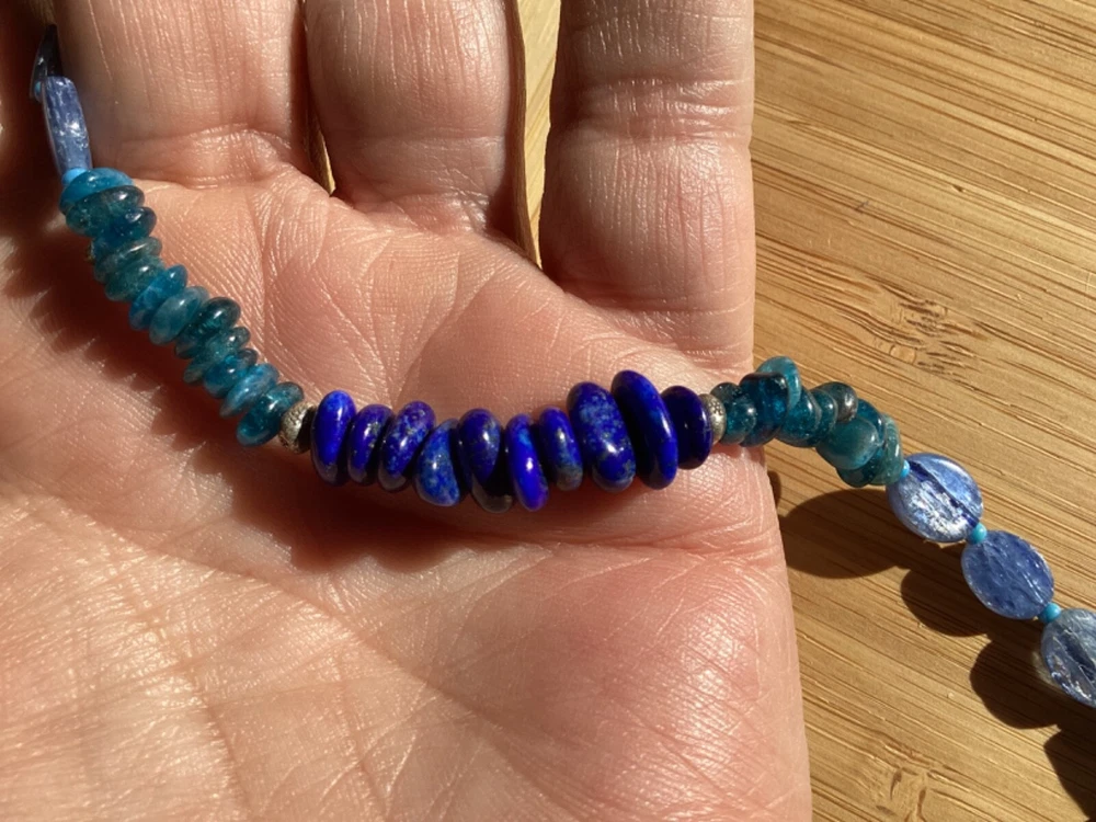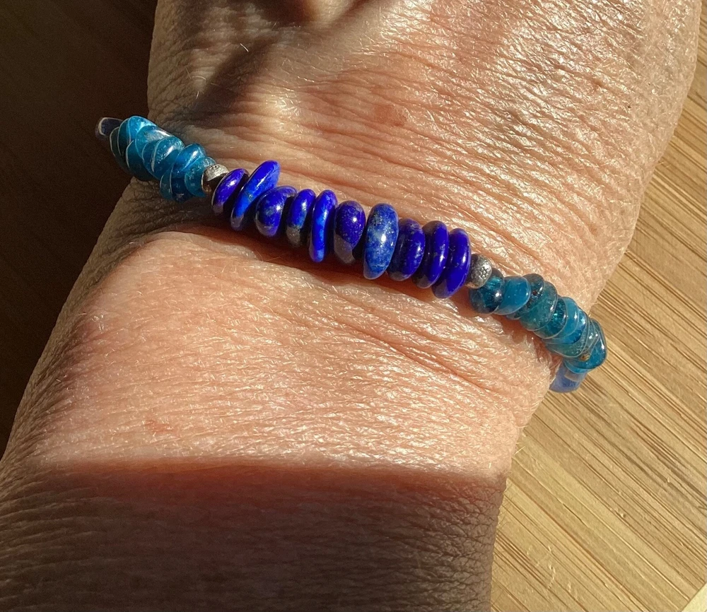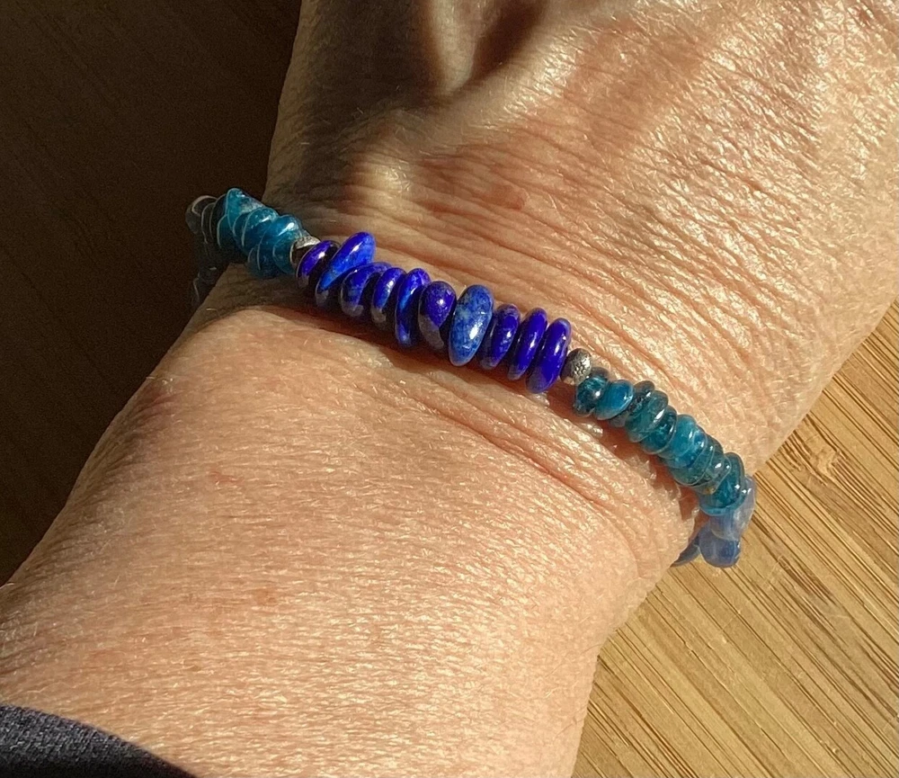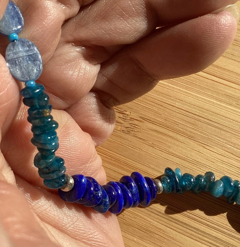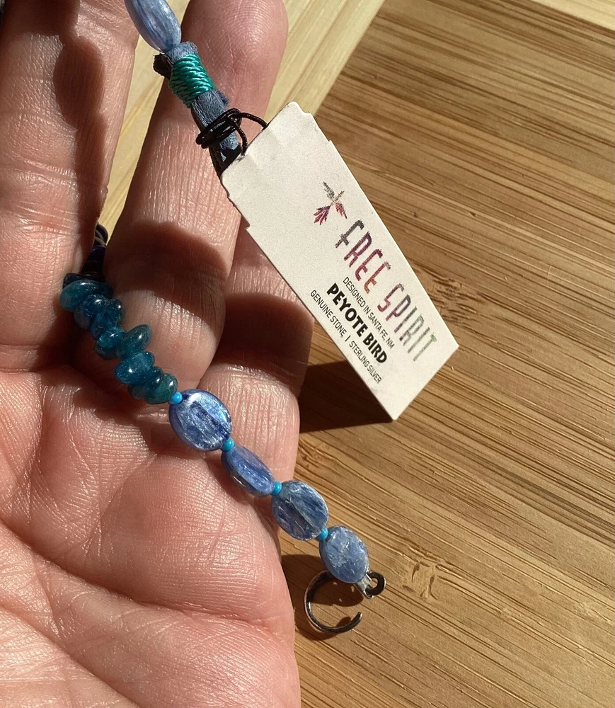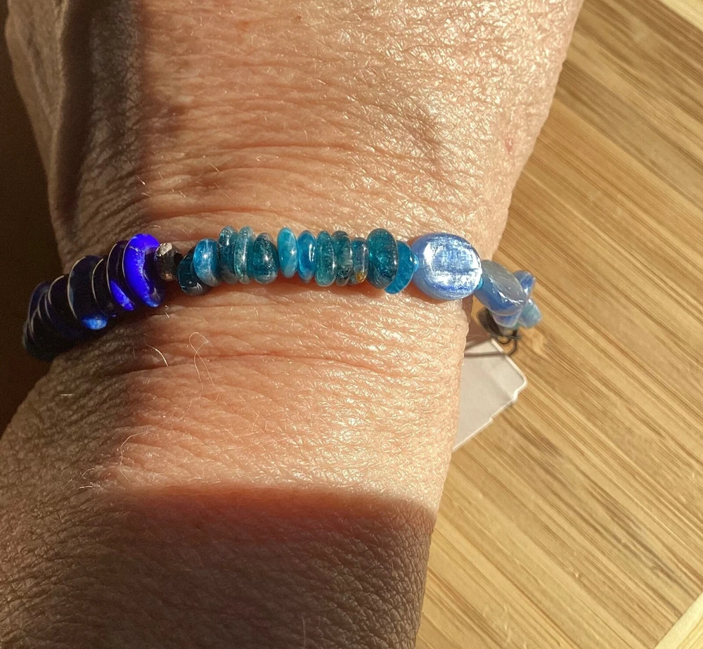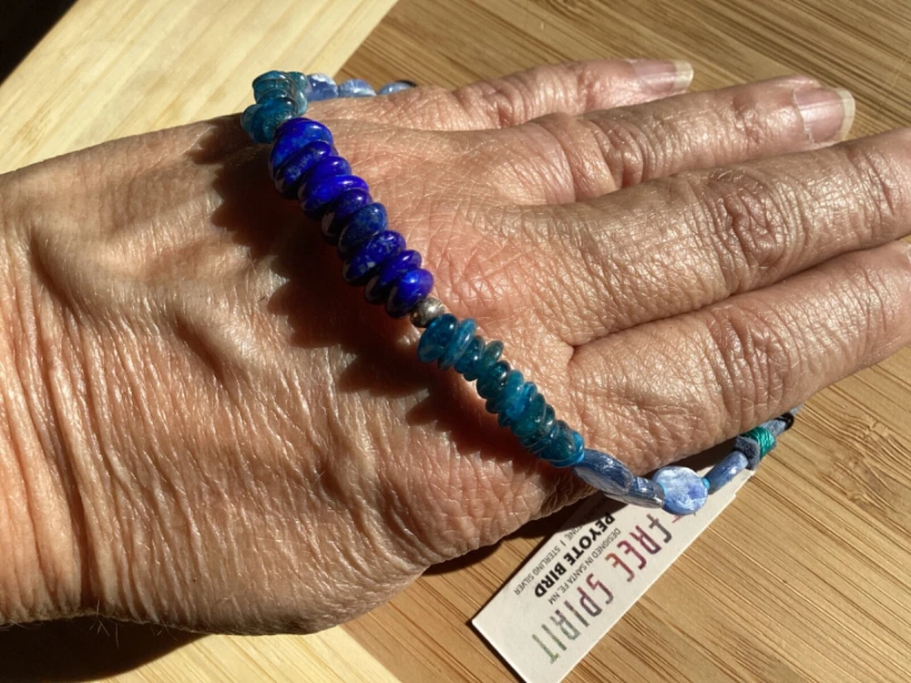 Beautiful shades of blue gemstone bracelet by Peyote Bird Designs. Handmade in Santa Fe New Mexico. Stones are dark blue lapis, blue green apatite and shiny blue kyanite. Measures 7 inches long, excluding hook. Closure is Sterling Silver hook that goes into leather loop. Nicely done! Ships USPS Ground Advantage.