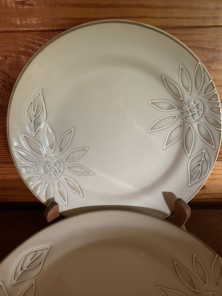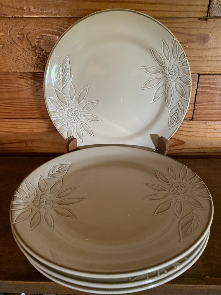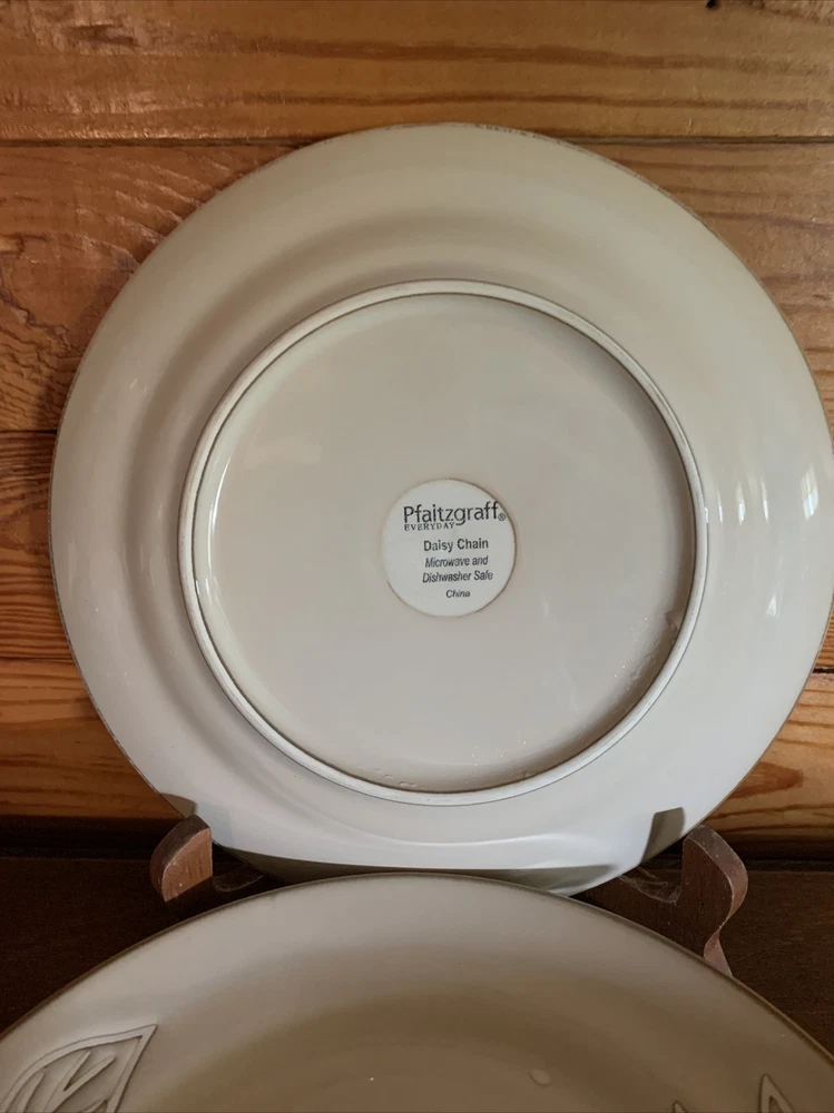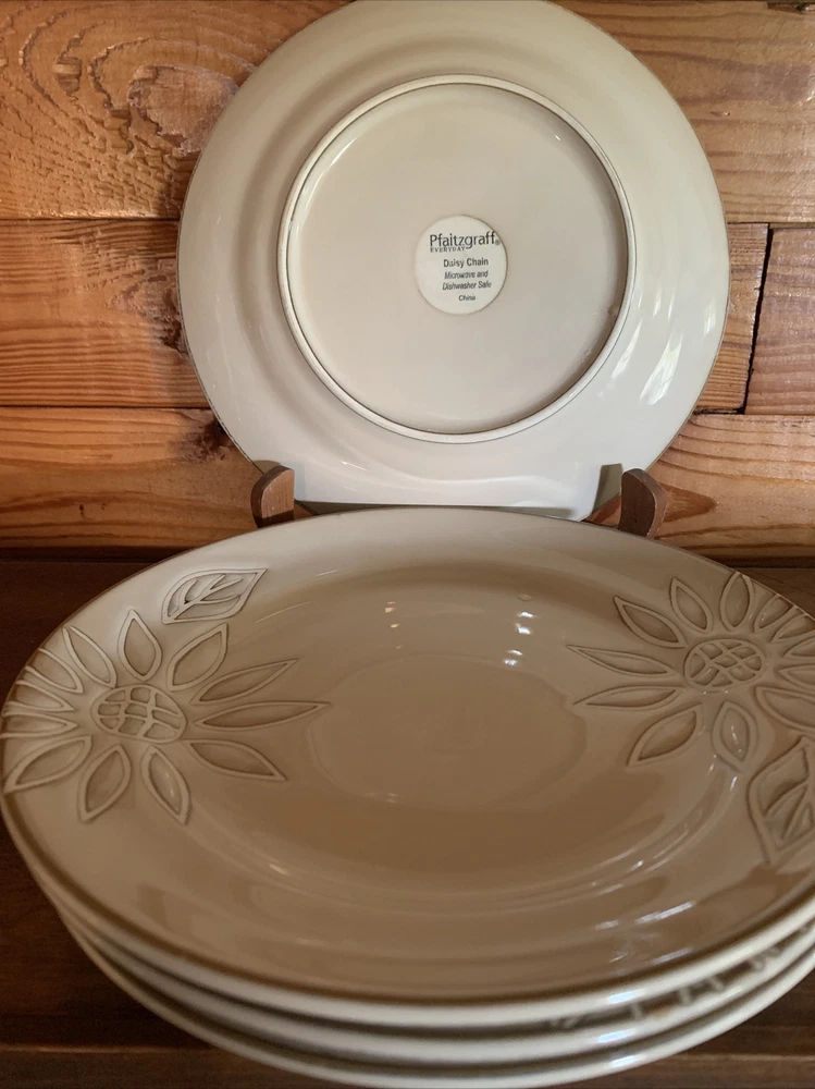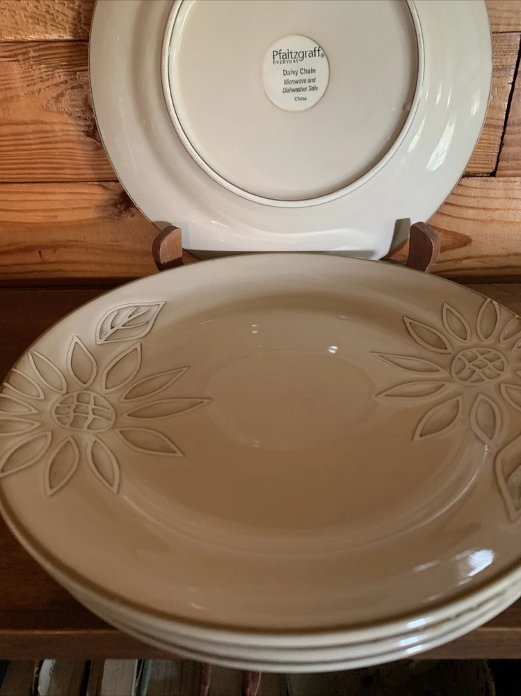 Elevate your dining experience with the Pfaltzgraff Daisy Chain Salad Plates, a set that exudes a timeless Arts & Crafts/Mission Style charm. Each plate features an embossed floral pattern, delivering a touch of elegance to your table setting. The glossy finish enhances the beige stoneware's durability and adds a lustrous appeal that is sure to complement any meal. With a plate diameter of 8.5 inches, these salad plates are the perfect size for presenting your favorite greens and desserts. Crafted in 2009, this four-piece set brings both contemporary originality and a floral theme to your dining occasions, making it a delightful addition to your dinnerware collection. Pfaltzgraff Daisy Chain Salad Plates 8.5” (Set of 4). Condition is "Used". Shipped with USPS Priority Mail. I have two sets of these with 4 salad plates in each set. The price listed is for one “set of 4”. The material is extremely substantial in weight. These are beautiful everyday dishes by Pfaltzgraff made from heavy stoneware that can go from oven to table to dishwasher without issue. The Daisy Chain pattern in neutral beige and swirled browns and creams will fit any kitchen decor. Complete your set or start a new collection today with this retired pattern produced from 2009-2013. These salad plates have no chips, cracks or crazing and show only light signs of use with regard to utensil marks or discoloration. Thank you for looking.