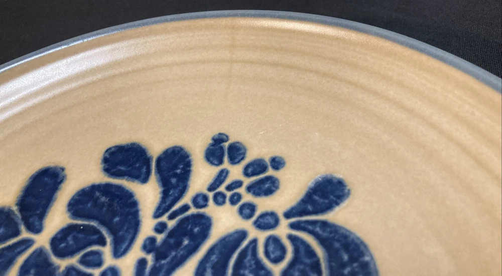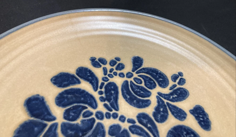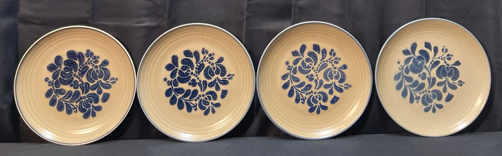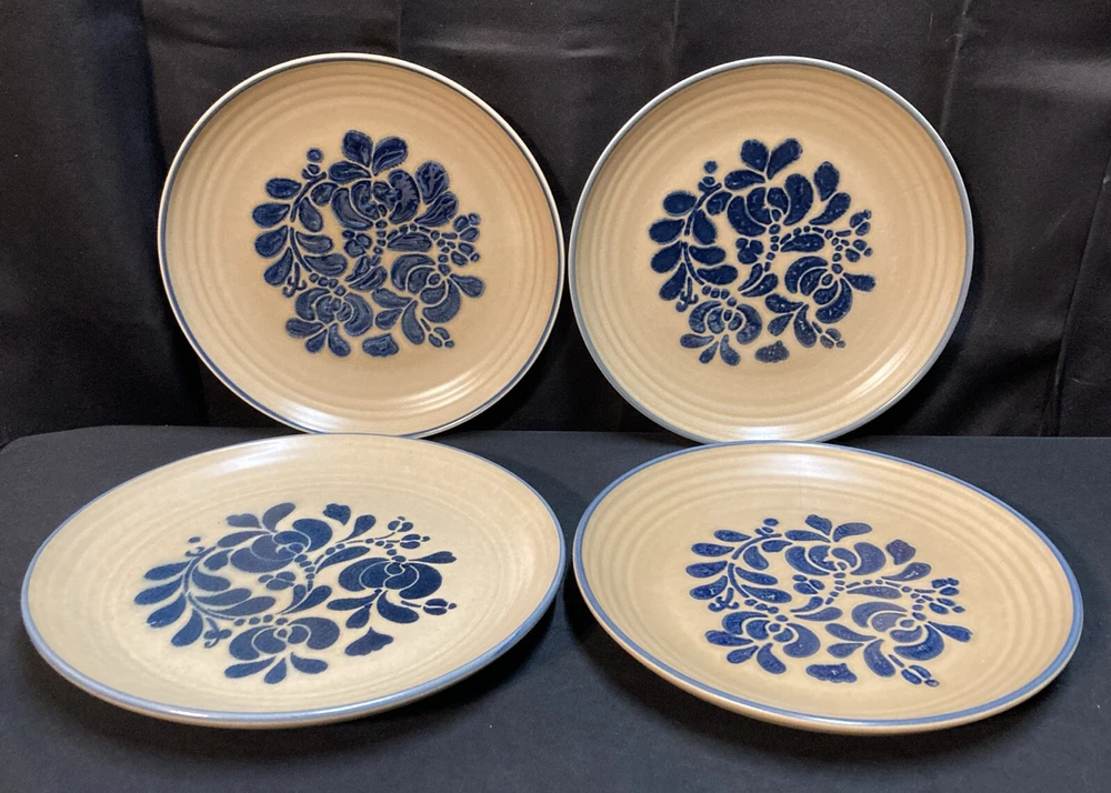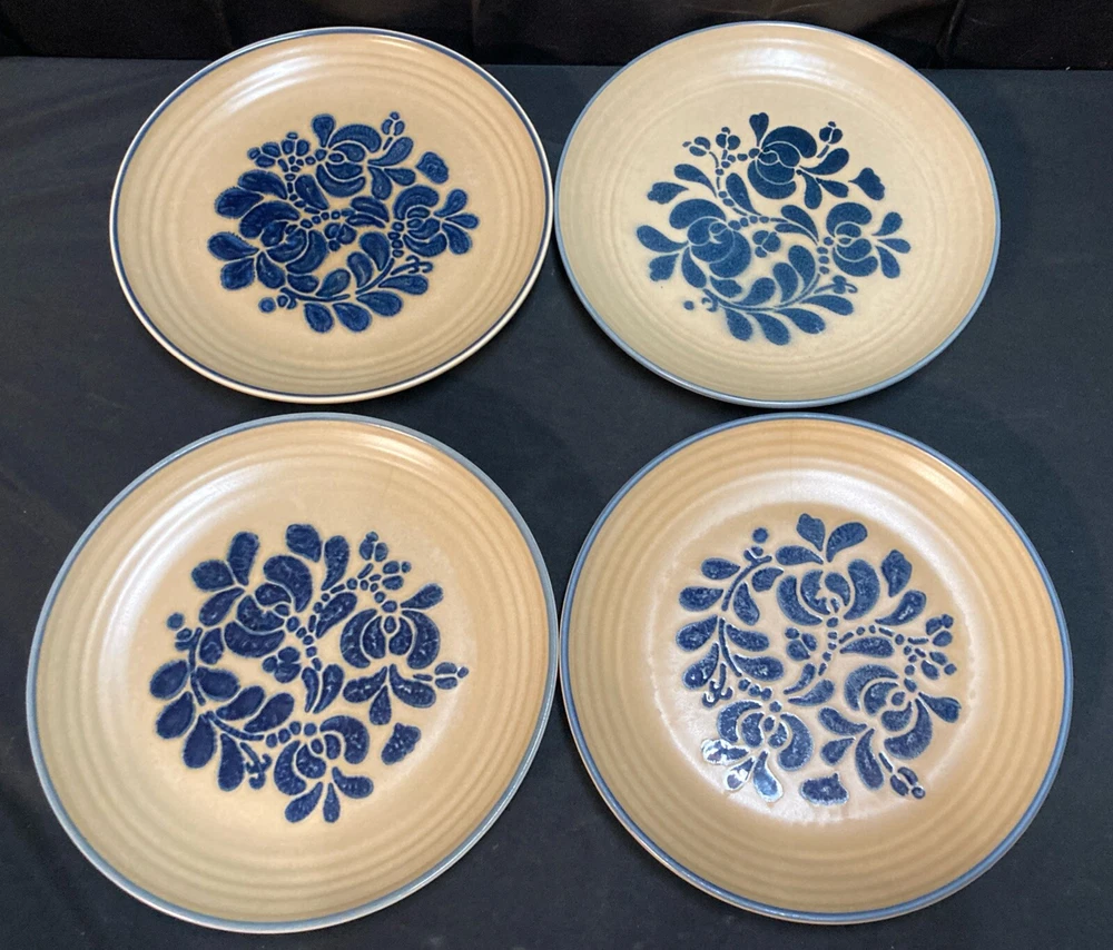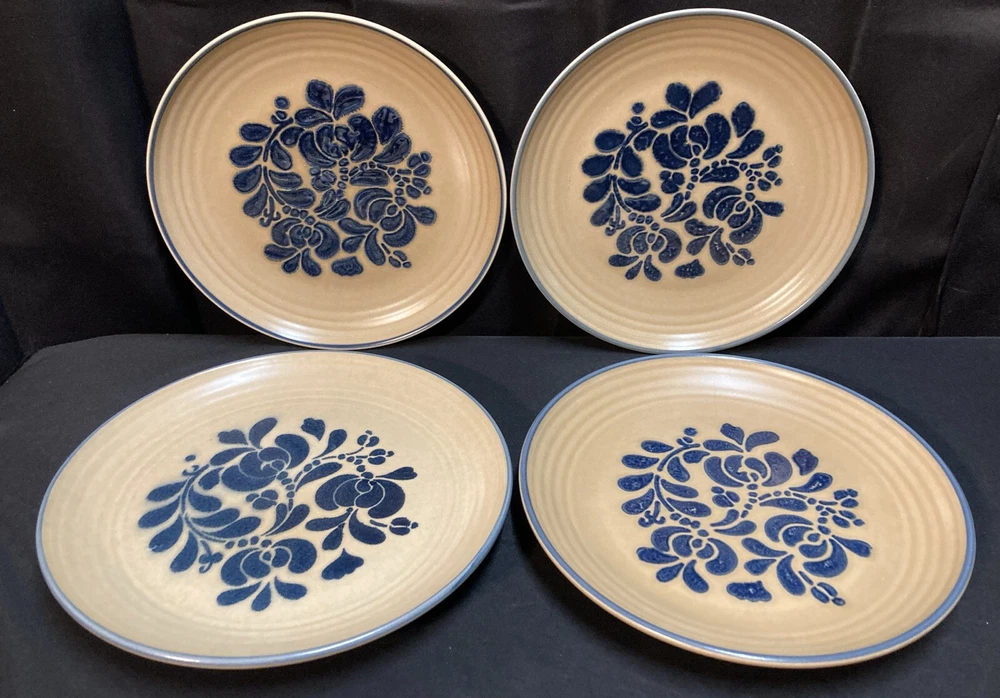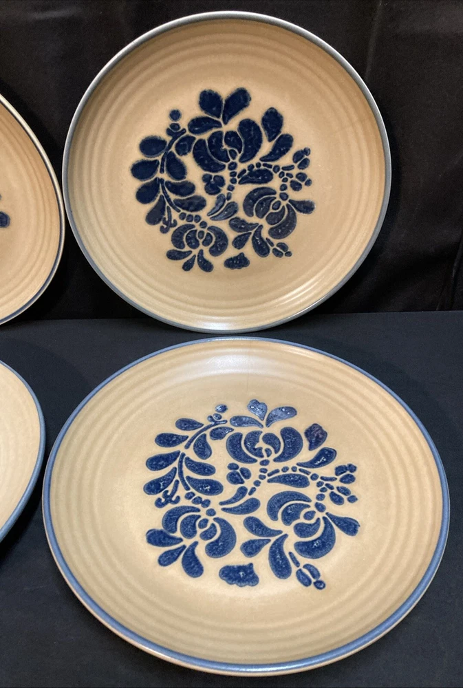 Origin: America Item Width: 10" Occasion: All Occasions Era: Late 20th Century (1970-1999) Set Includes: 4 Dinner Plates Features: Decorative, Stackable Original/Licensed Reproduction: Original Backstamp: Impressed Theme: Flower Item Height: 1" Material: Stoneware Country/Region of Manufacture: United States Item Length: 10" Type: Dinner Plate Pattern: Floral Production Technique: Pottery Brand: Pfaltzgraff Handmade: No Plate Diameter: 10" Shape: Round Product Line: Folk Art Number of Items in Set: Four-Piece Vintage: No Color: Tan and Blue Antique: No