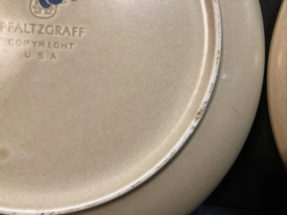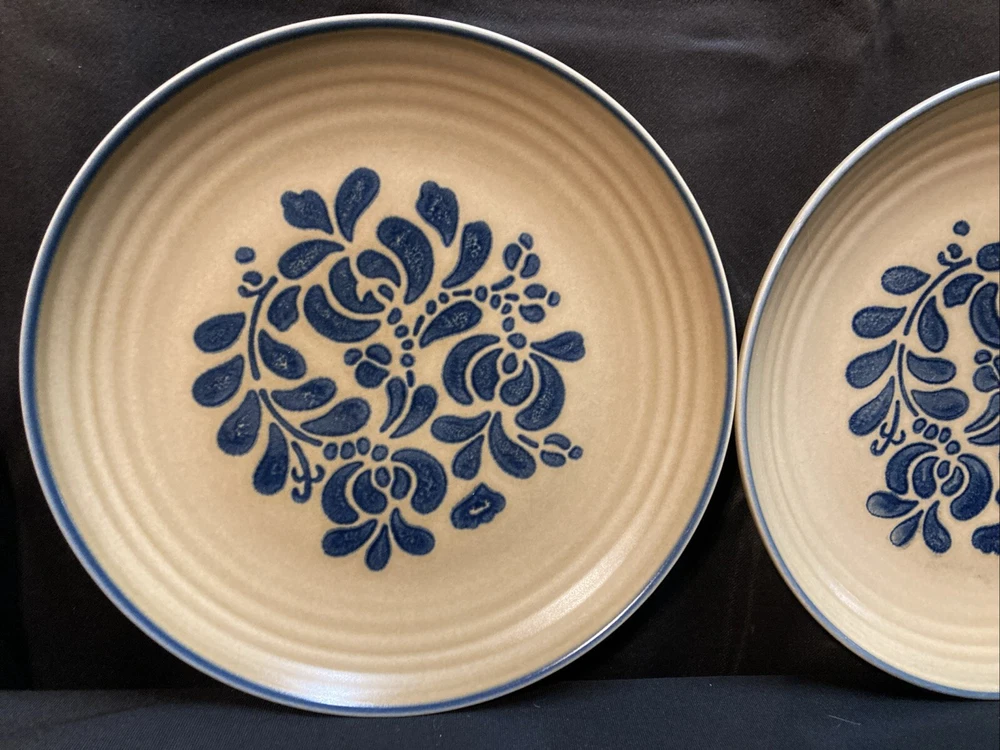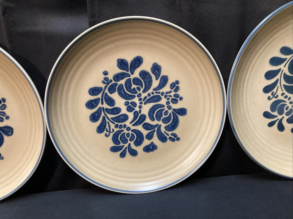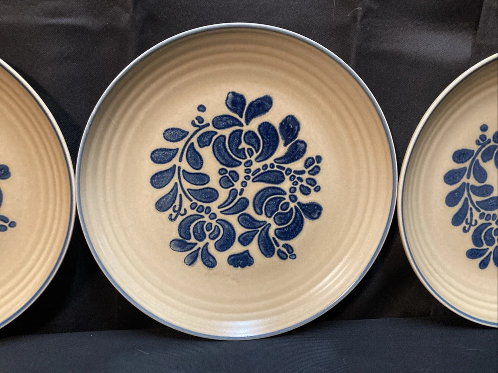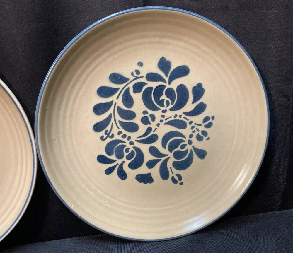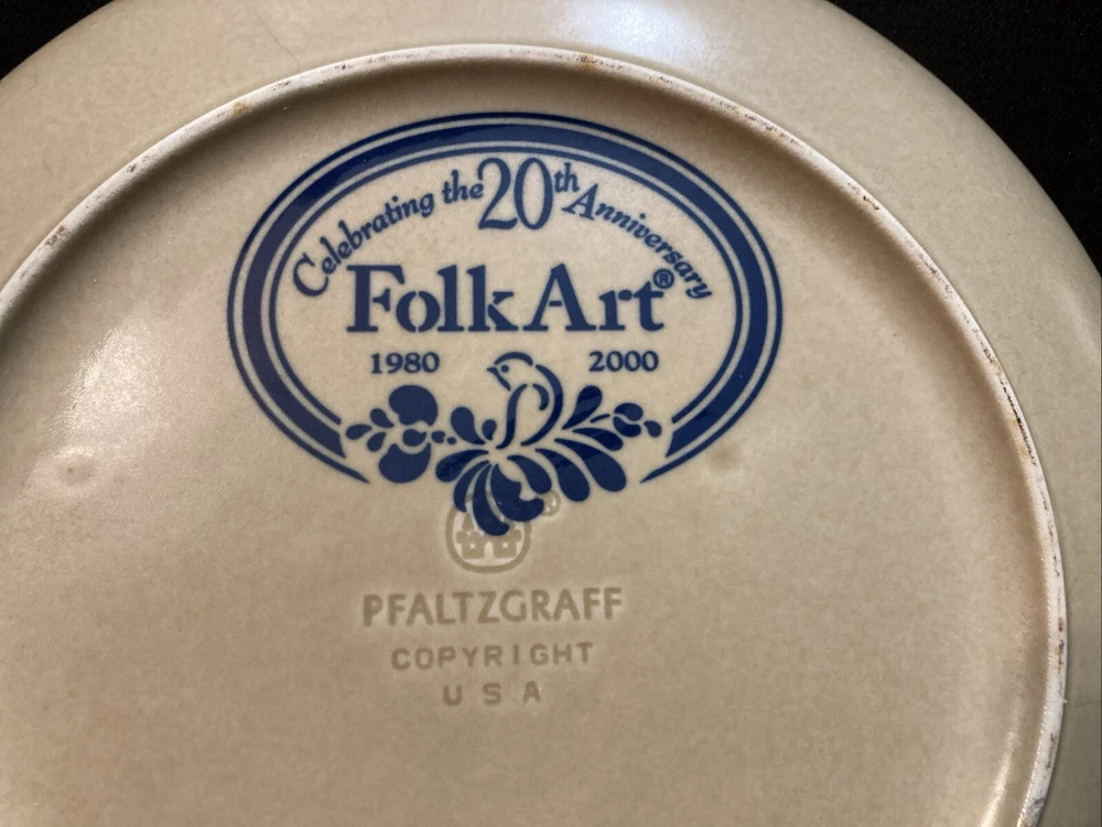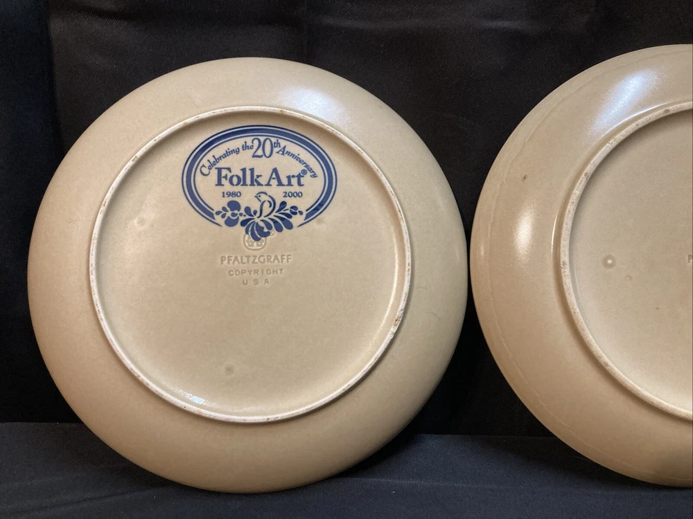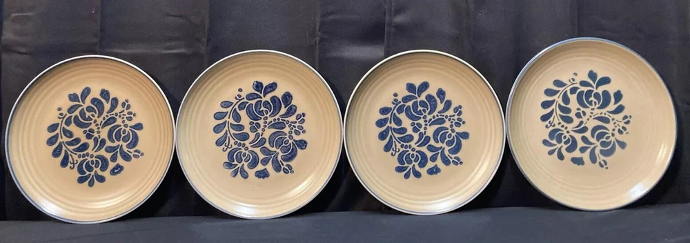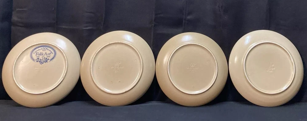 Number of Items in Set: Four-Piece Material: Stoneware Shape: Round Vintage: No Antique: No Plate Diameter: 10" Pattern: Floral Era: Late 20th Century (1970-1999) Brand: Pfaltzgraff Set Includes: 4 Dinner Plates Theme: Flower Backstamp: Impressed Color: Tan and Blue Item Height: 1" Production Technique: Pottery Features: Decorative, Stackable Origin: America Type: Dinner Plate Product Line: Folk Art Occasion: All Occasions Item Length: 10" Handmade: No Original/Licensed Reproduction: Original Item Width: 10" Country/Region of Manufacture: United States