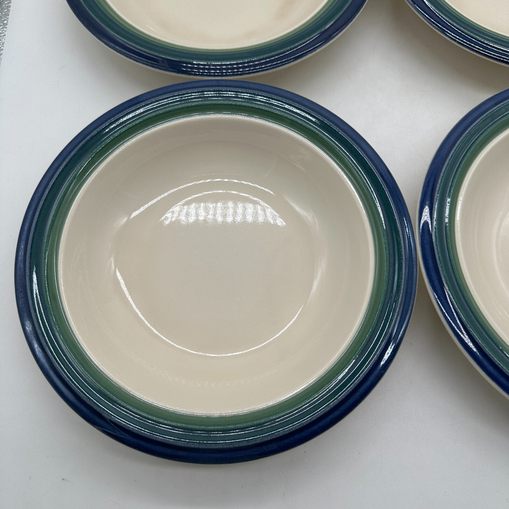 The Pfaltzgraff Ocean Breeze Soup Cereal Bowls feature a stripe pattern in blue, green, and ivory colors. Made of ceramic, this set of four round bowls is perfect for casual occasions. The glossy finish adds a touch of elegance to the design. Made in the United States, these bowls are ideal for serving soups, cereals, or other dishes in a vibrant and colorful style.