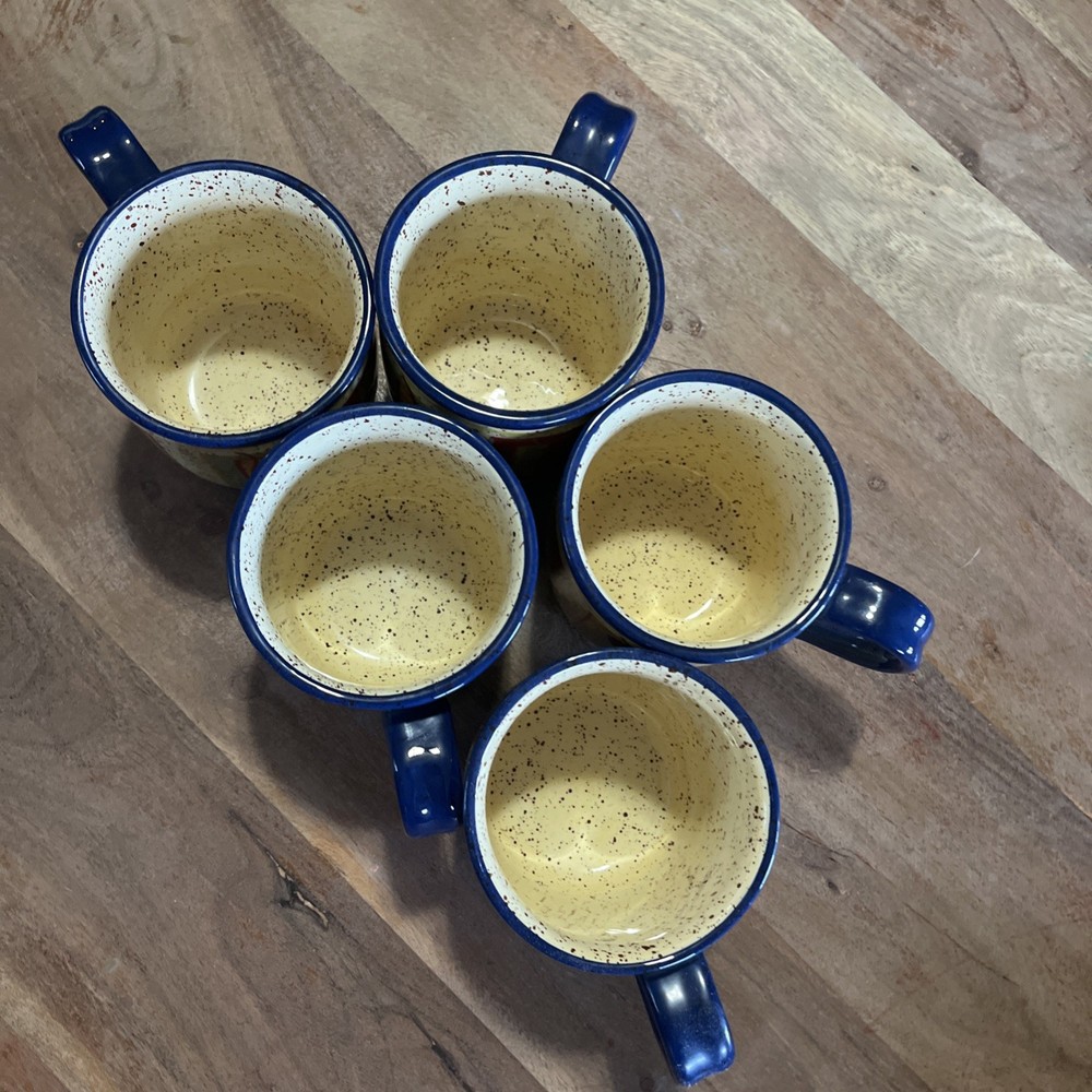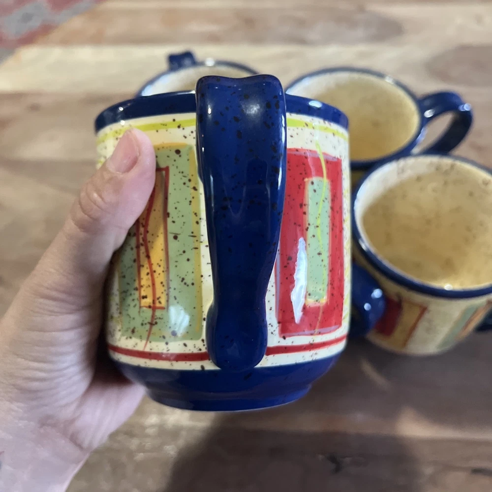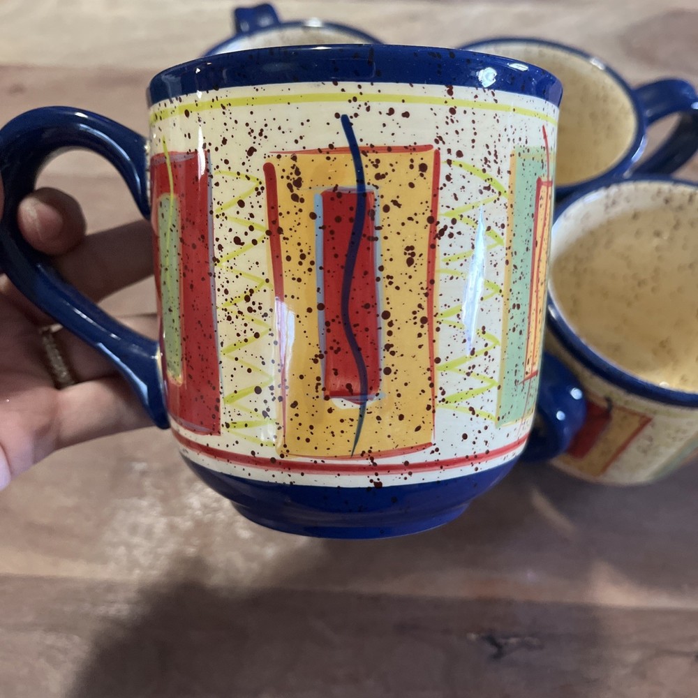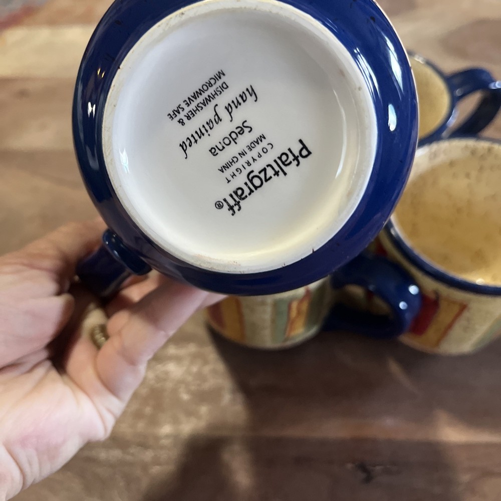 This set of five Pfaltzgraff Sedona stoneware coffee mugs is a great addition to any collection. The mugs feature a round shape and a 16 oz capacity, perfect for enjoying your favorite hot beverage. The multicolor design is hand painted and adds a decorative touch to the mugs. They are stackable, microwave and dishwasher safe and have a glossy finish. These mugs were manufactured in 2009 and are part of the Pfaltzgraff Sedona product line. They are suitable for all occasions and have a Western, Southwest, Aztec, and Color theme. The mugs are 4.25 inches in height and 4 inches in diameter. Care instructions are included and the mugs should be hand washed only. This set is an original and has been printed with a backstamp.