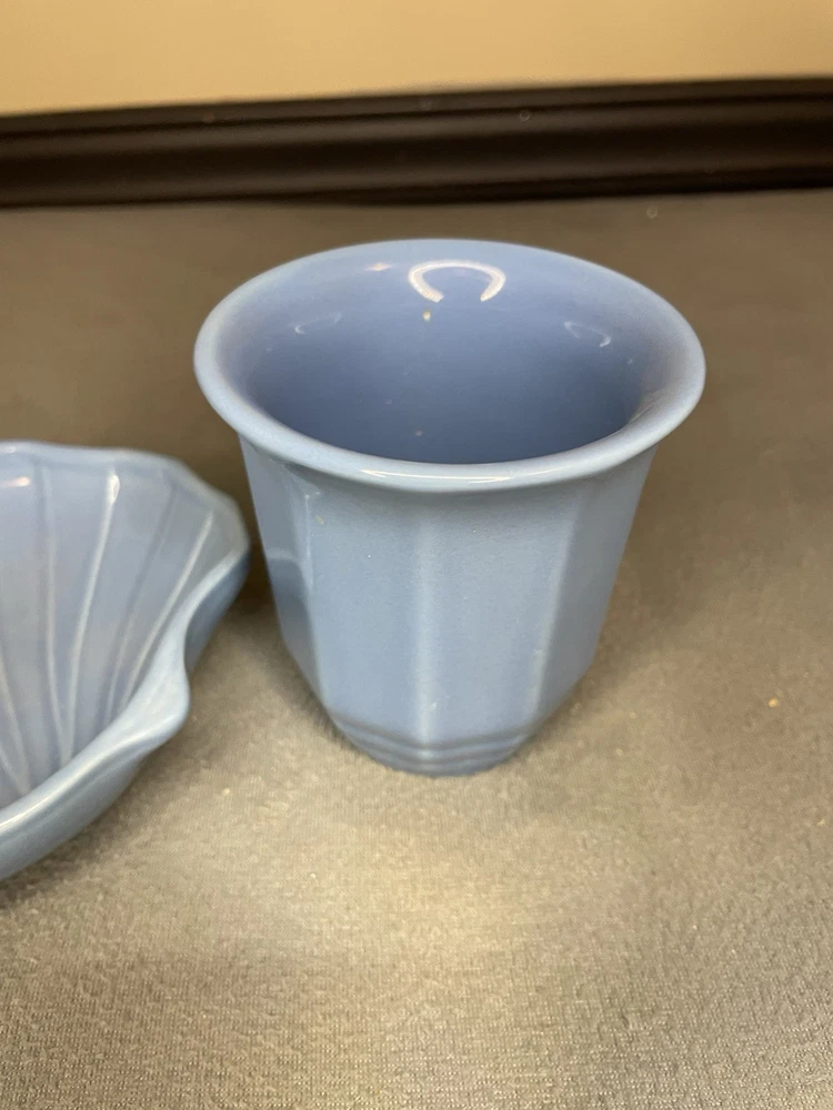 The Pfaltzgraff Stoneware Sky Blue Shell Soap Dish and Tumbler bathroom set of 2 is a charming vintage/retro accessory set perfect for adults. Made of ceramic in a solid sky blue color, this set includes a round shell-shaped soap dish and a tumbler. The set is original and was manufactured in the United States, making it a unique and stylish addition to any bathroom decor. Please inspect photos carefully