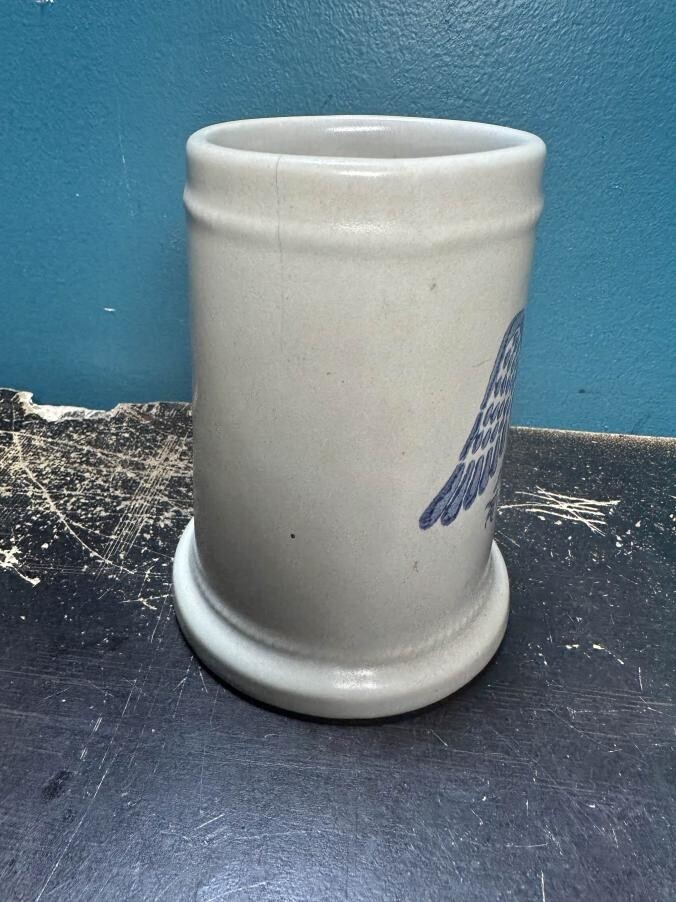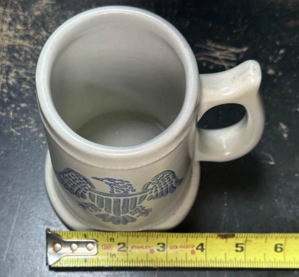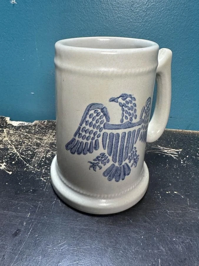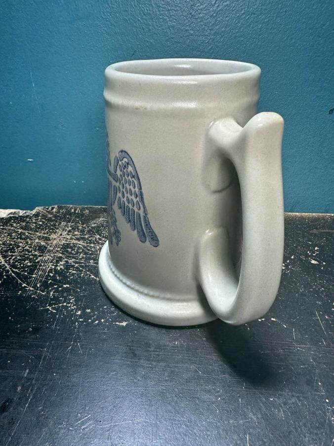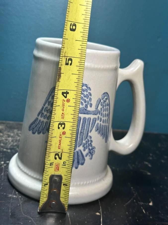 Pfaltzgraff Stoneware Mug Stein #286 M Eagle Tankards Blue Eagle Cup The Pfaltzgraff Stoneware Mug Stein #286 M Eagle Tankards Blue Eagle Cup is a decorative and durable mug made of stoneware with a blue and white pottery production style. Featuring a unique eagle pattern, this mug is perfect for all occasions and adds a touch of charm to your tableware collection. The brand Pfaltzgraff is known for its quality craftsmanship and this mug is no exception, making it a stylish and practical piece for enjoying your favorite beverages.