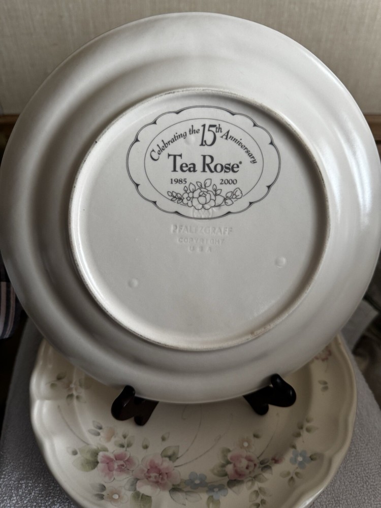 This product is a set of four round scalloped style dinner plates made of stoneware with a pink tea rose pattern. The plates are part of the Pfaltzgraff brand's 15th Anniversary Tea Rose product line and were manufactured in the USA in the year 2000. They are vintage and original, with a printed backstamp . No chips or cracks! Little signs of wear but still in beautiful condition!