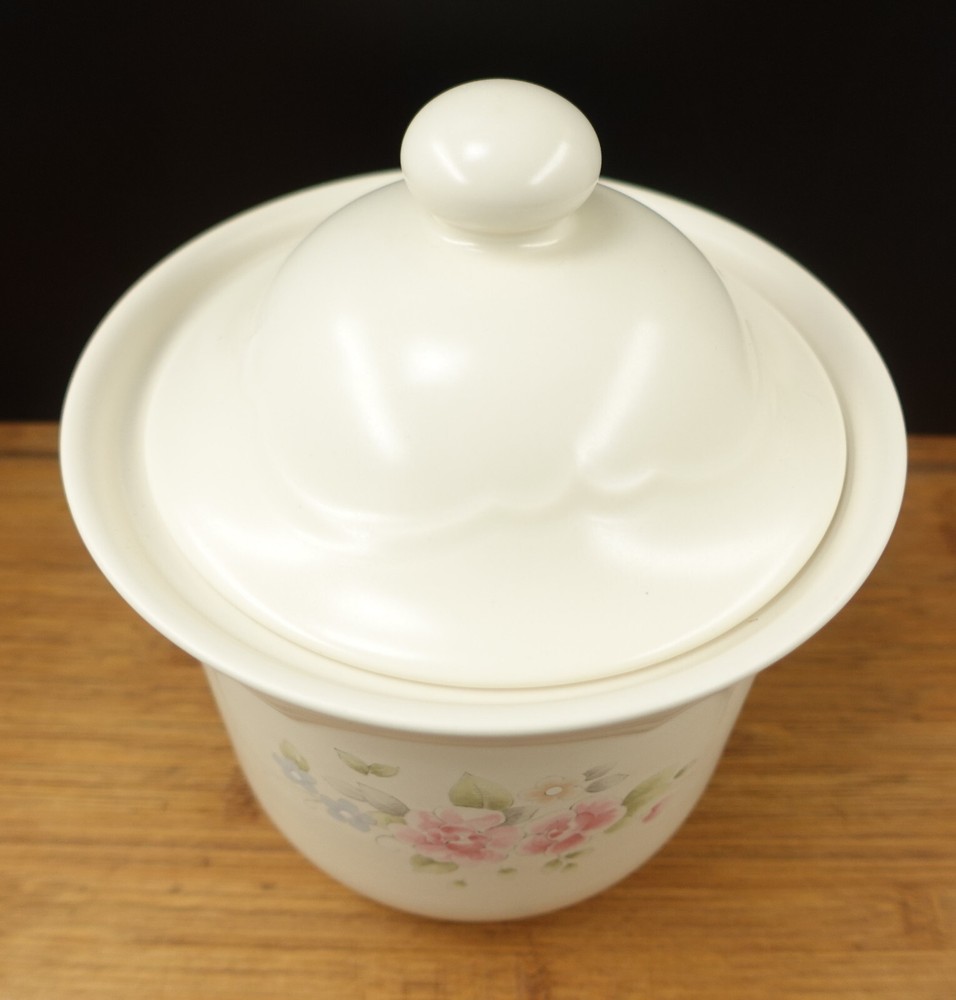 Type: Canister Main Color: Pink and blue flowers Original/Reproduction: Vintage Original Theme: Floral Model: Canister Brand: Pfaltzgraff Color: White Pattern: Floral Featured Refinements: Pfaltzgraff Tea Rose