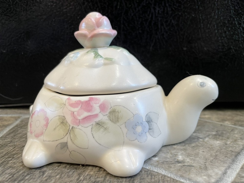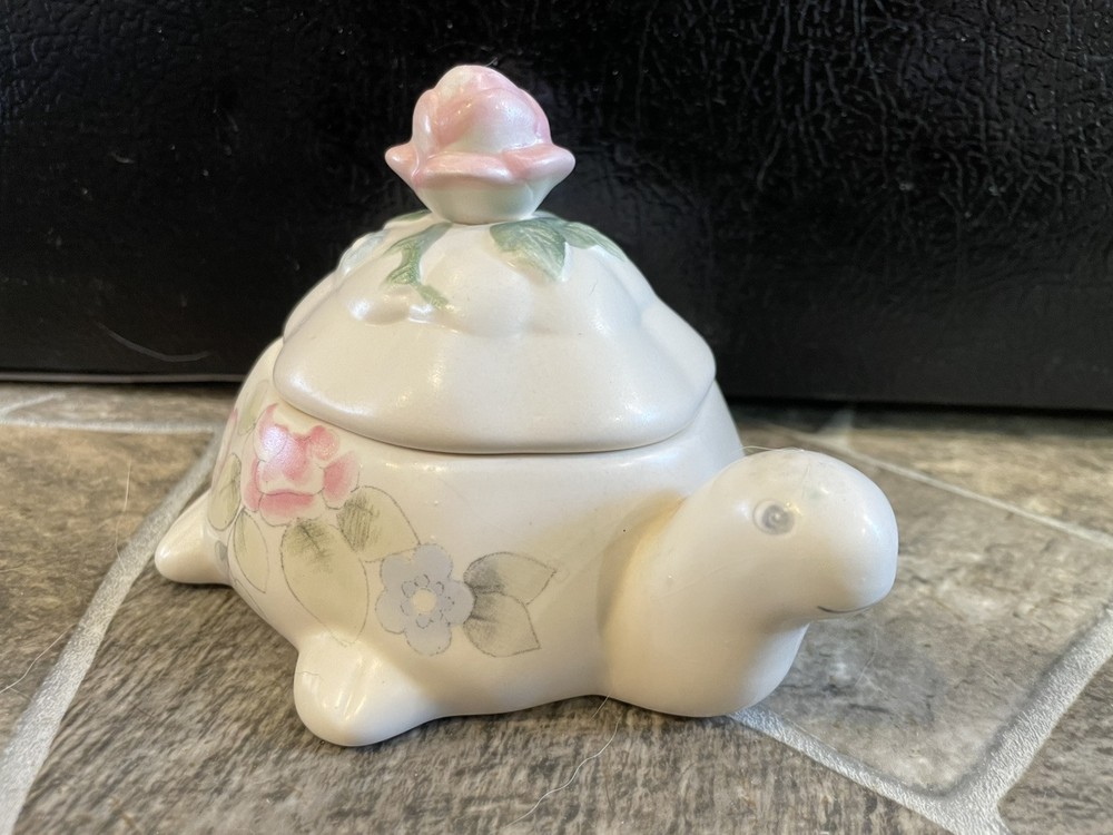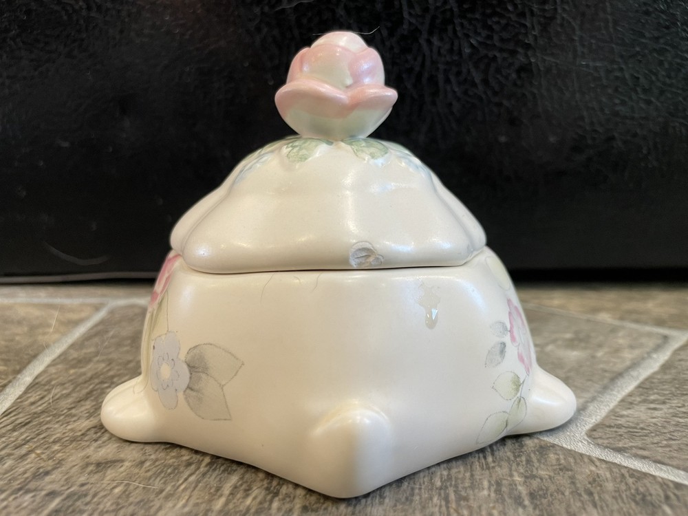 This is a Pfaltzgraff Tea Rose turtle candle with lid. It is white with a pink, blue, and green floral design. It measures 5 1/4" x 4" and is 3" tall. Very nice. There is a small chip on the back of the lid near the rim. 257K