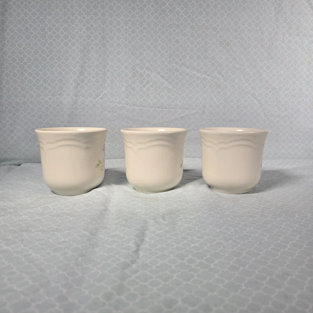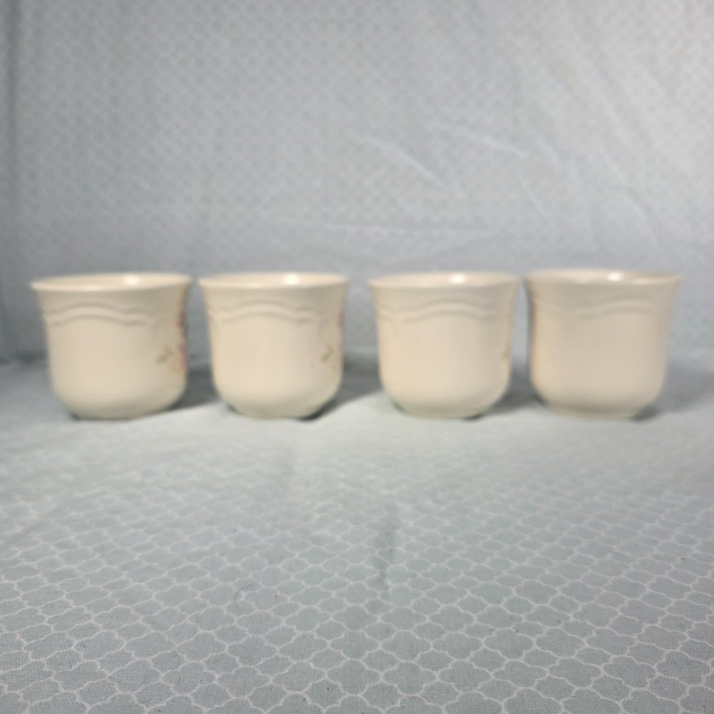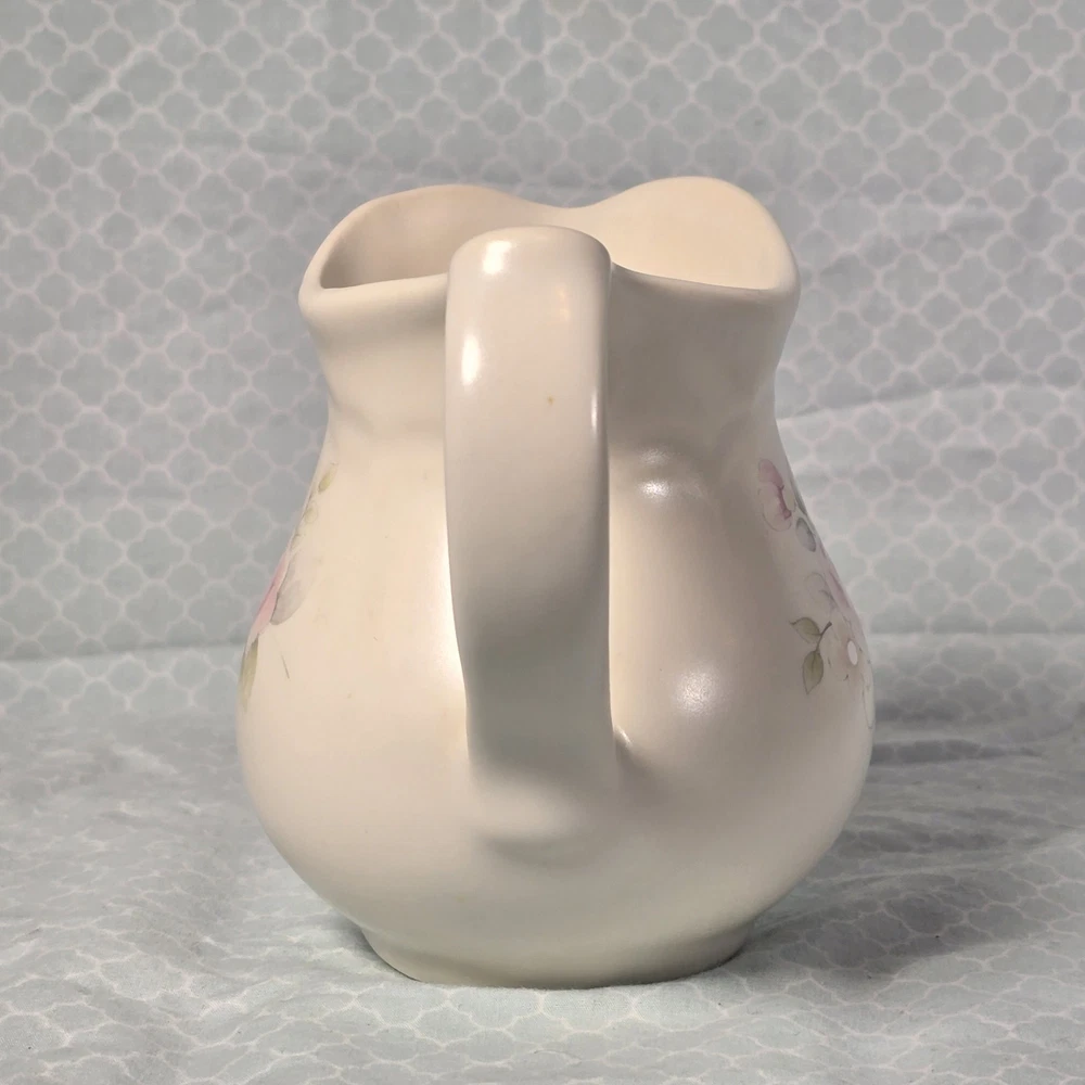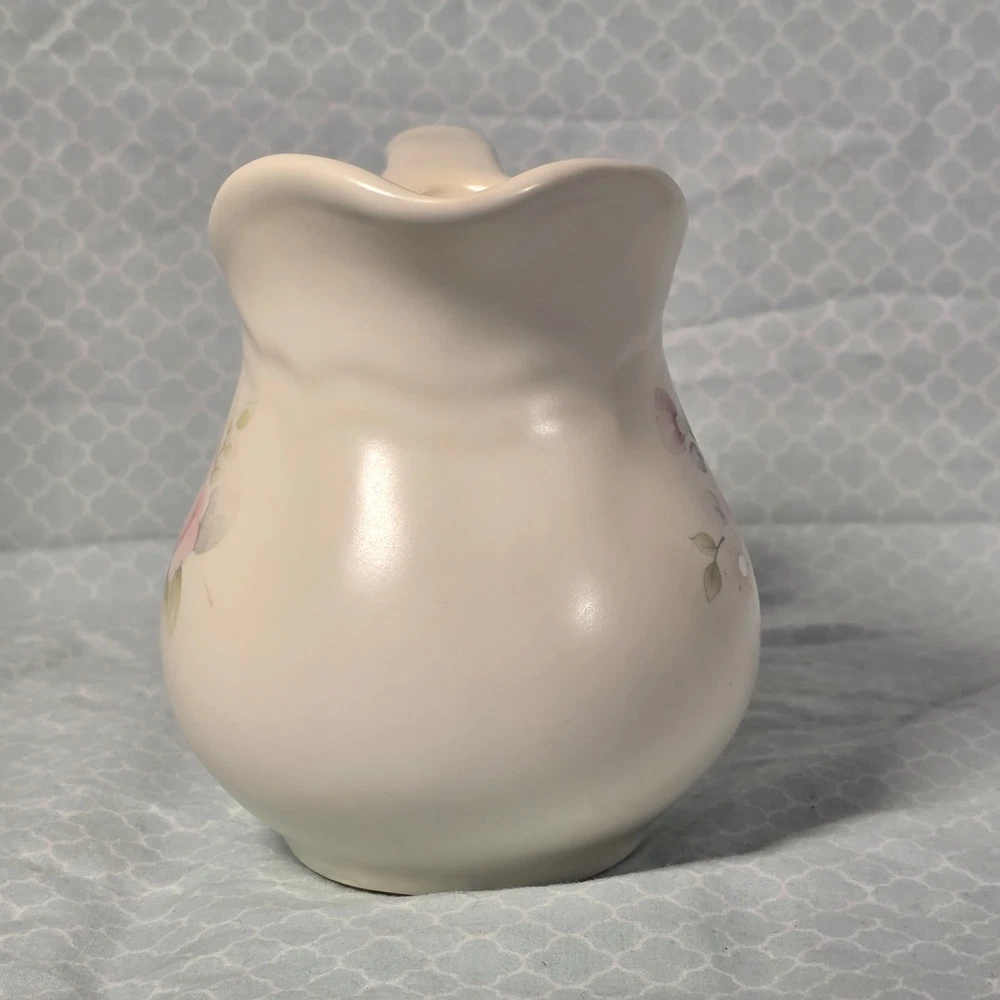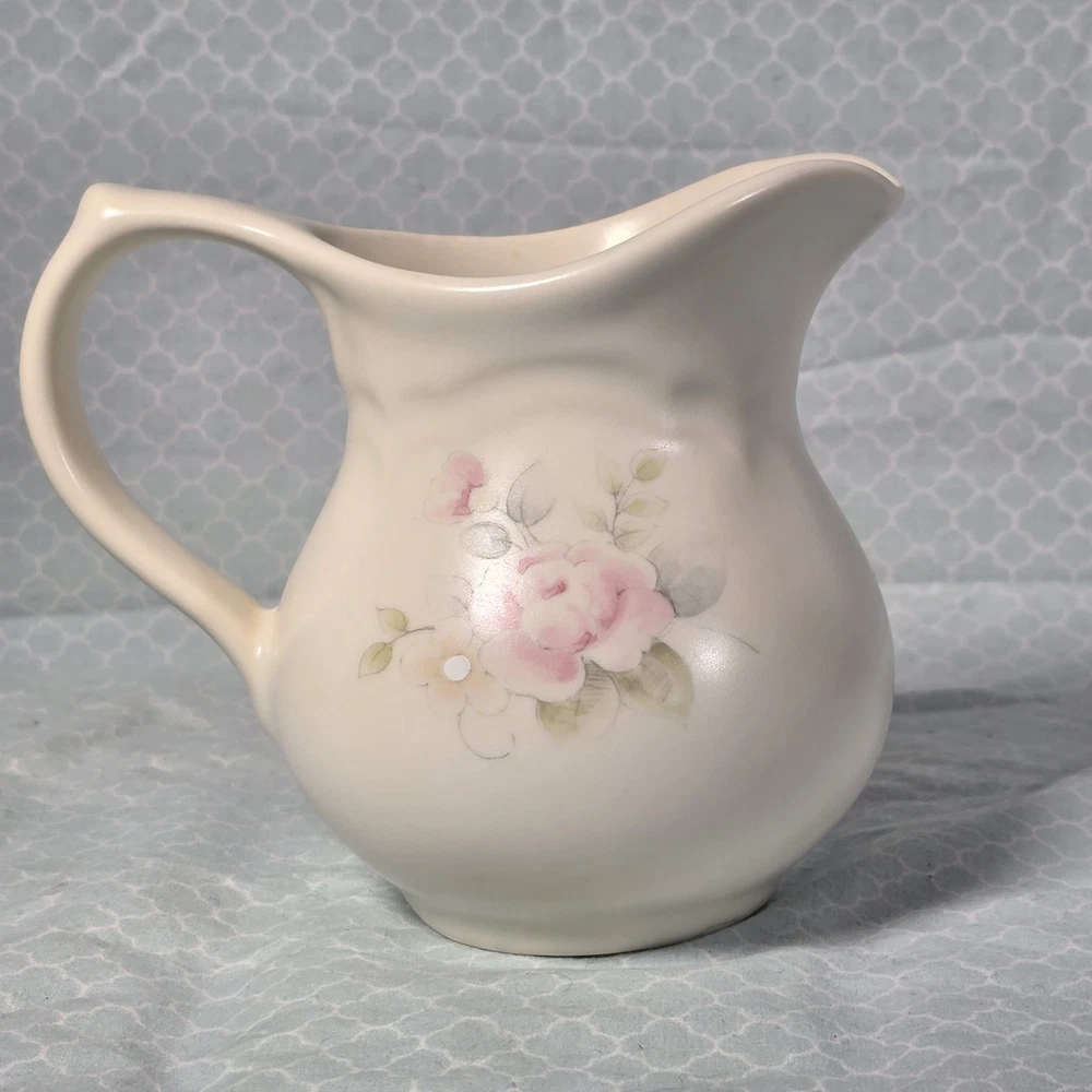 The Pfaltzgraff Tea Rose eight-piece set includes seven mugs and a creamer, all made of pink flower-patterned stoneware. This original United States-made collection features a round shape with handles, ideal for serving hot beverages. The Tea Rose design adds a floral touch to your table setting. See photos for exact condition. There is a small crack on the handle of one of the mugs. It is pictured. No other flaws are present.