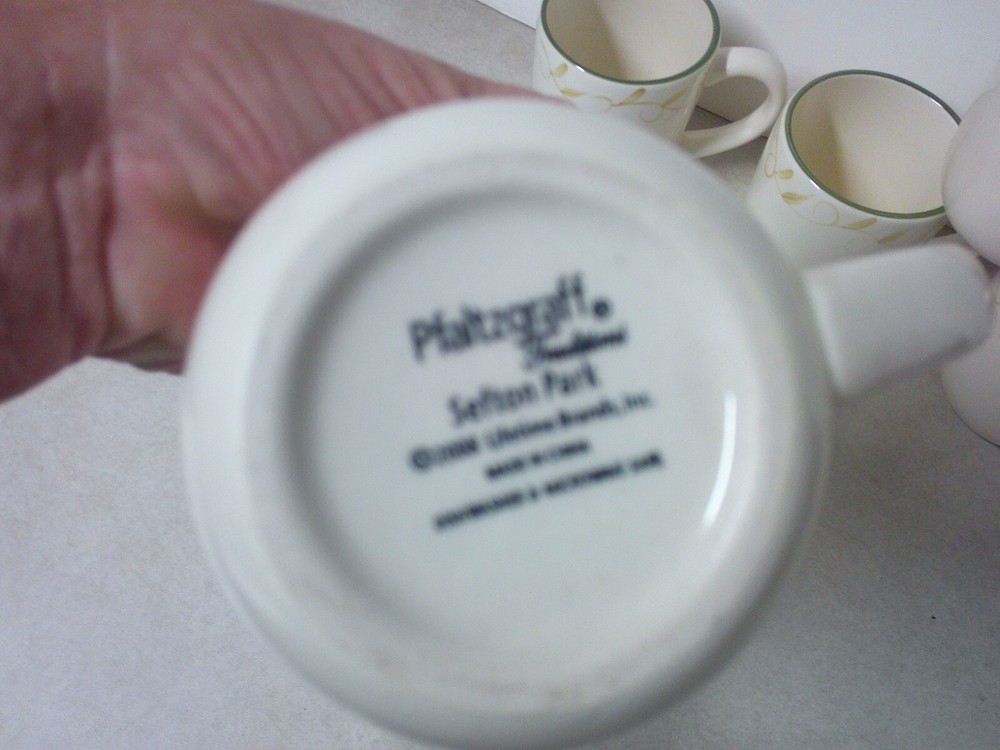 x5 Pfaltzgraff Traditions Sefton Park Green Trim Leaf & Vine Ceramic Coffee Mugs Pre-owned condition. Shows light use. No chips, cracks or crazing to the glaze. Measures 4" tall. Holds 12 fl oz. lot of 5 FREE SHIPPING! ***************************** PLEASE READ : I buy mostly estates, close outs, shelf pulls, and auction items. As the history of the item is not always known. I will describe all of my items listed to the best of my ability, if there are any flaws to the item it will be noted in the listing and photos of the flaw shown. At times I may miss a flaw, as I am only human. Please contact me and I will make it right and make sure that you are happy with you interaction and purchase from Big Man Tim's Treasures. Please see all photos and ask any qu estions BEFORE purchasing. Love this item? Check out the other items in my Ebay store! Please check back on a regular basis, as we list new items daily!! 060225EP warehouse