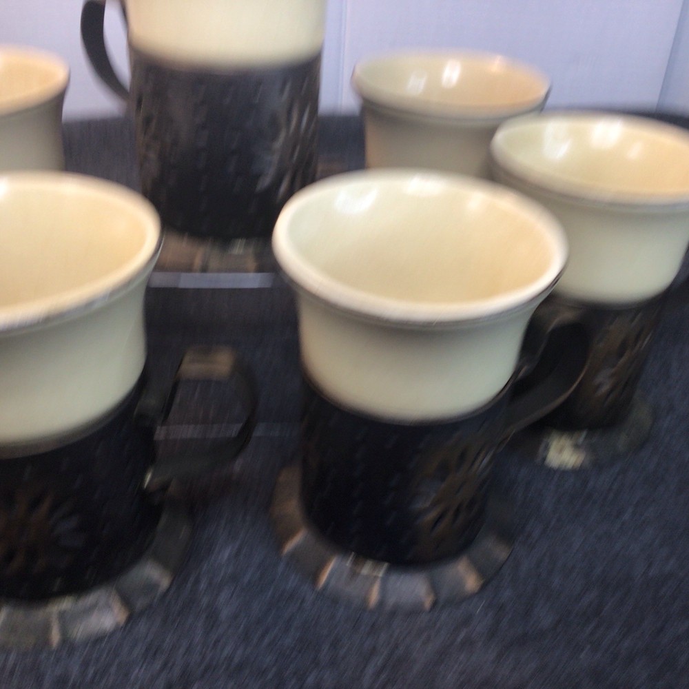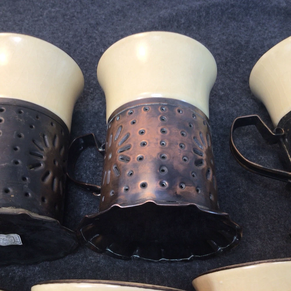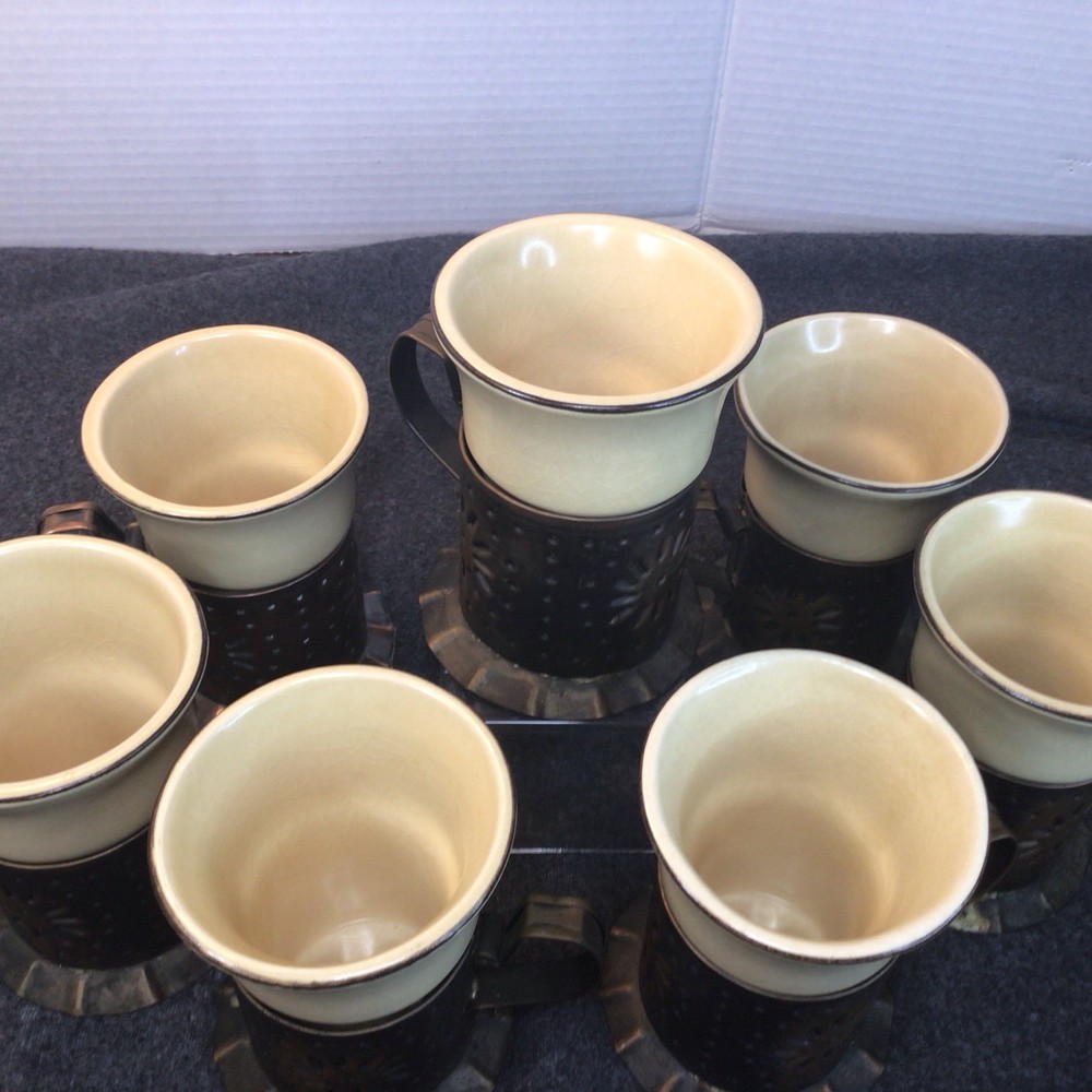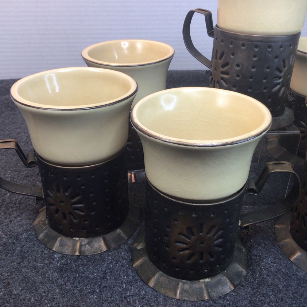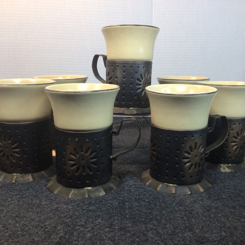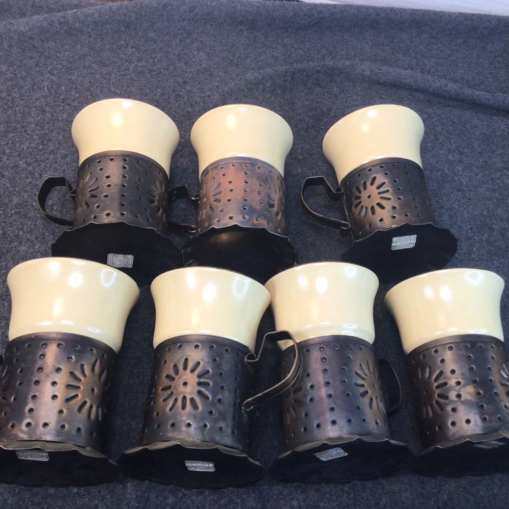 The product is a set of 7 copper Pfaltzgraff Village cup and holders, made of Americana stoneware. These vintage mugs feature a beige color and charming Village pattern, perfect for all occasions. Each item is an original piece from the United States, adding a touch of Americana to your table setting or kitchen decor. Ideal for collectors or those looking for a unique addition to their pottery and glass collection. Nice set, don’t believe that they have ever been used. Please look at the pictures closely, as these are the items that you will receive.