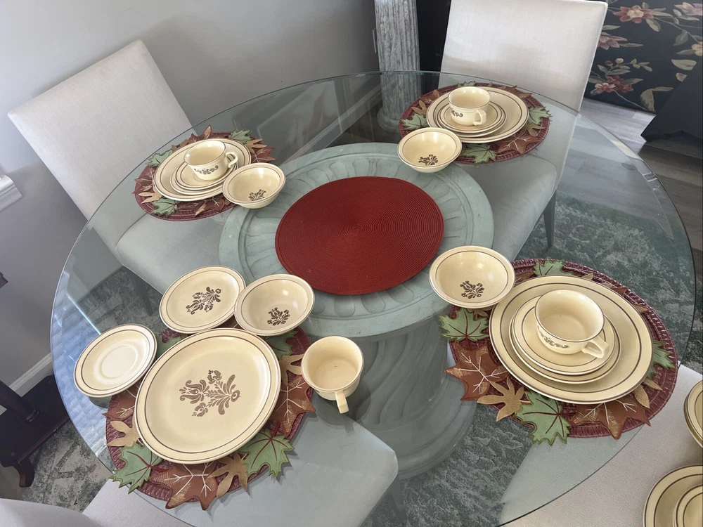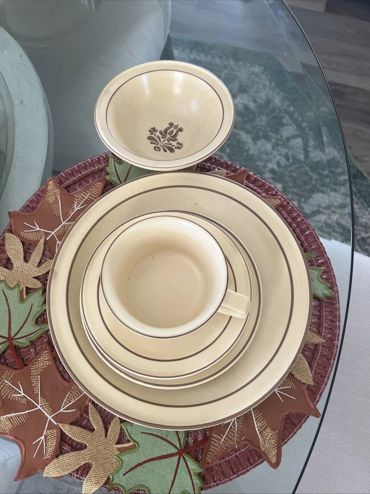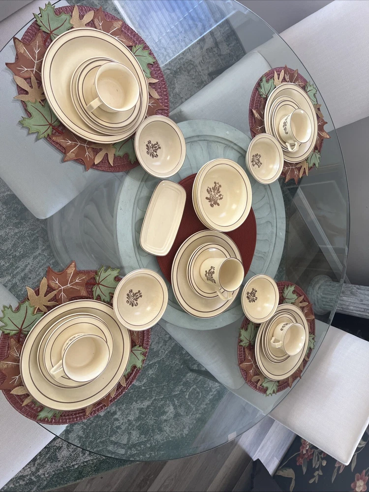 The Pfaltzgraff Village Dinnerware set includes 31 pieces in total, featuring a vintage design in beige stoneware. The set consists of 4 full place settings and additional plates. Perfect for serving meals or desserts, this charming set is a classic addition to any dining table. Look at the pictures and ask questions before making your purchase
