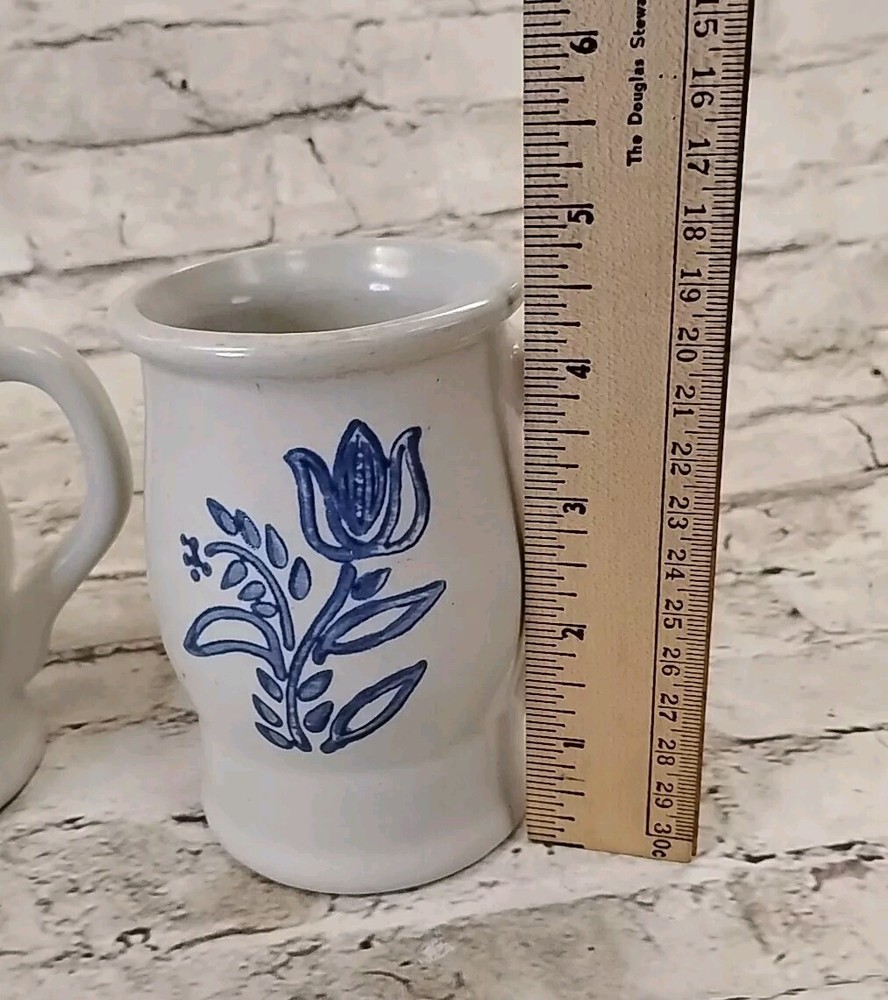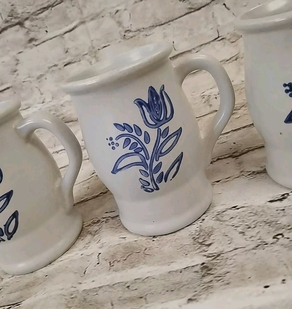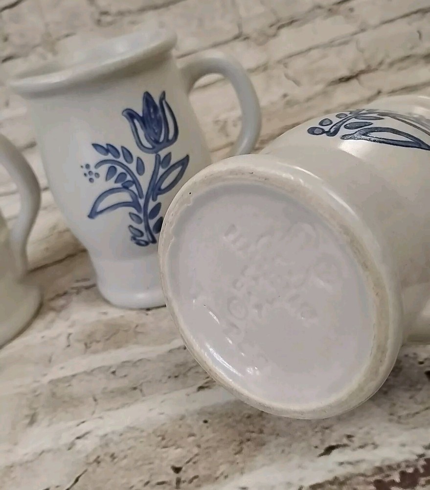 Add a touch of vintage charm to your morning coffee routine with this set of three Pfaltzgraff Yorktowne coffee mugs. The round mugs feature a beautiful blue and gray stoneware material with an impressed backstamp. This original set is perfect for collectors or those who appreciate unique and stylish dinnerware. The mugs are part of the Castle Stamped Set and are made in the United States. Sip your coffee in style with these one-of-a-kind mugs.
