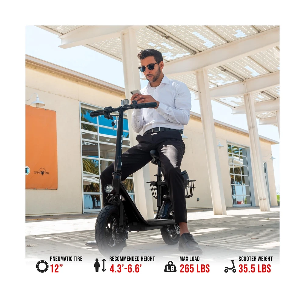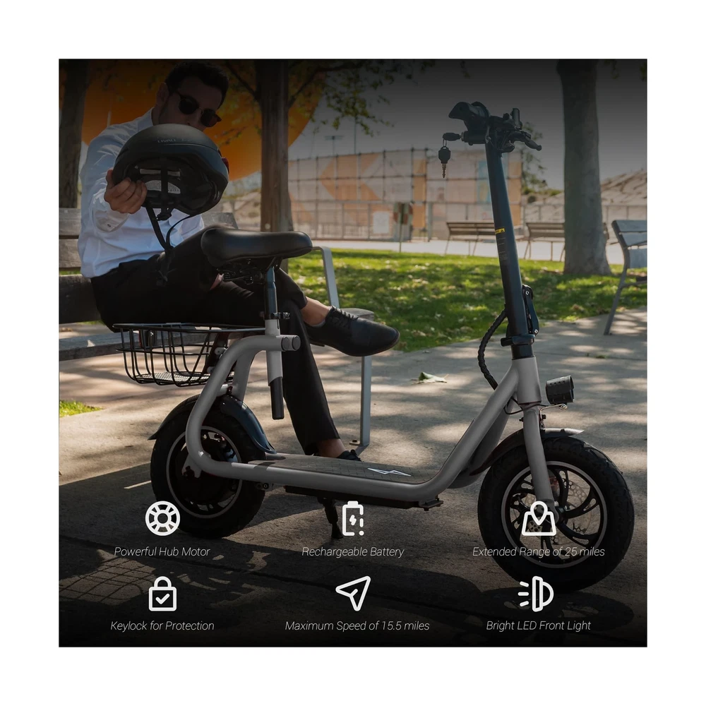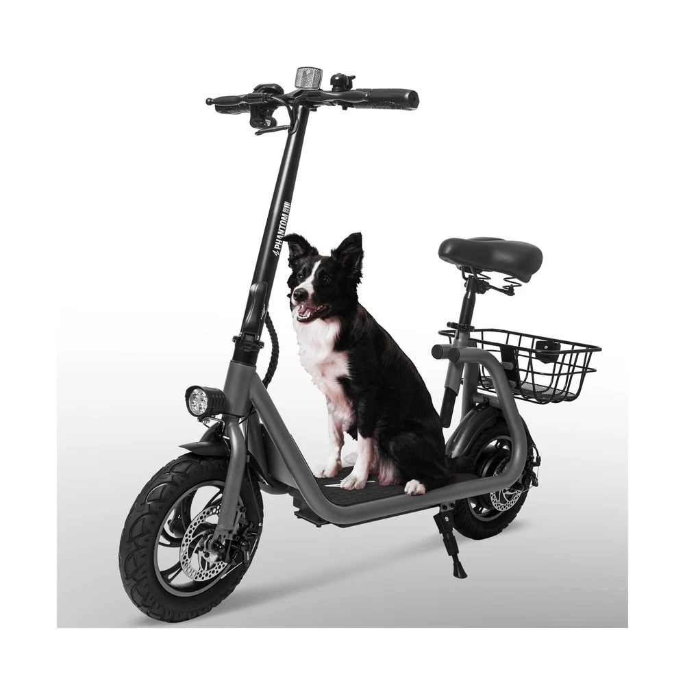 Phantomgogo Commuter R1 - Electric Scooter for Adults - Foldable Scooter with Seat & Carry Basket - 450W Brushless Motor 36V - 15MPH 265lbs Max Load E Mopeds for Adults Description Features: MOTORIZED SCOOTER: 450W Brushless electric motor scooter with 20-mile range and max speed of 15.5 mph ELECTRIC SCOOTER ACCESSORIES: E Scooter with 13 x 11 inch rear carry basket and scooter deck, front LED light and rear reflectors for safety, comes with toolkit BATTERY CAPACITY: 36V 8.0Ah lithium-ion battery with intelligent overload and low voltage protection, charging time: 4 hours, with battery power display SAFETY FIRST: Recommended scooters for teens 12 years and up with an aluminum alloy frame, steel rigid fork, rear disc-brakes, 12" tires for multi terrain use, reflective rear reflectors and front lamp LIGHTWEIGHT: weight: 37.5 lbs, maximum carrying load of 265 lbs. Box dimensions: 48.5 x 10.2 x 22.8 inches ONE-YEAR WARRANTY: Components such as battery, battery controller, ringer bell, and LED light are covered with a one-year warranty, they can be self-installed or replaced easily. Please contact us to inquire about the replacement part under warranty. Product Details: Brand: Phantomgogo Color: Grey Age Range (Description): Youth Special Feature: foldable Weight Limit: 265 Pounds Product Dimensions: 48.5"L x 19"W x 41.3"H Number of Wheels: 2 Model Name: Commuter R1 Wheel Material: Rubber Frame Material: Aluminum Brand: ‎Phantomgogo Color: ‎Grey Age Range (Description): ‎Youth Special Feature: ‎foldable Weight Limit: ‎265 Pounds Product Dimensions: ‎48.5"L x 19"W x 41.3"H Number of Wheels: ‎2 Model Name: ‎Commuter R1 Wheel Material: ‎Rubber Frame Material: ‎Aluminum Item Weight: ‎37.5 Pounds Handle Height: ‎22.8 Inches Wheel Size: ‎12 Inches Wheel Type: ‎Pneumatic Suspension Type: ‎Rigid Brake Style: ‎Front Braking Warranty Type: ‎Limited Charging Time: ‎4 Hours Recommended Uses For Product: ‎urban commuting Maximum Distance Range: ‎2E+1 Miles Manufacturer: ‎Zhejiang Dingtu Technology Co.,Ltd UPC: ‎850065260341 Global Trade Identification Number: ‎41 Item Package Dimensions L x W x H: ‎47.05 x 23.43 x 10 inches Package Weight: ‎22.25 Kilograms Item Dimensions LxWxH: ‎48.5 x 19 x 41.3 inches Brand Name: ‎Phantomgogo Warranty Description: ‎1 Year limited Warranty Material: ‎Alloy Steel Suggested Users: ‎unisex Included Components: ‎R1 Electric Scooter Date First Available: January 22, 2022 Delivery We Do Not Ship Outside of the Continental US. Return Policy All items qualify for returns within 30 days of receipt. Buyer is responsible for return shipping on any item that is not damaged. Feedback We take our reputation seriously, we buy and sell online, so we understand the value of trust. If you are unsatisfied with your order, please contact us and we will work with you to resolve it to your satisfaction.
