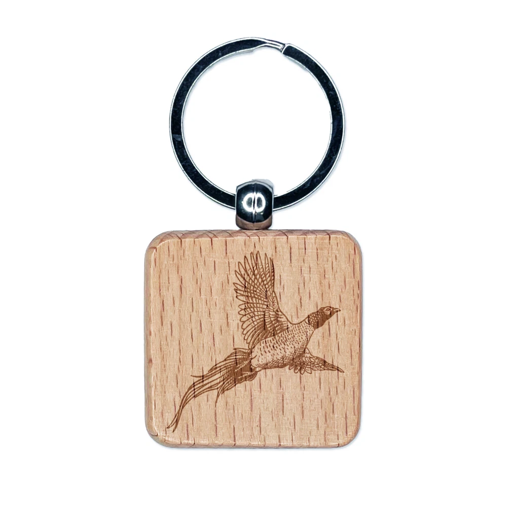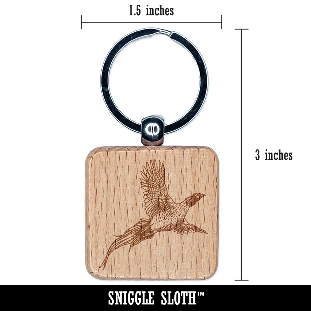 Pheasant Flying Engraved Wood Square Keychain Tag Charm
