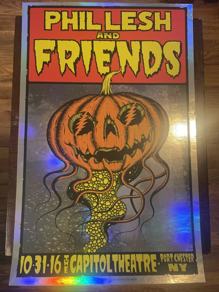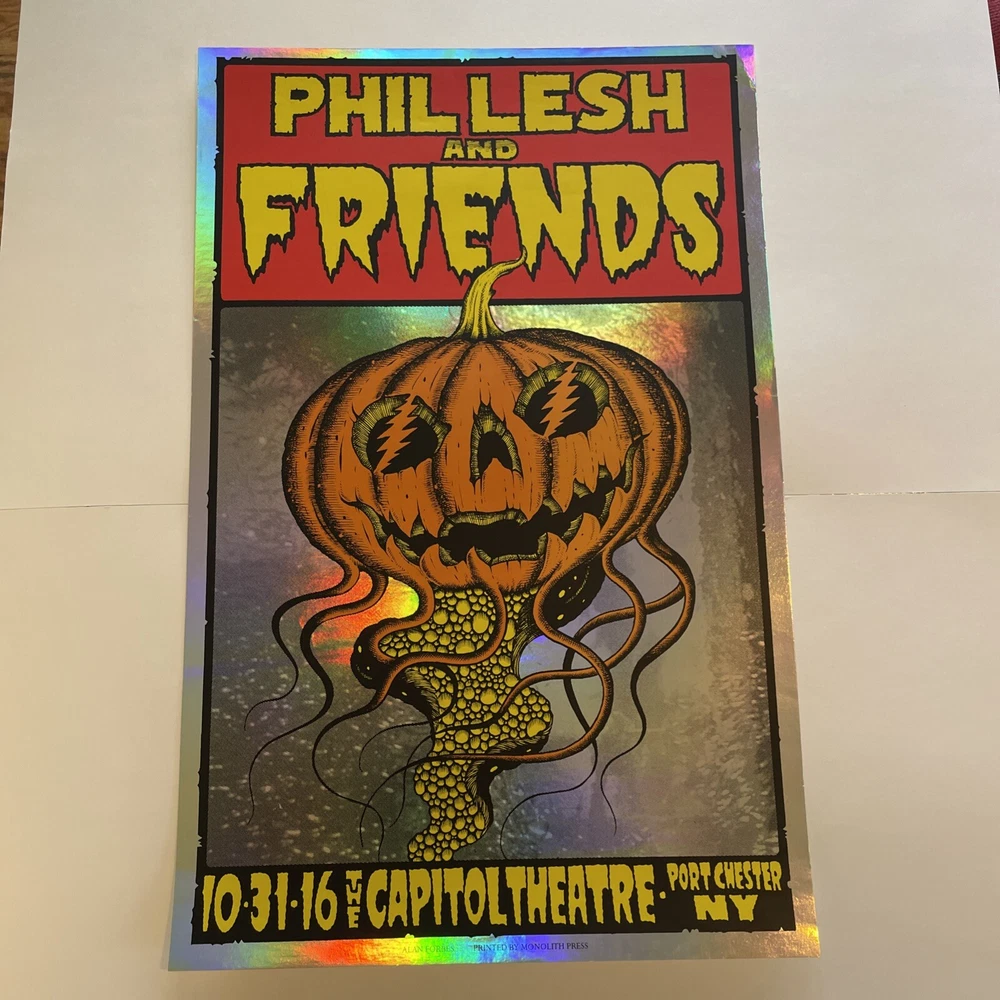 This is a rare and unique poster featuring Phil Lesh & Friends at the Capitol Theatre in New York on October 31st, 2016. The poster showcases the iconic artist and band Grateful Dead, and is a must-have for any music memorabilia collector. The design is vibrant and eye-catching, with bold colors and intricate details that capture the essence of the live performance. This item is perfect for fans of rock and pop music, and is a great addition to any collection of posters or entertainment memorabilia. Top right corner bent . Please look at the pictures for details