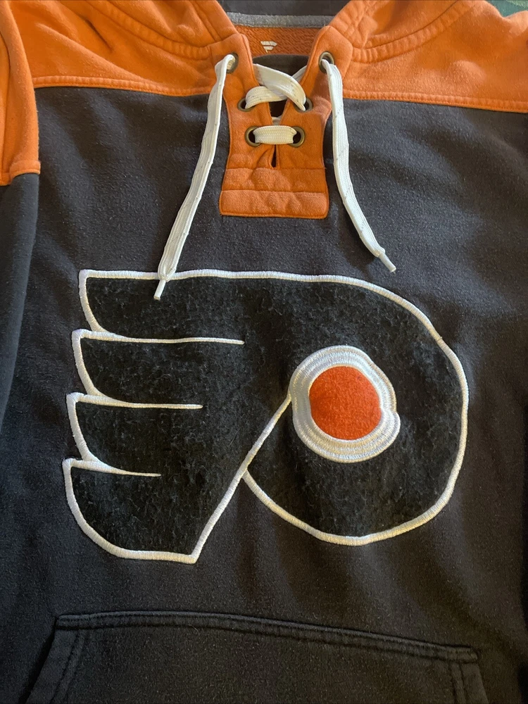 Show your love for the Philadelphia Flyers with this Fanatics hooded sweat shirt. This lace-neck sweatshirt is perfect for any NHL fan and features the team's logo prominently on the front. Made from high-quality materials, this shirt is comfortable and built to last. It's available in size L and is a great addition to any fan's collection. Whether you're cheering on the Flyers at the rink or just showing off your team spirit, this shirt is perfect for any occasion.