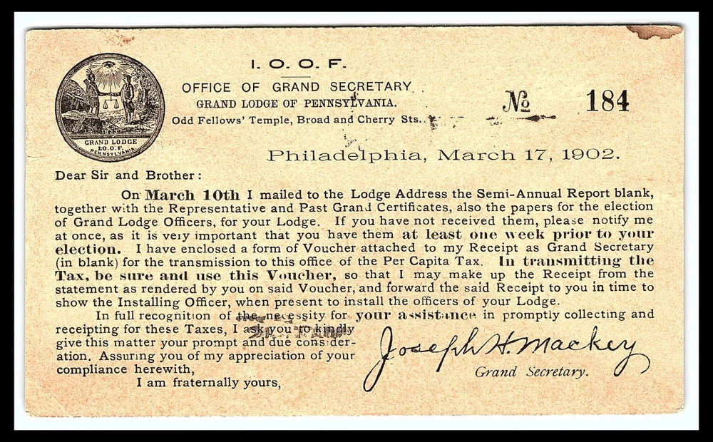 Philadelphia PA, Grand Lodge Election Voucher Prepaid Postcard, Posted 1902 Good Condition, Shows Wear, Yellowing pc369