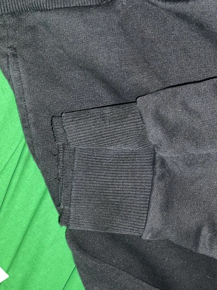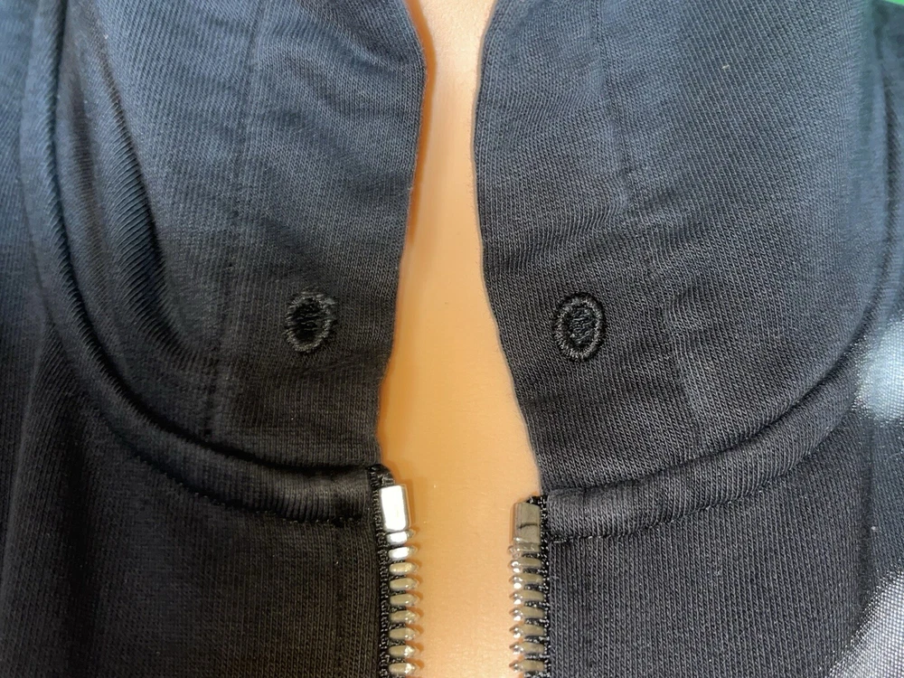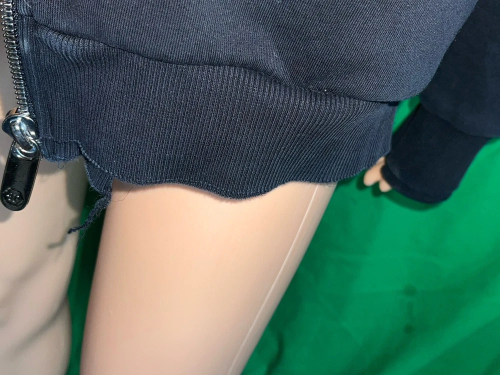 Has some distressing on the back. Missing a bottom piece from the zipper so it does not zip. Also missing the hoodie strings. Please see pictures for more details. Comes from a pet and smoke free home!! Please message me with any questions and thanks for looking!!