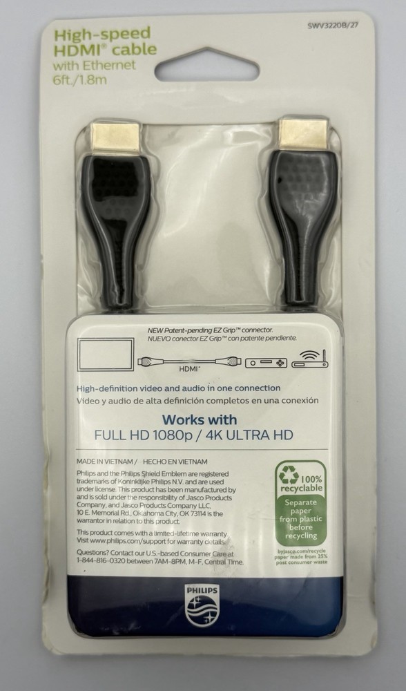 The Philips 6Ft/1.8m High-Speed HDMI Cable with Ethernet is a black cable designed for high-definition video and audio transmission. It capable of supporting HD 1080P and 4K Ultra HD resolutions. The cable is ideal for connecting various devices such as TVs, Blu-ray players, and gaming consoles for a seamless viewing experience. Its high-speed capabilities and long cable length ensure a reliable and efficient connection for all your entertainment needs.