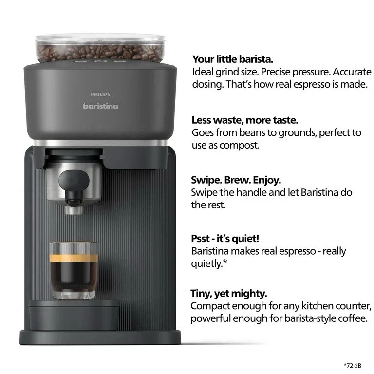 The Philips Baristina Espresso Machine Coffee Maker BAR300 in Black Barista is a sleek and powerful coffee maker that can make a variety of espresso-based beverages with its classic milk frother and 15 bar pressure. It features a 1.3L water tank capacity, 12 grind settings, and a programmable coffee strength selector for customizable coffee drinks. The machine also includes a built-in grinder, frother, water filter, and descale warning, making it easy to use and clean. With its matte finish and compact design, this espresso machine is a stylish addition to any kitchen for coffee lovers who prefer whole beans.